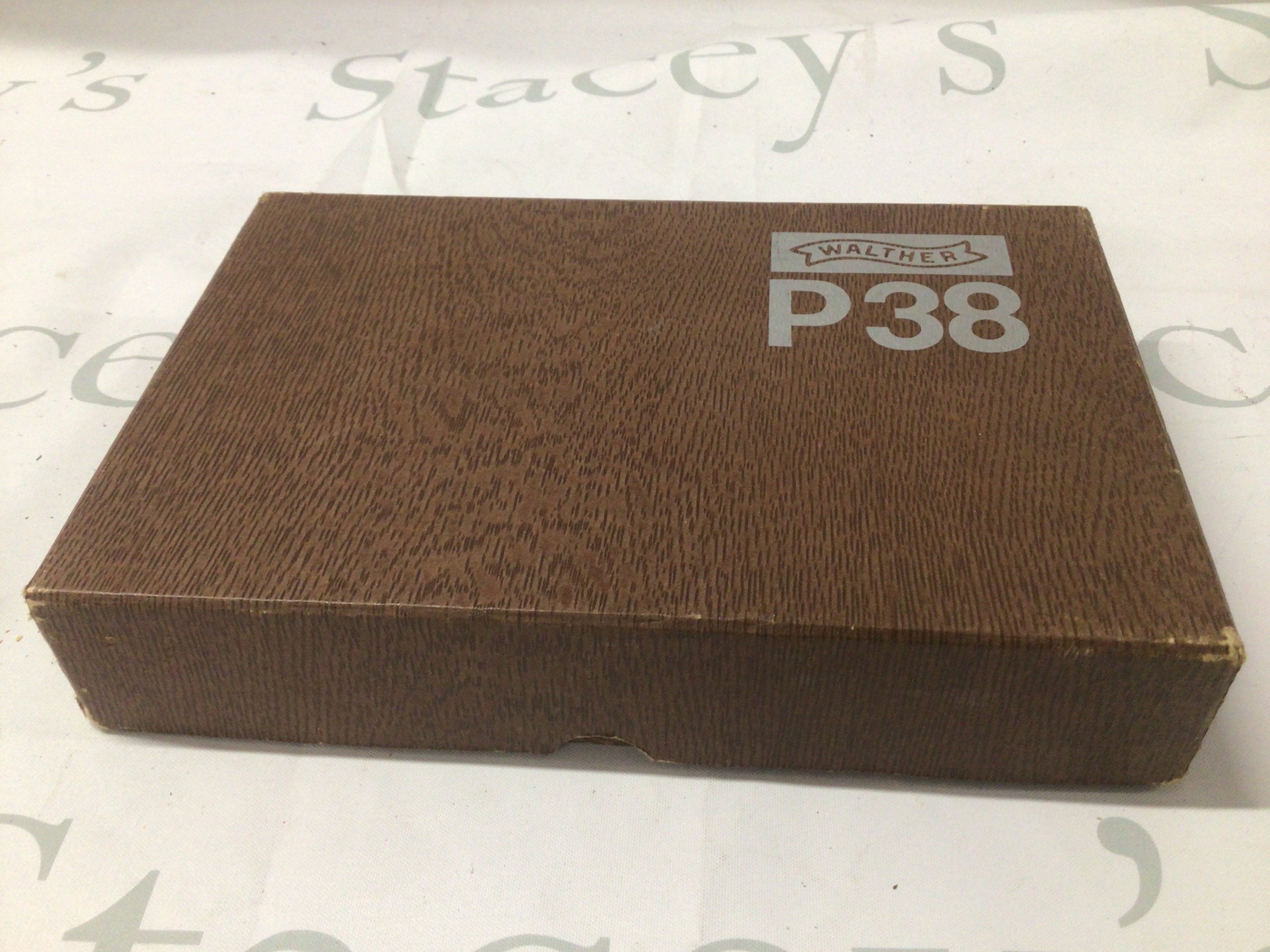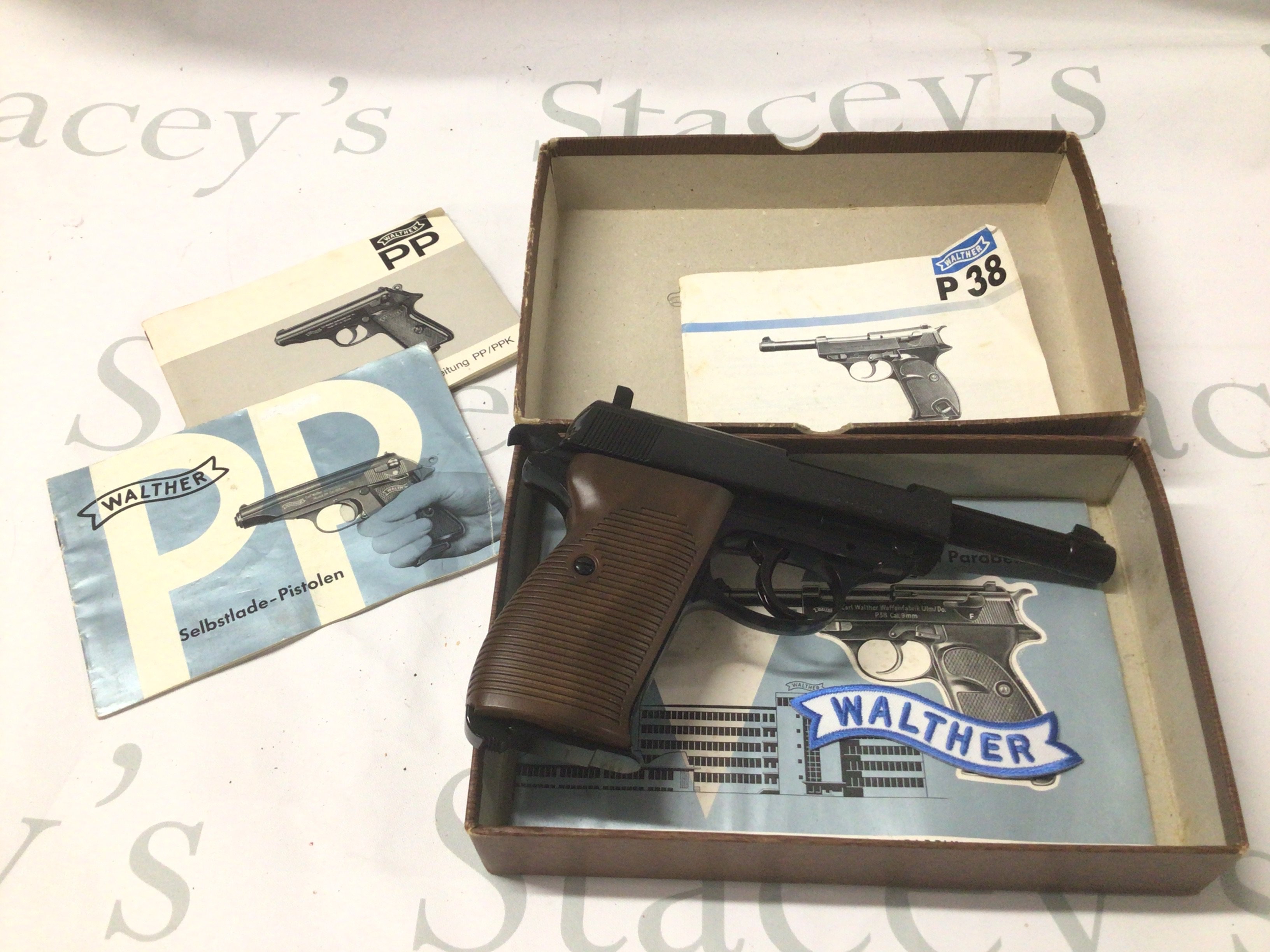 A Very good Example of a Replica Walther P38 9mm Pistol with original box and Carl Walther Waffenfabrik paperwork and cloth badge.