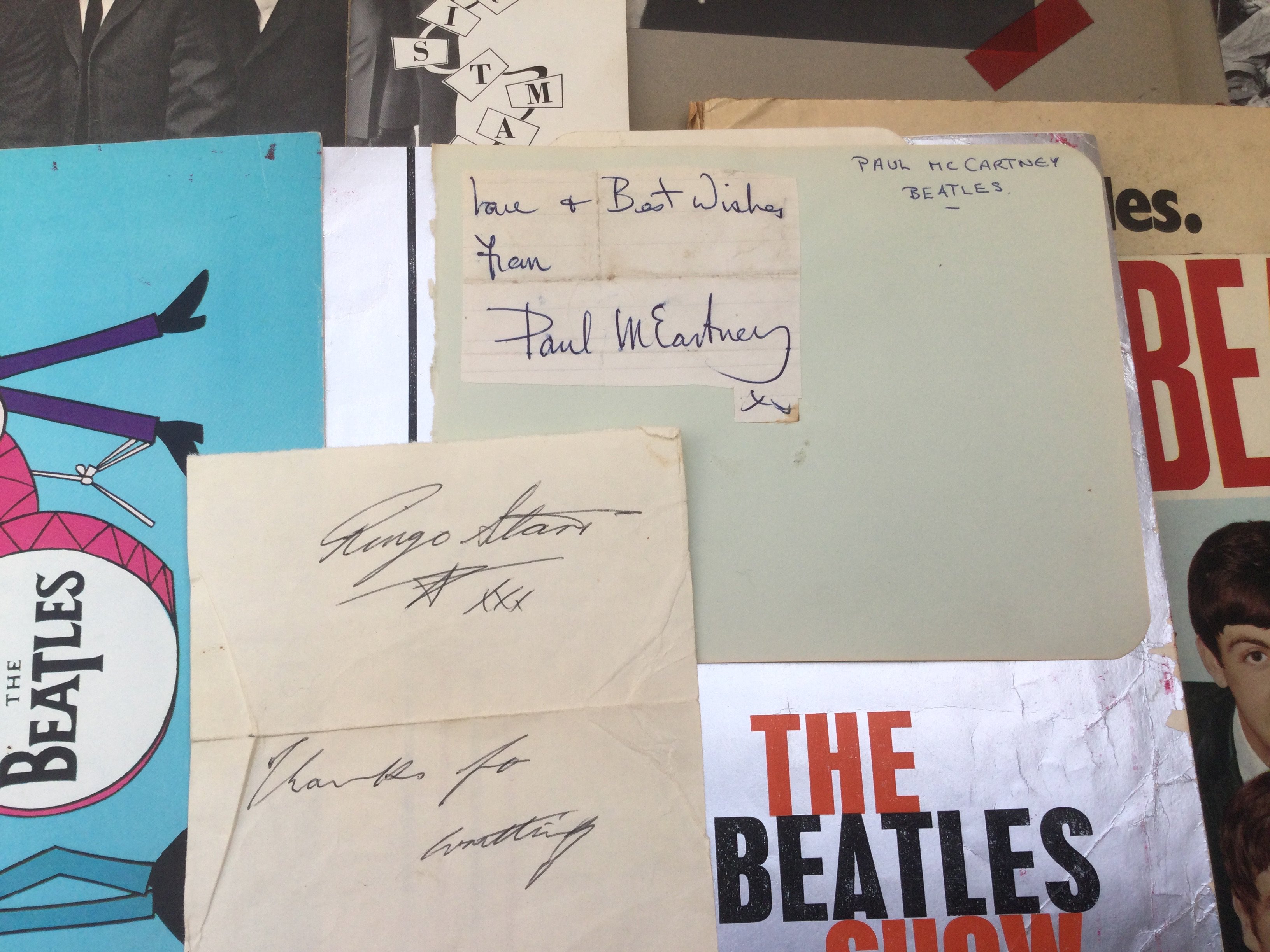 A collection of Beatles ephemera including Paul and Ringo's signatures, scrapbook, programs etc,