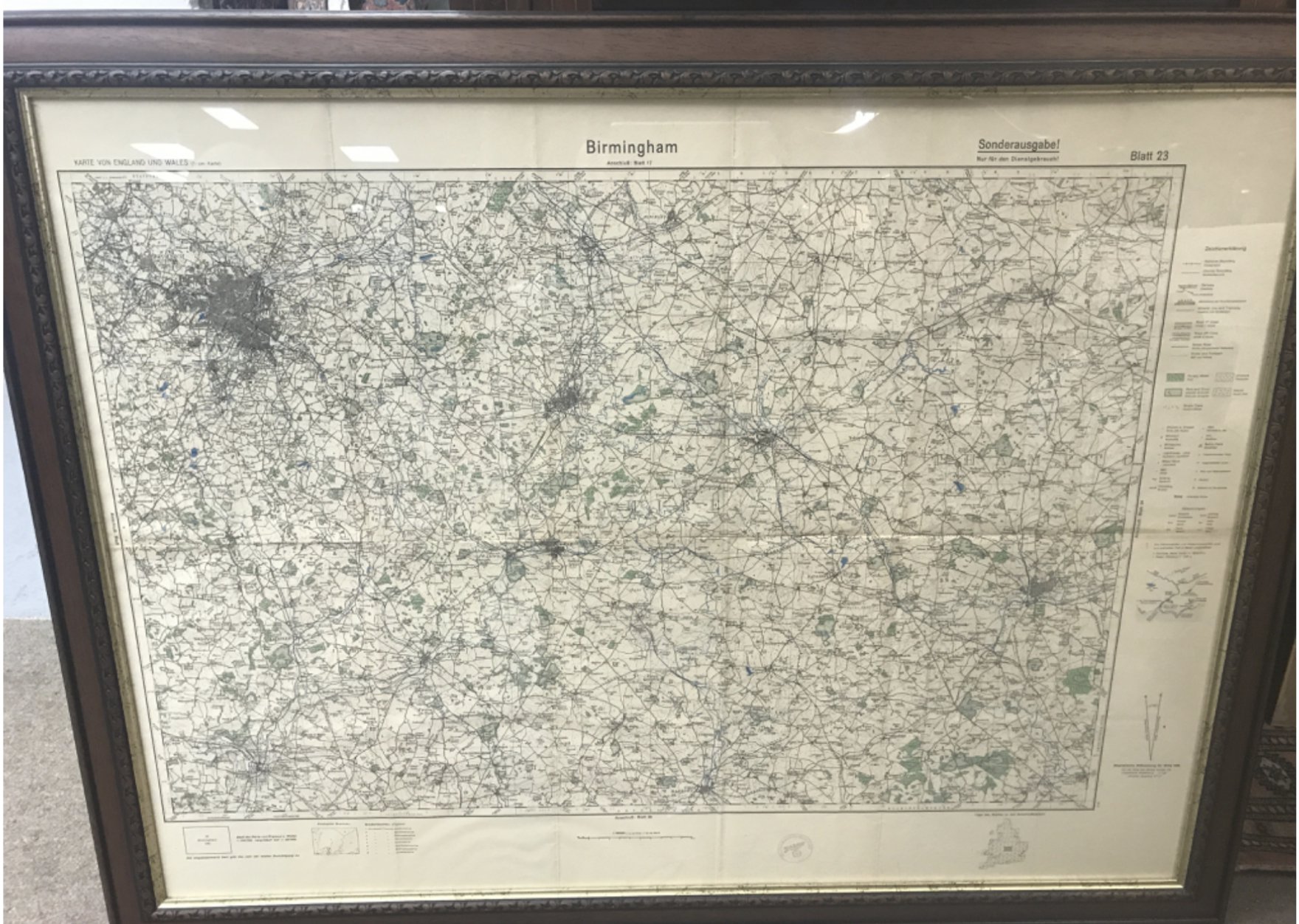 A WW2 German Bombers map of Birmingham. Frame dimensions 110x86cm