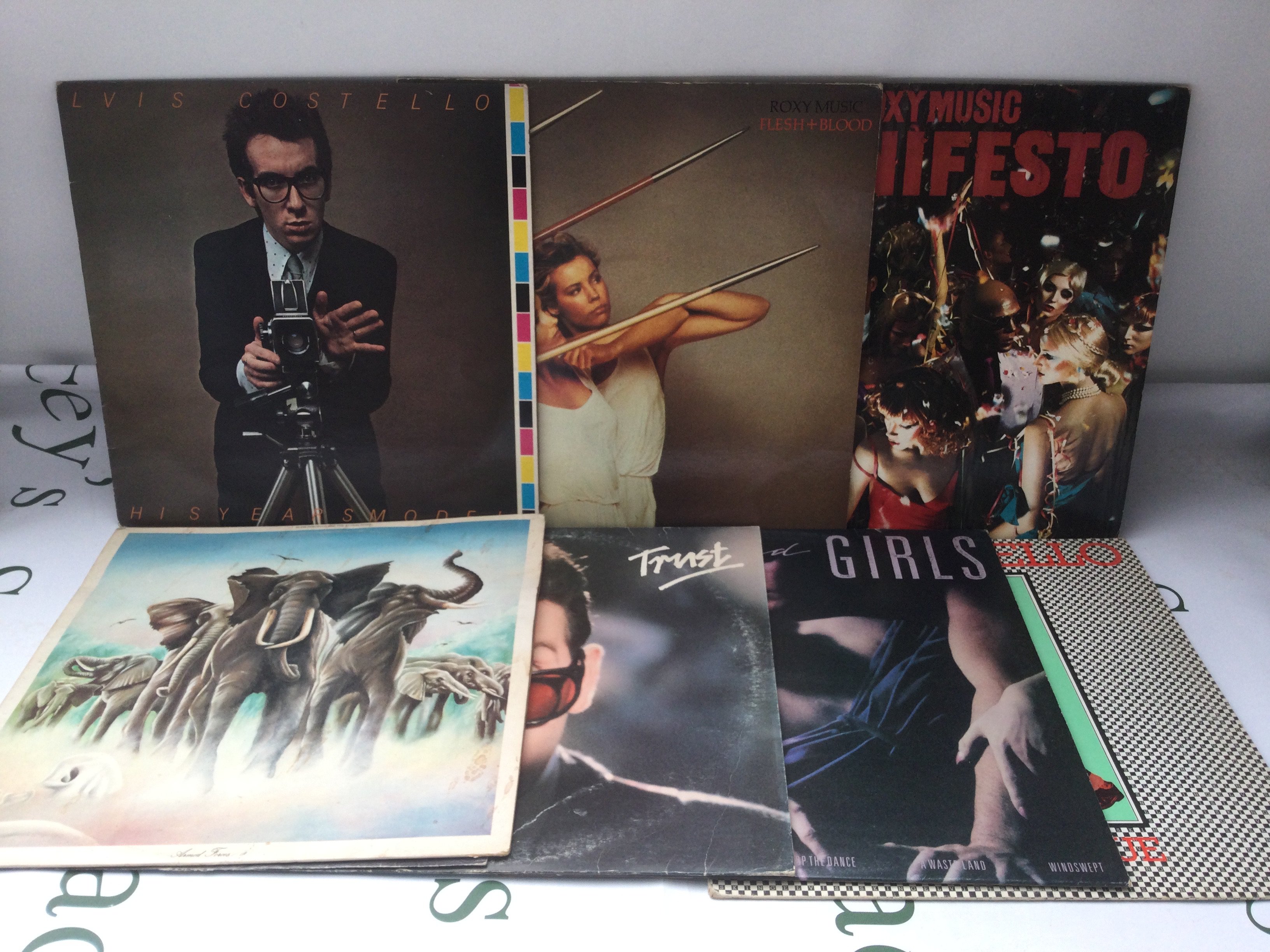 Fourteen rock and pop LPs by various artists including Roxy Music, Elvis Costello and others.