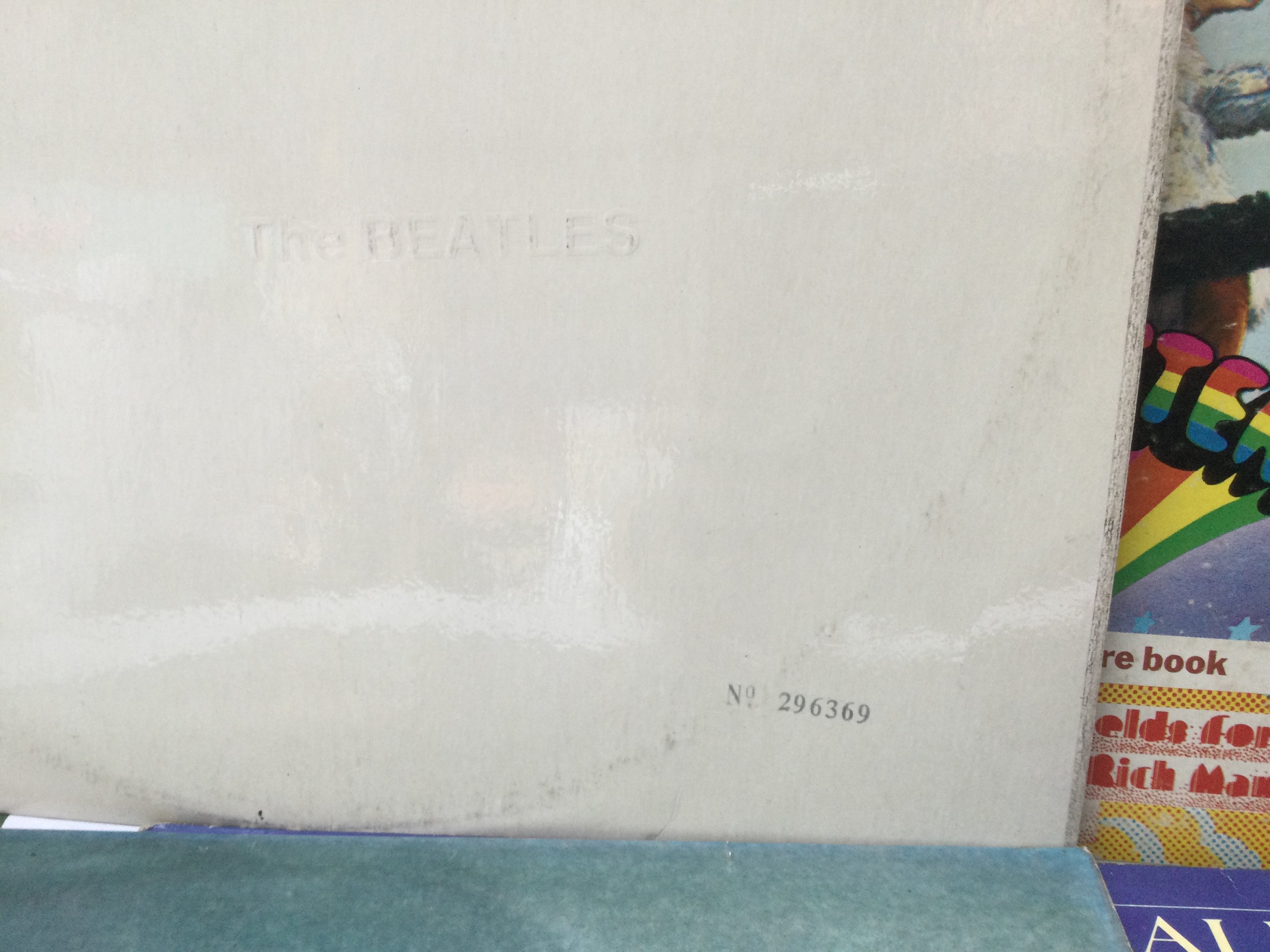 Two bags containing sixteen Beatles and related LPs and 12" singles including a side loading numbered White Album (no portraits), a US Capitol issued Magical Mystery Tour, Mind Games and others. Plus a Beatles book.