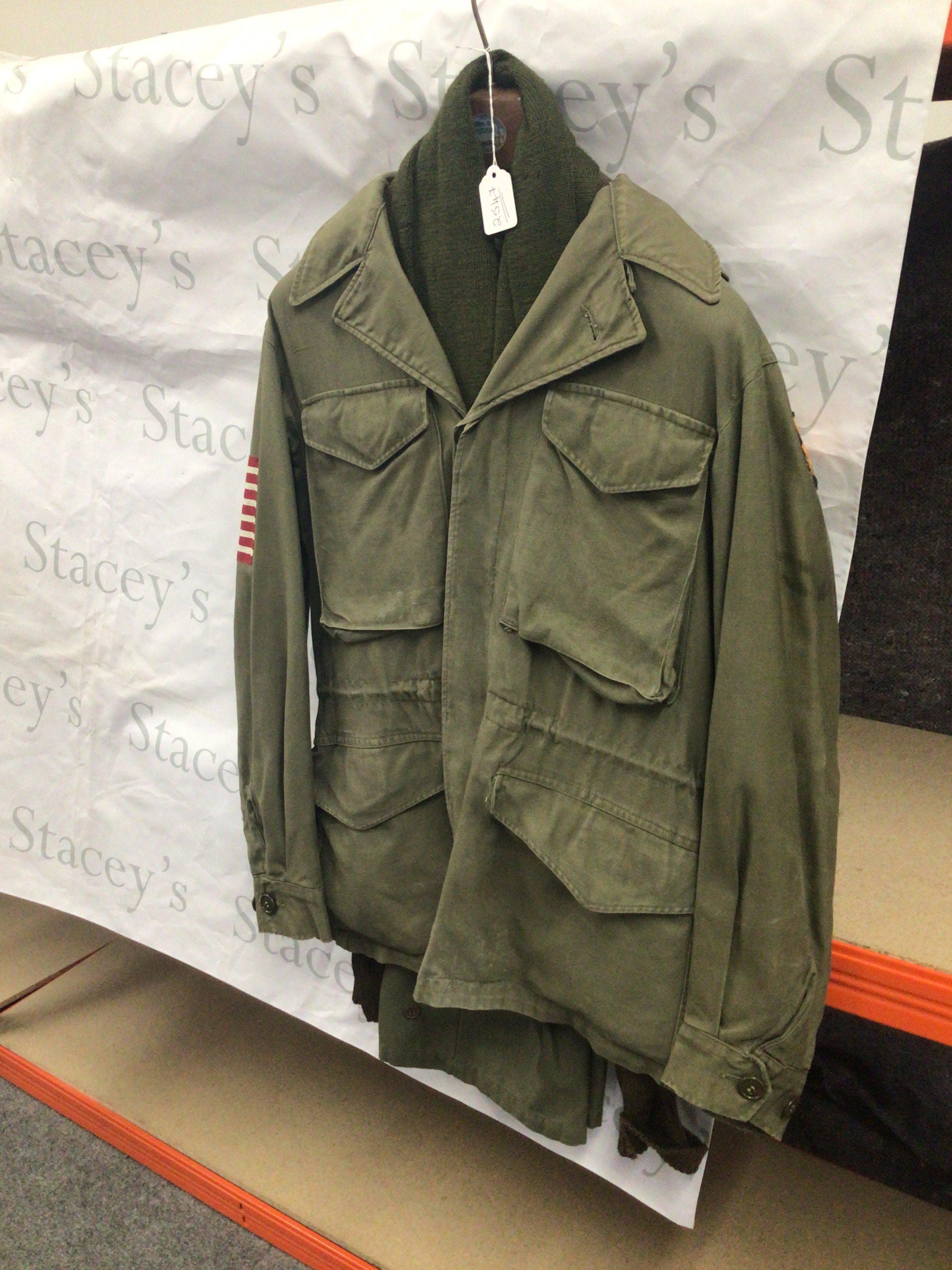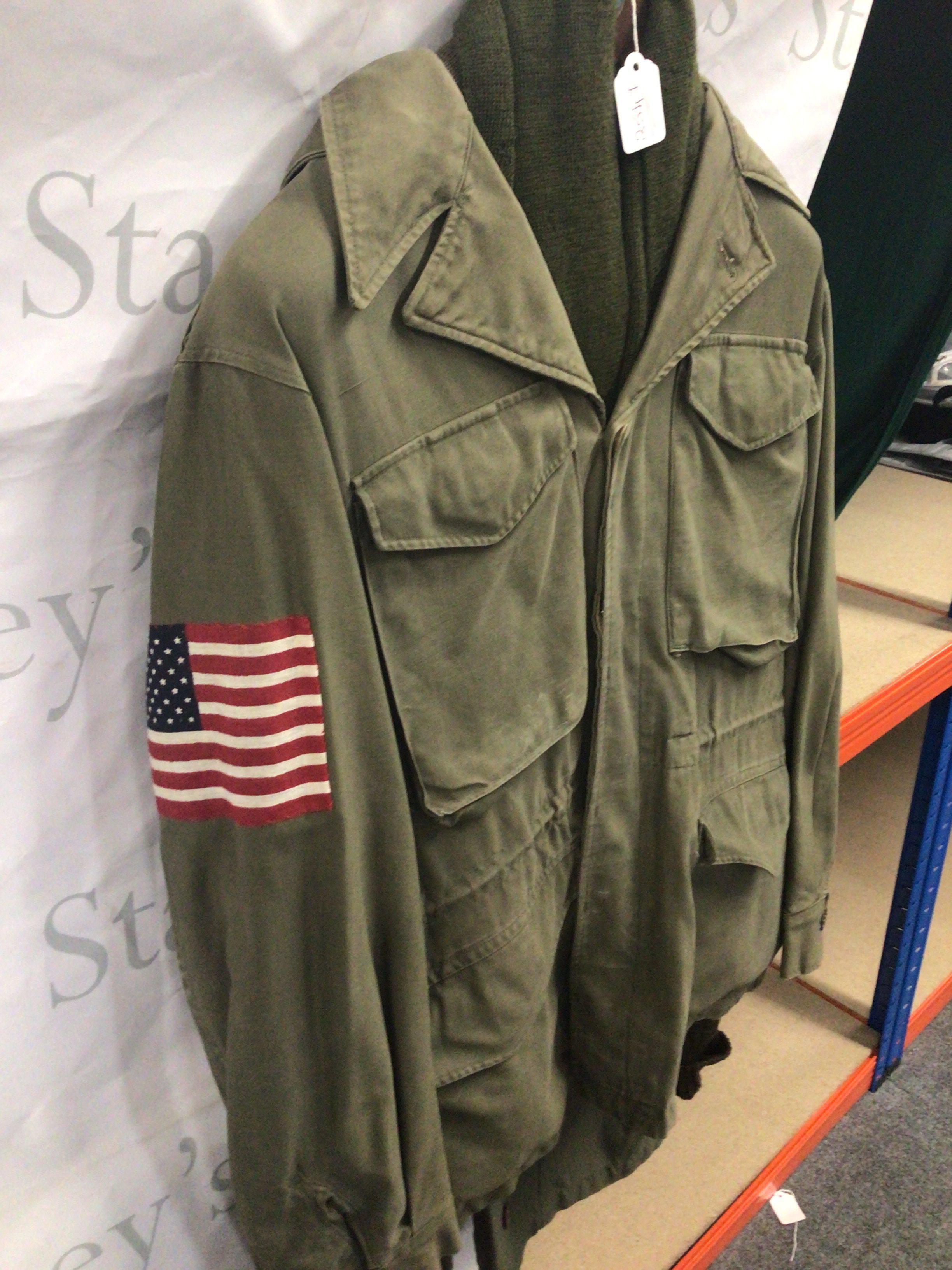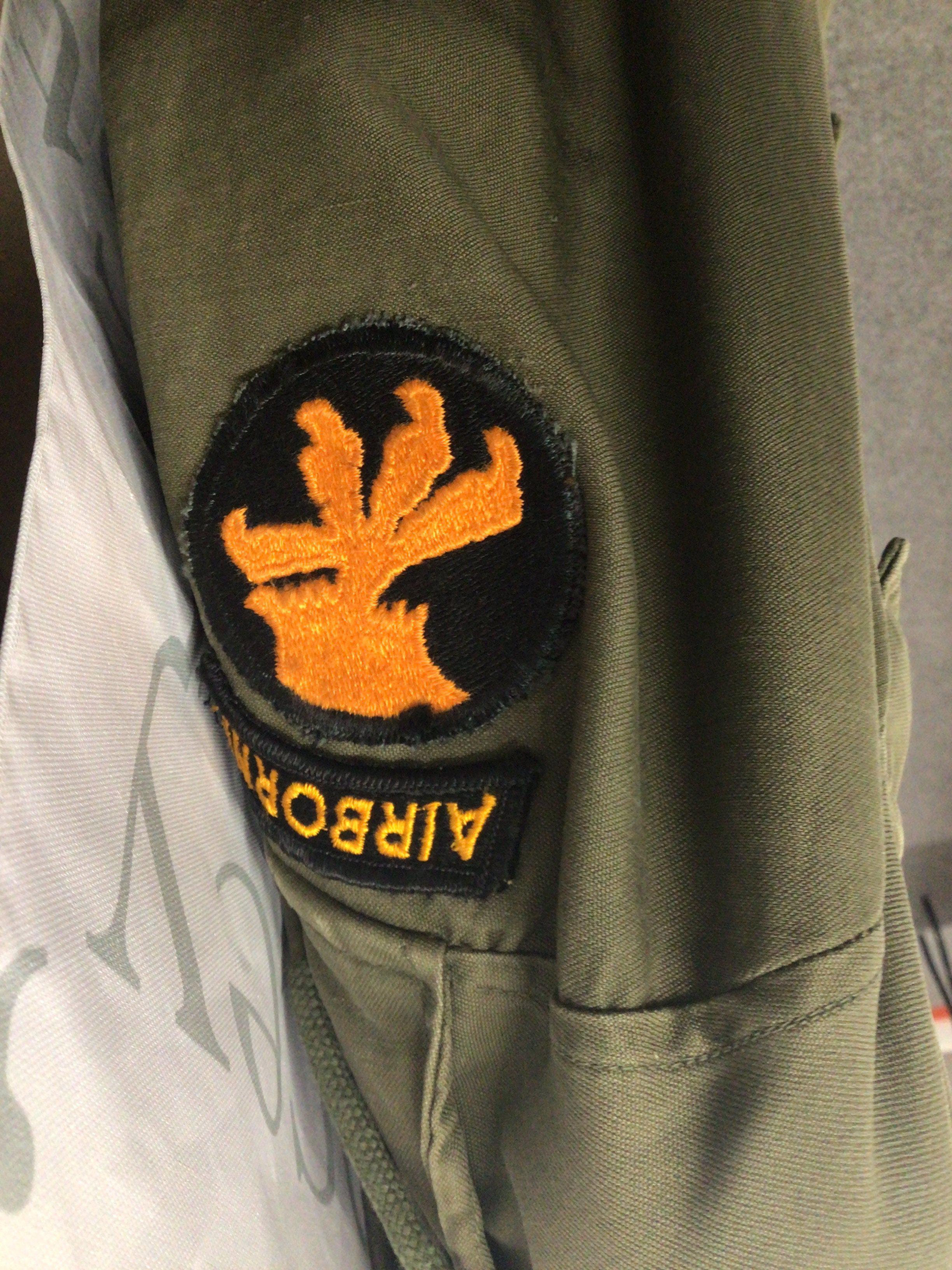 An American II world war field jacket and trousers 17th Airborne Division the jacket with American flag cloth badge and Airborne badge possible for 507th Division Parachute Infantry. Condition in keeping with battlefield use. An opportunity to buy American II world war Military History.