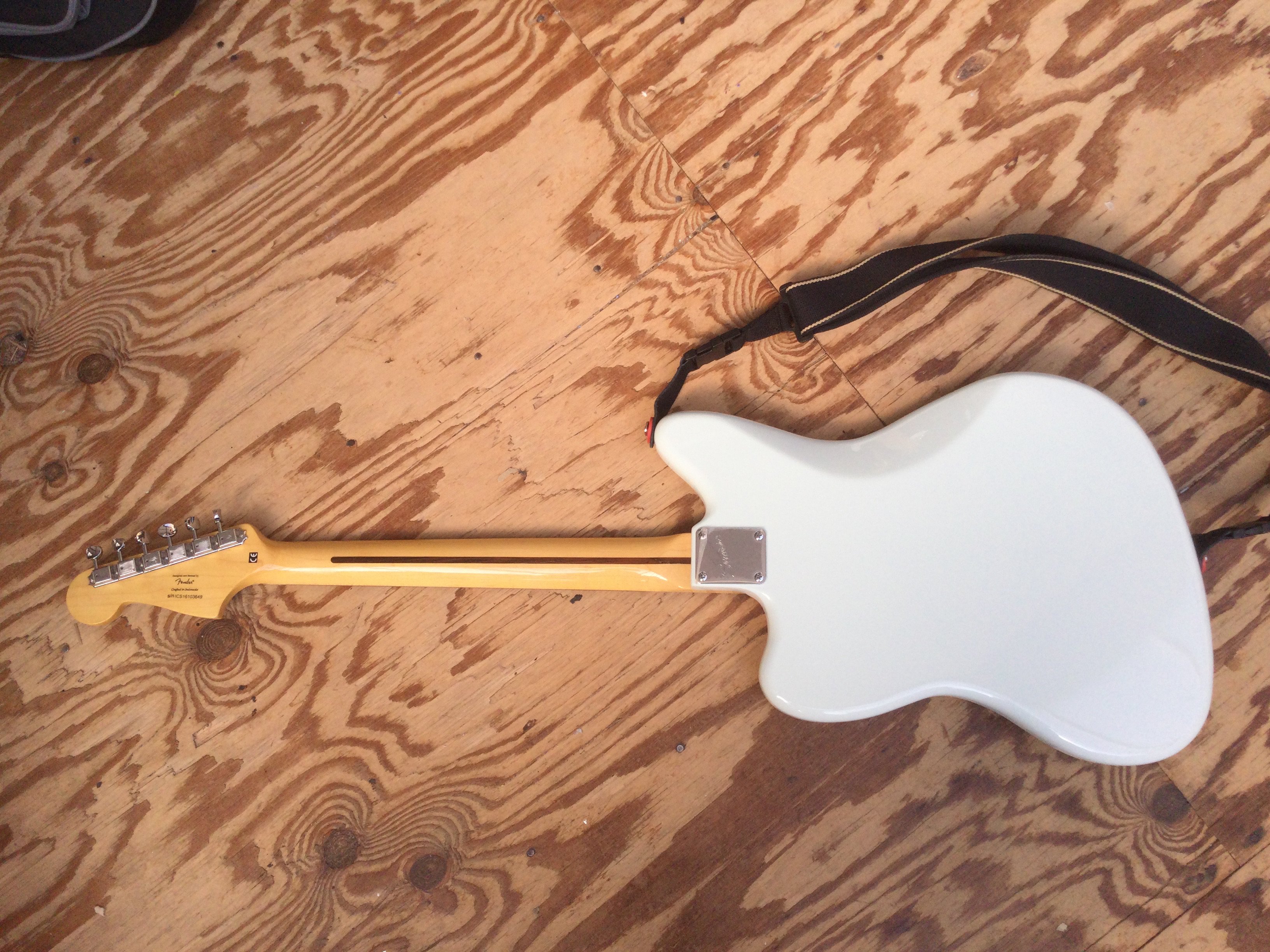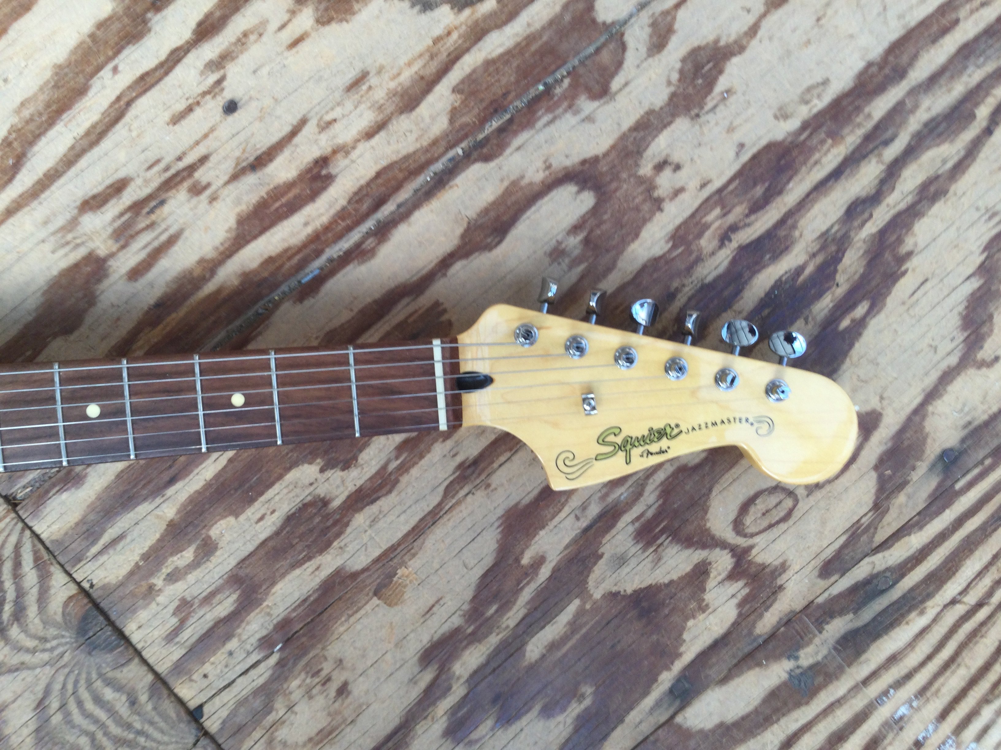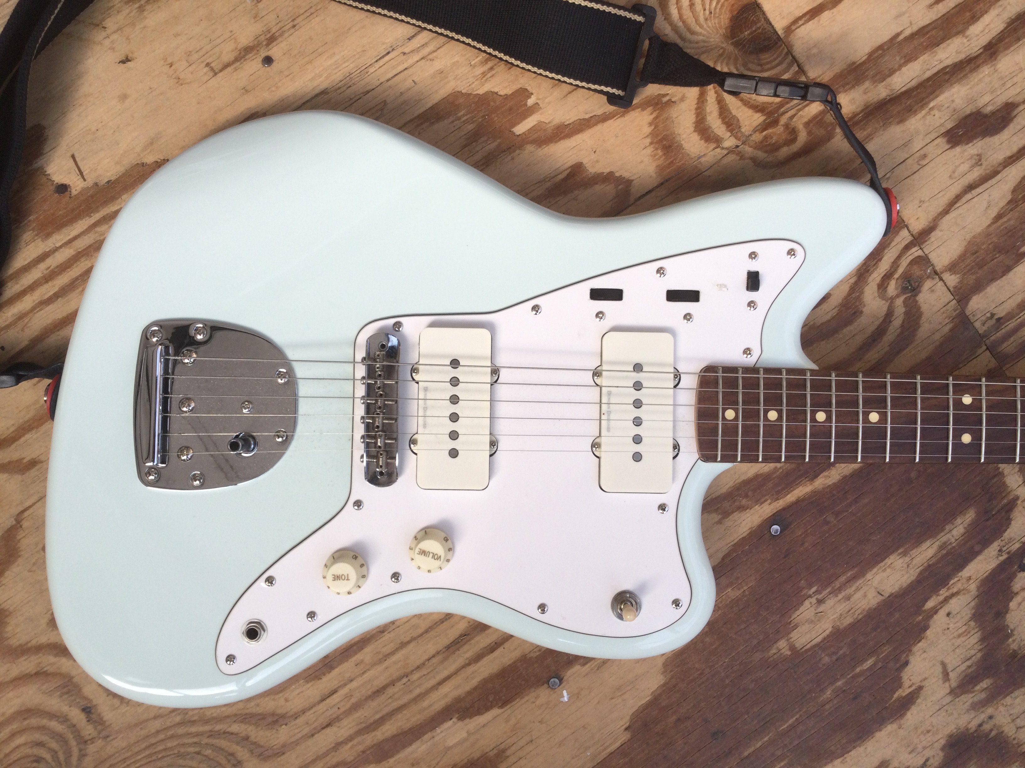 A Fender Squier Jazzmaster electric guitar in sonic blue. Comes with soft carry case.