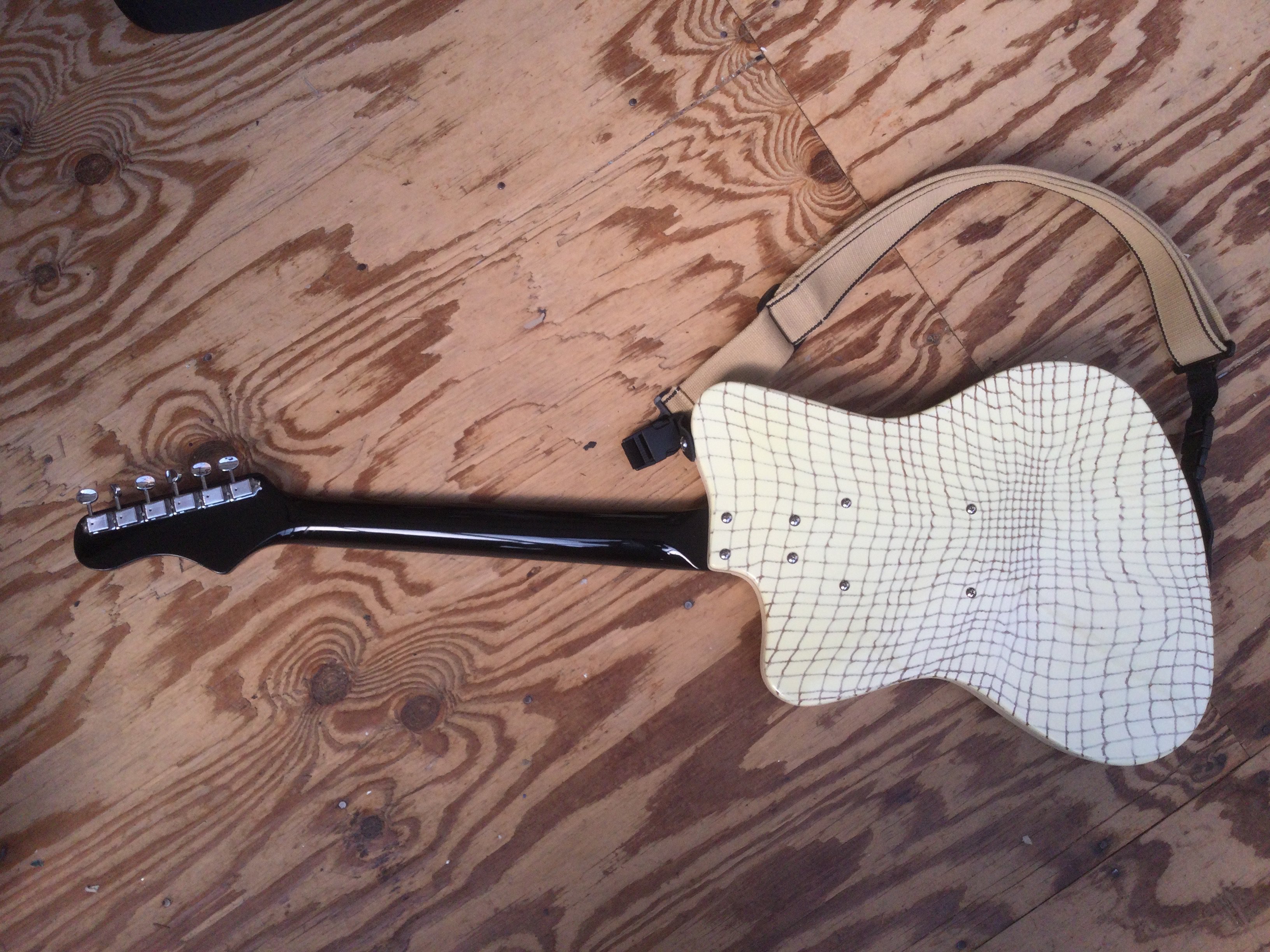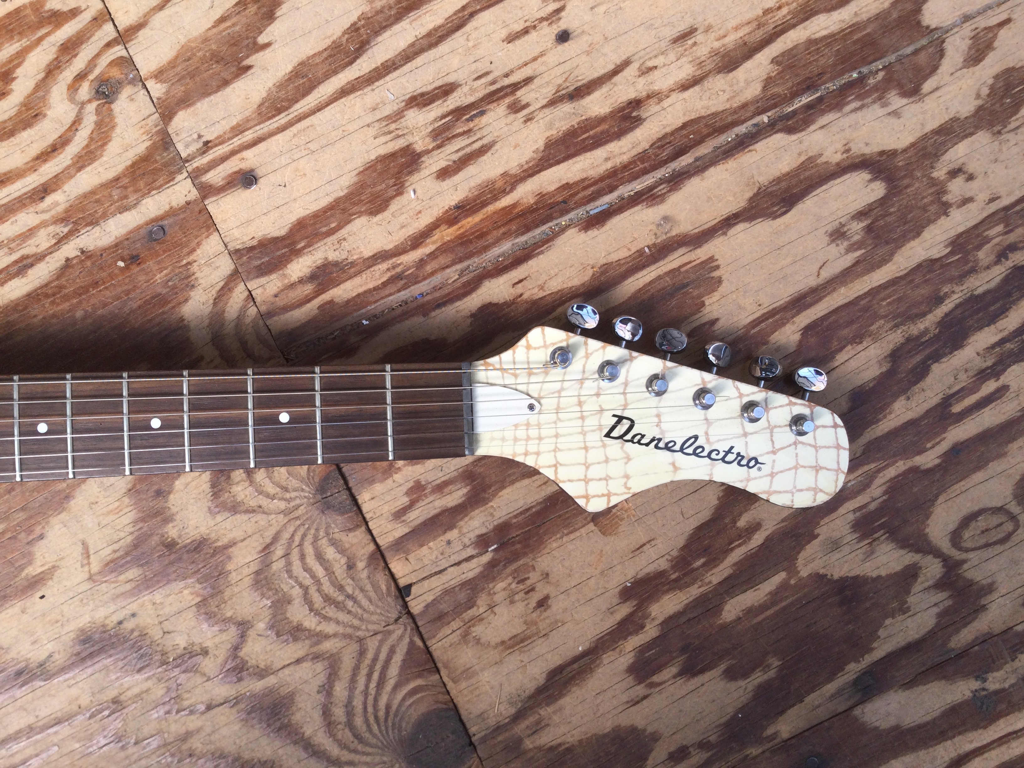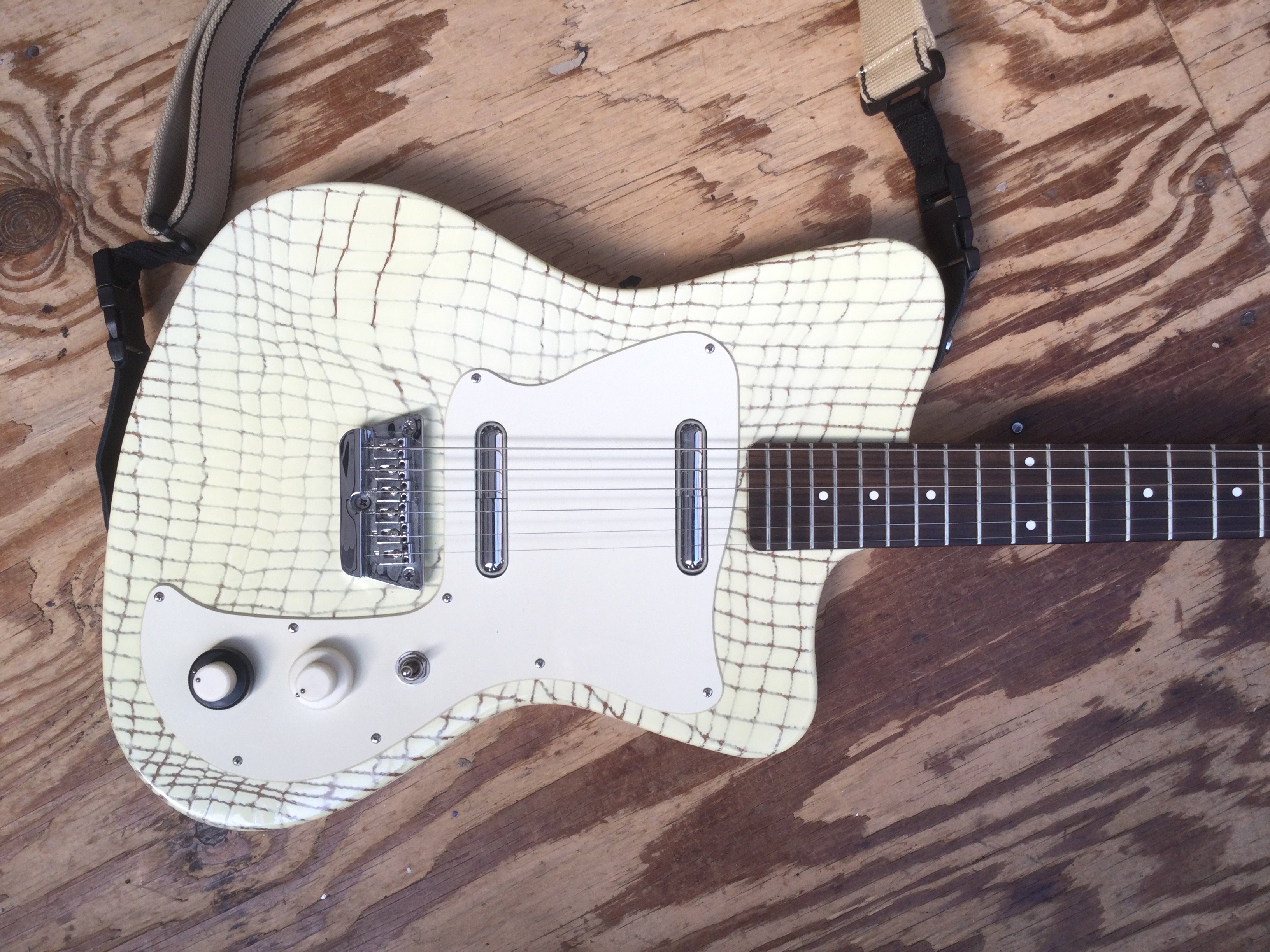 A Danelectro 67 Heaven electric guitar with an alligator skin style finish. Cones with a soft carry case.