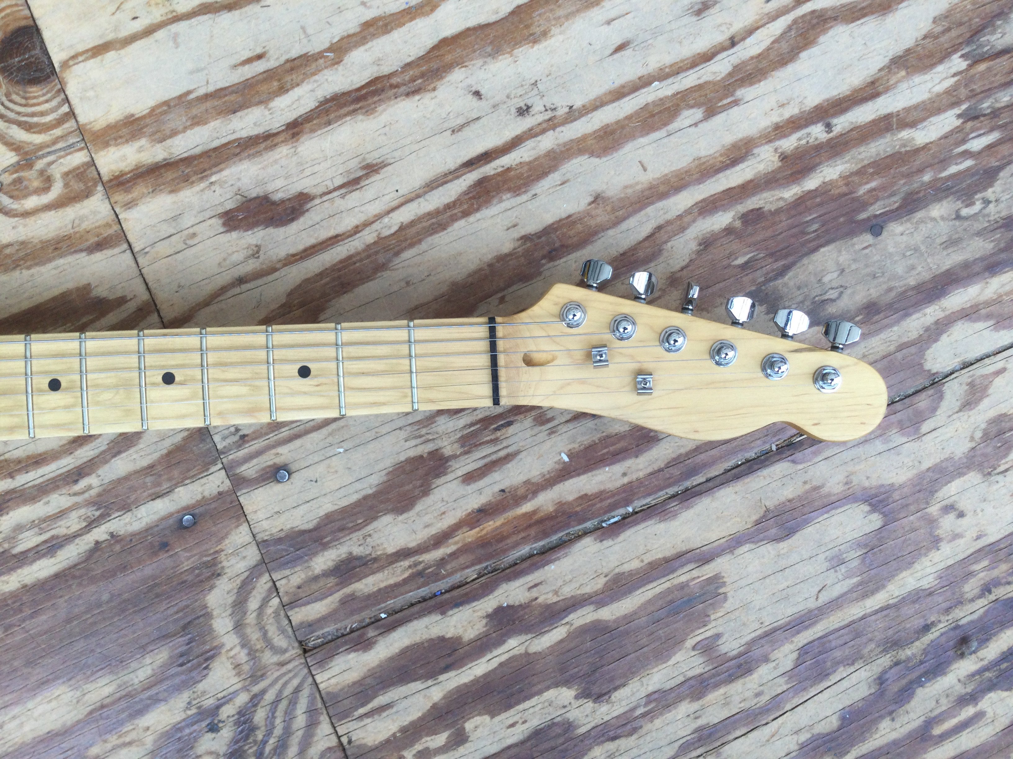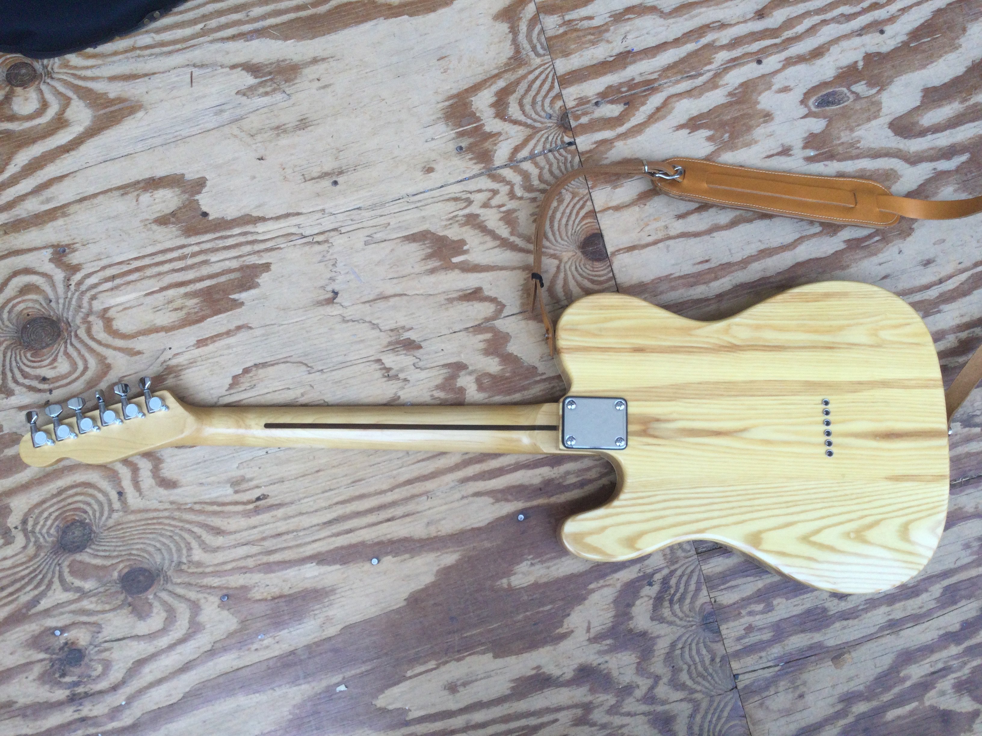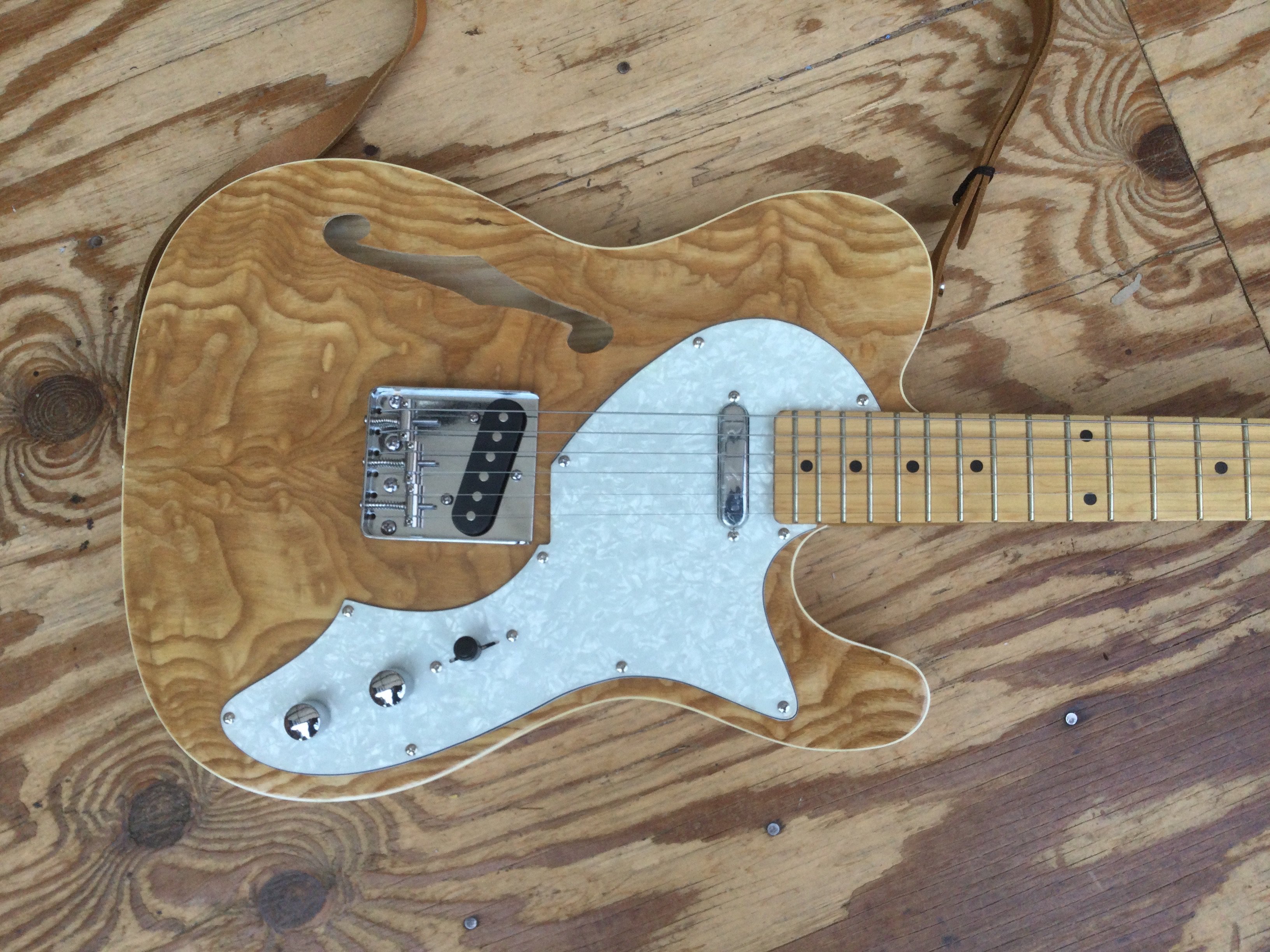A thinline Telecaster type electric guitar. No maker's name. Comes with a Fender Squier soft carry case.