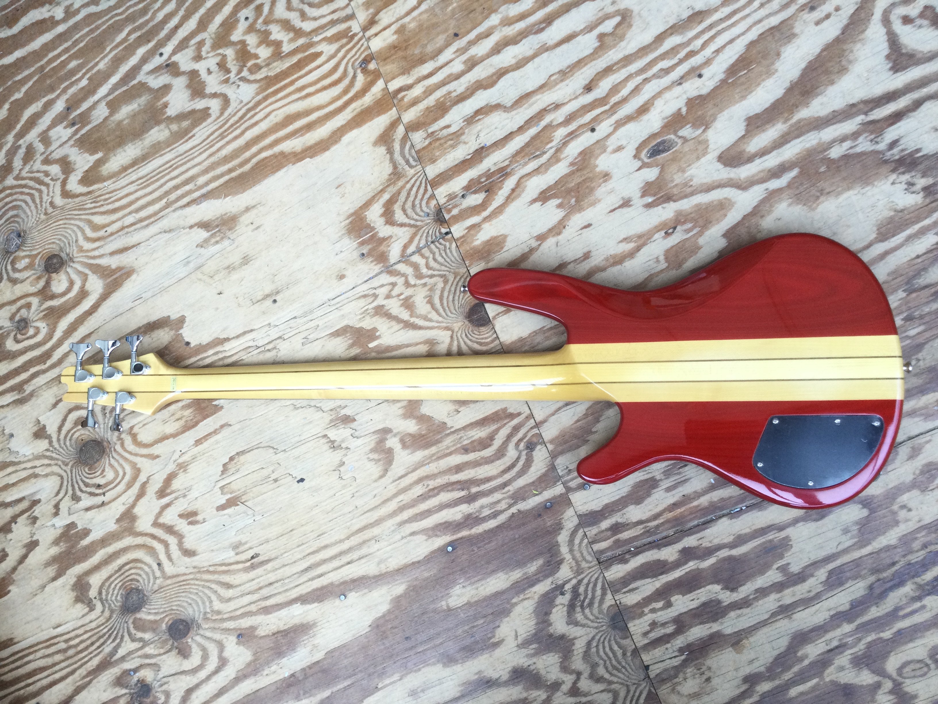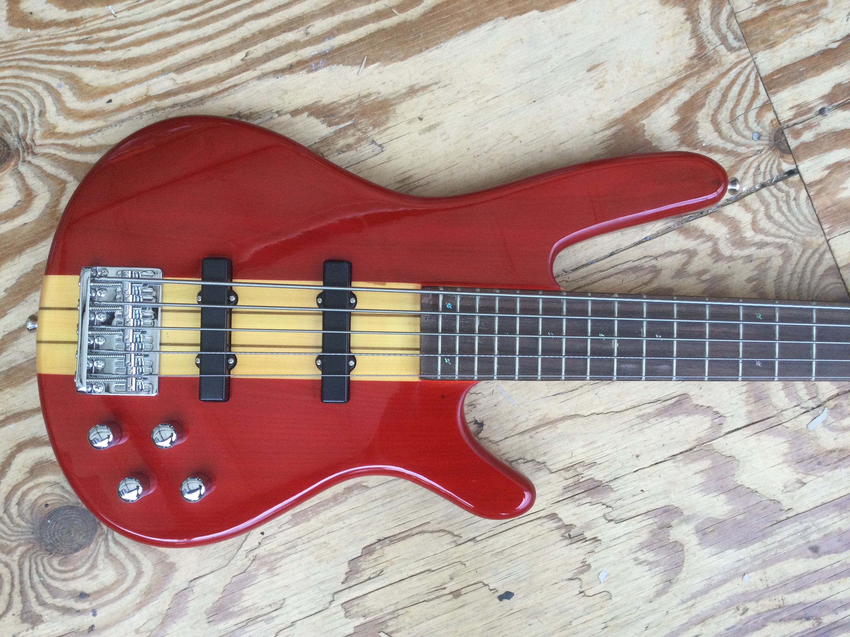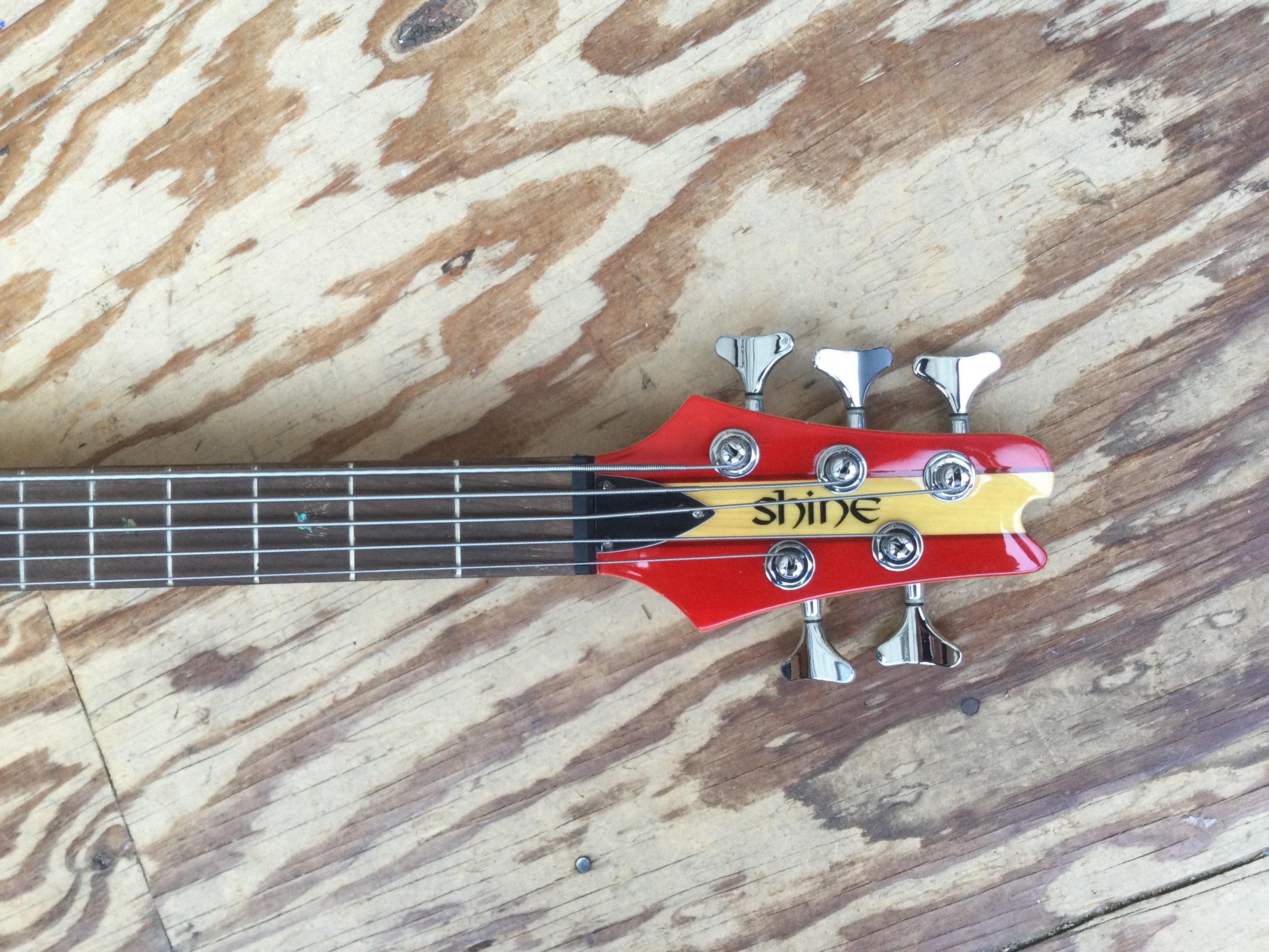 A Shine 5 string bass guitar. Comes with a soft carry case.