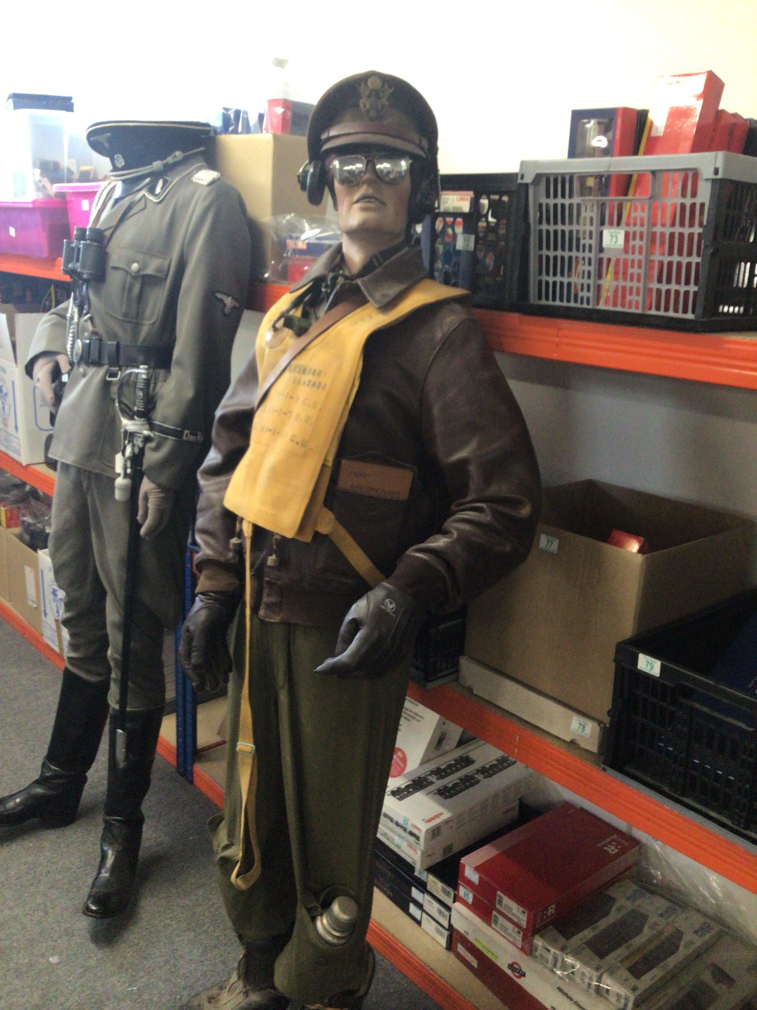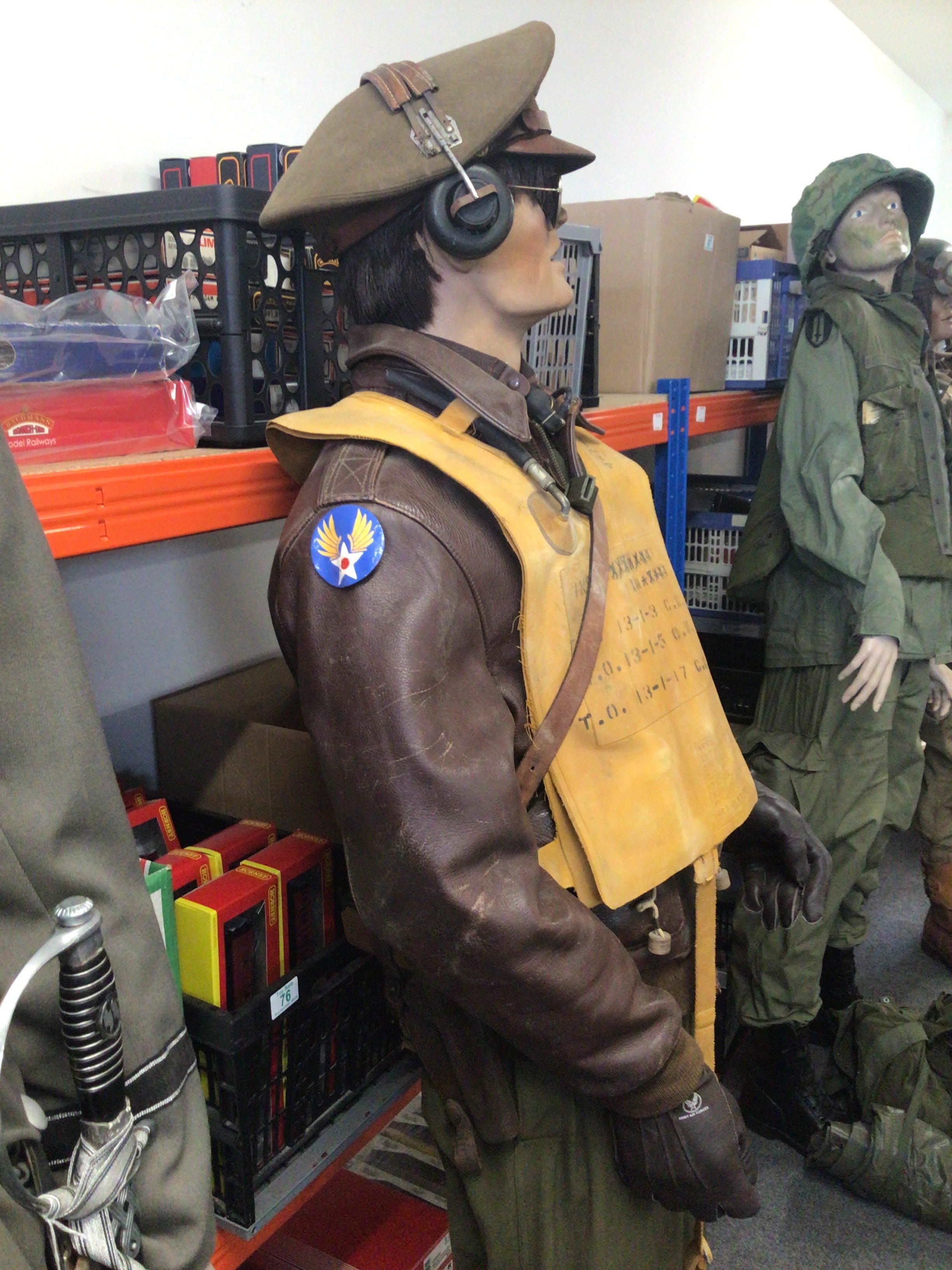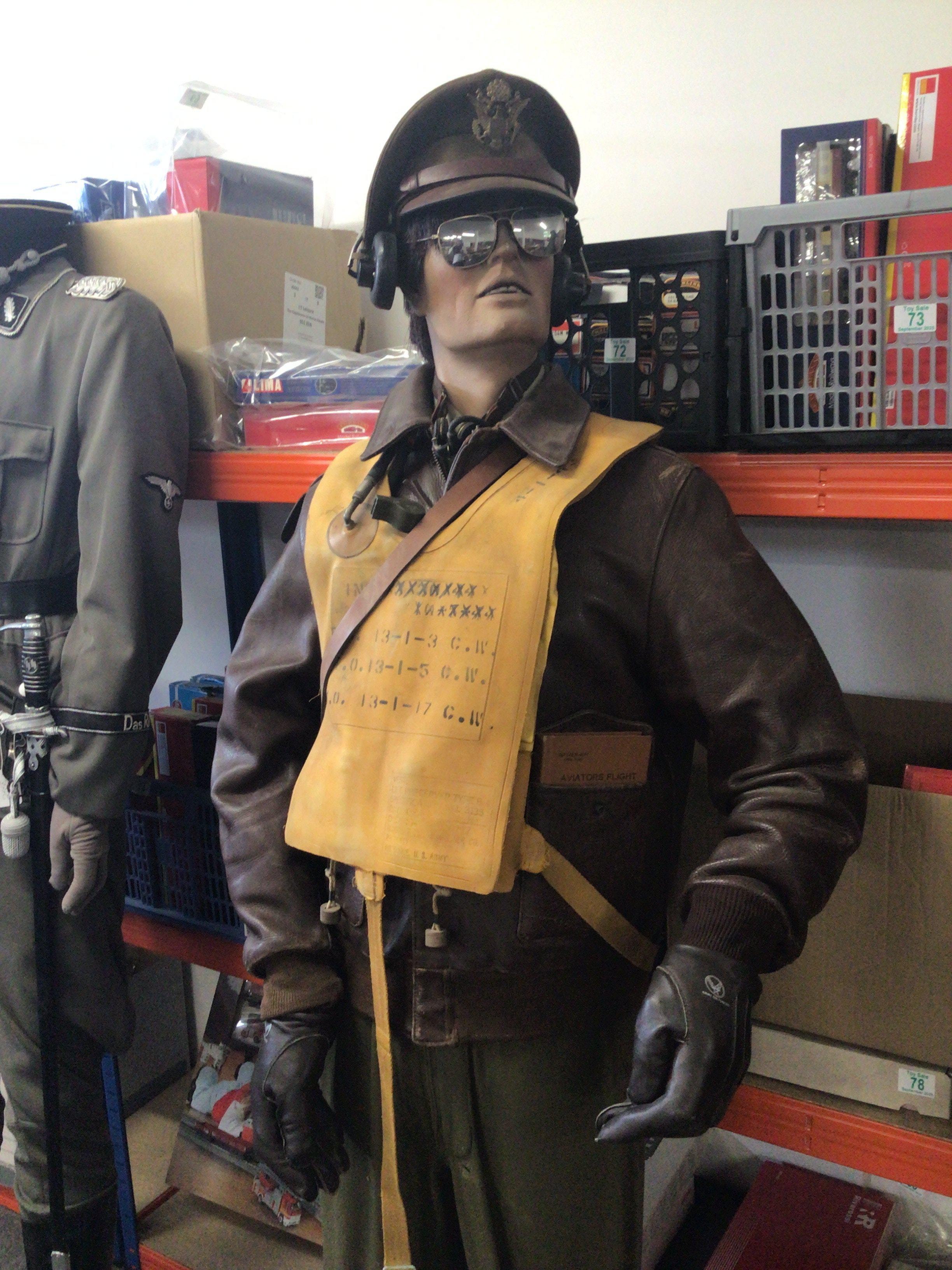 A life size mannequin in II world war American pilots uniform with brown leather jacket replica side arm life jacket. Some parts possibly authentic.
