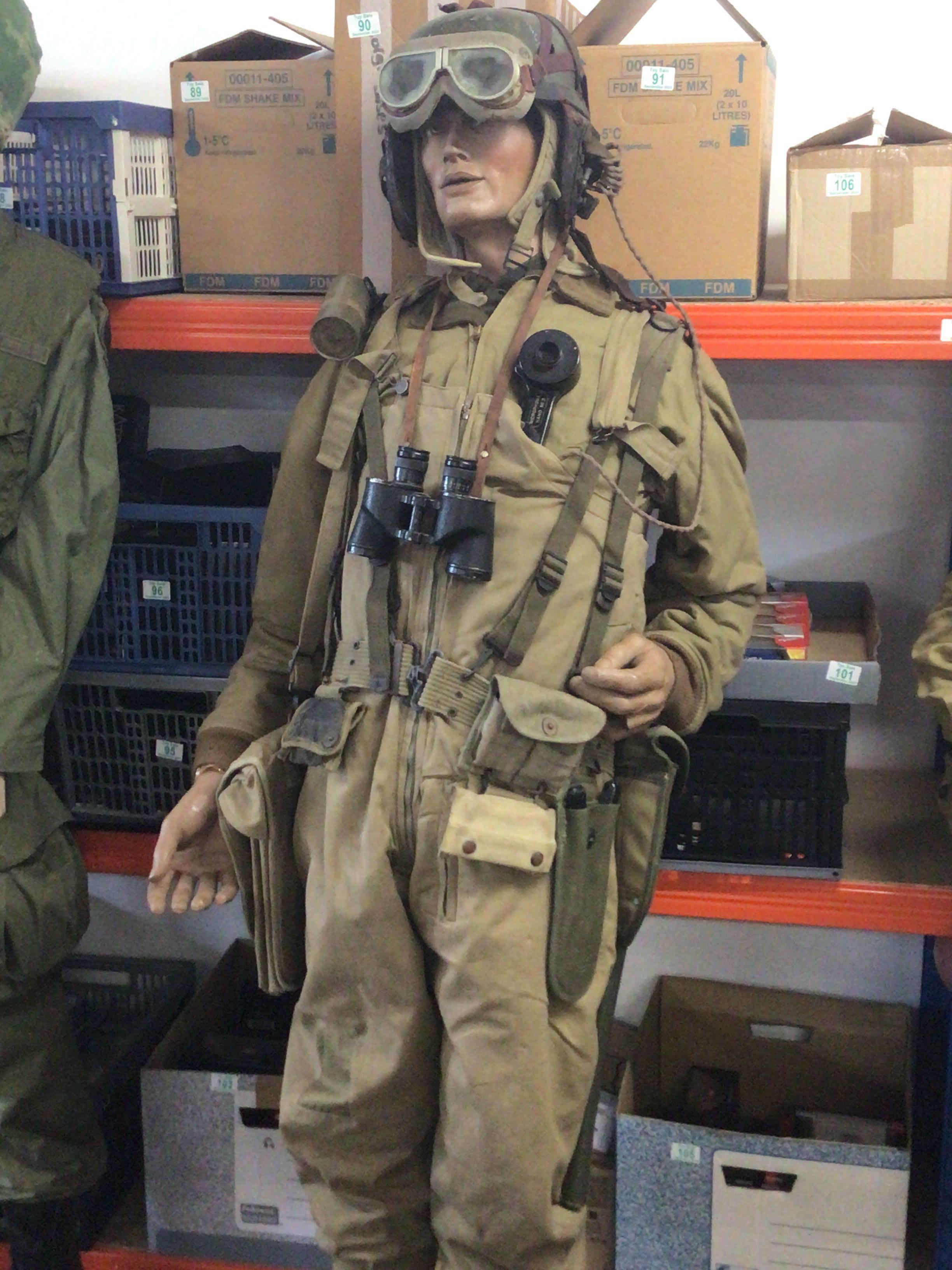 An American II world war Armour Tank crew field outfit on a full size mannequin with helmet map case webbing etc lots of authentic fitting.