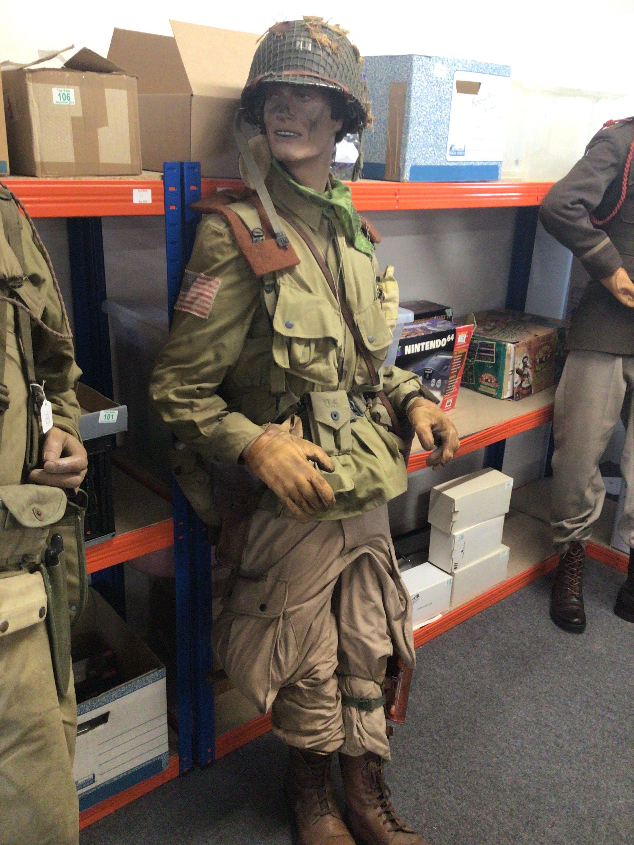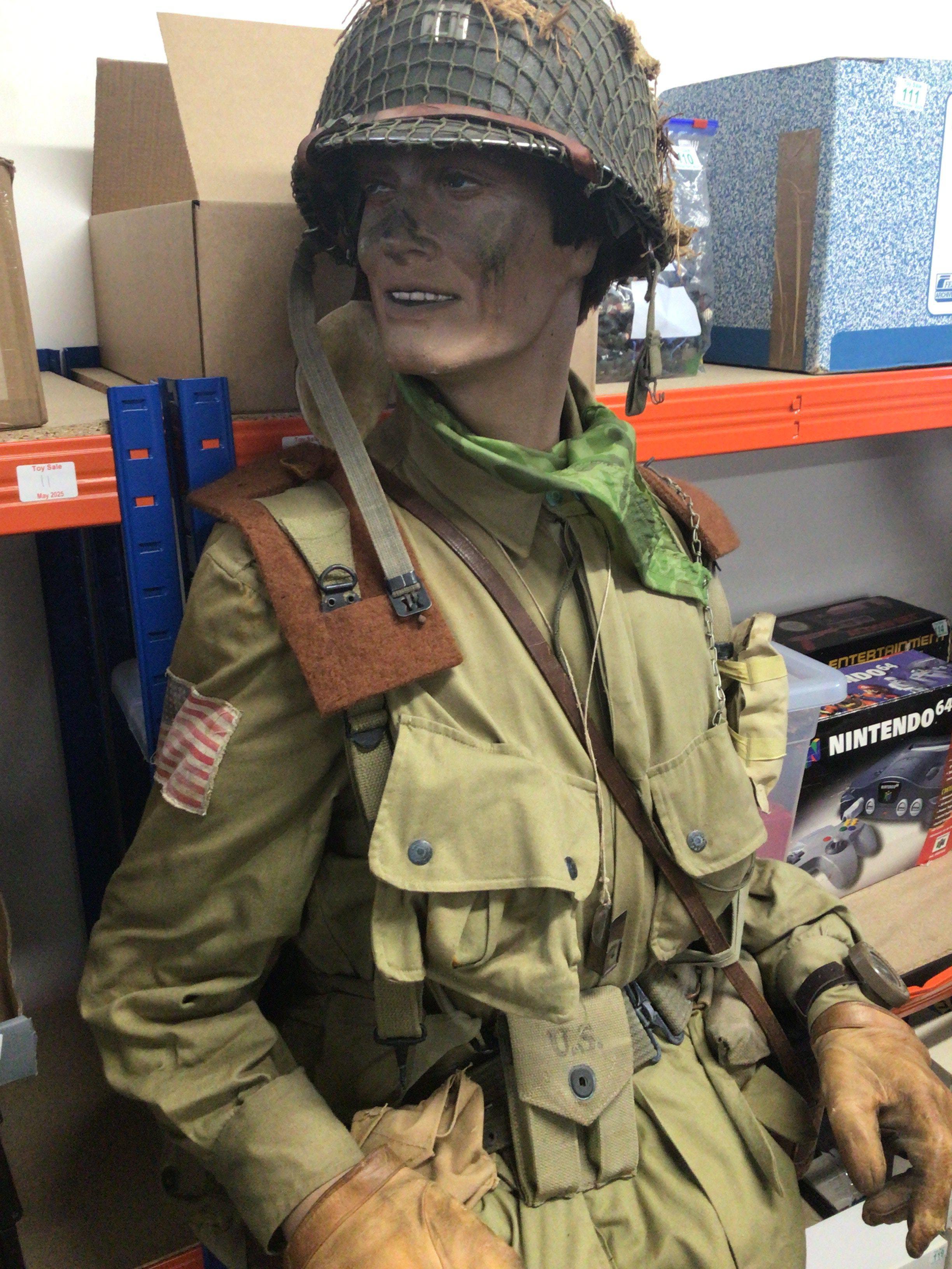 An American II world war airborne division field uniform on a life size mannequin with full webbing accessories including first aid magazines pouches.