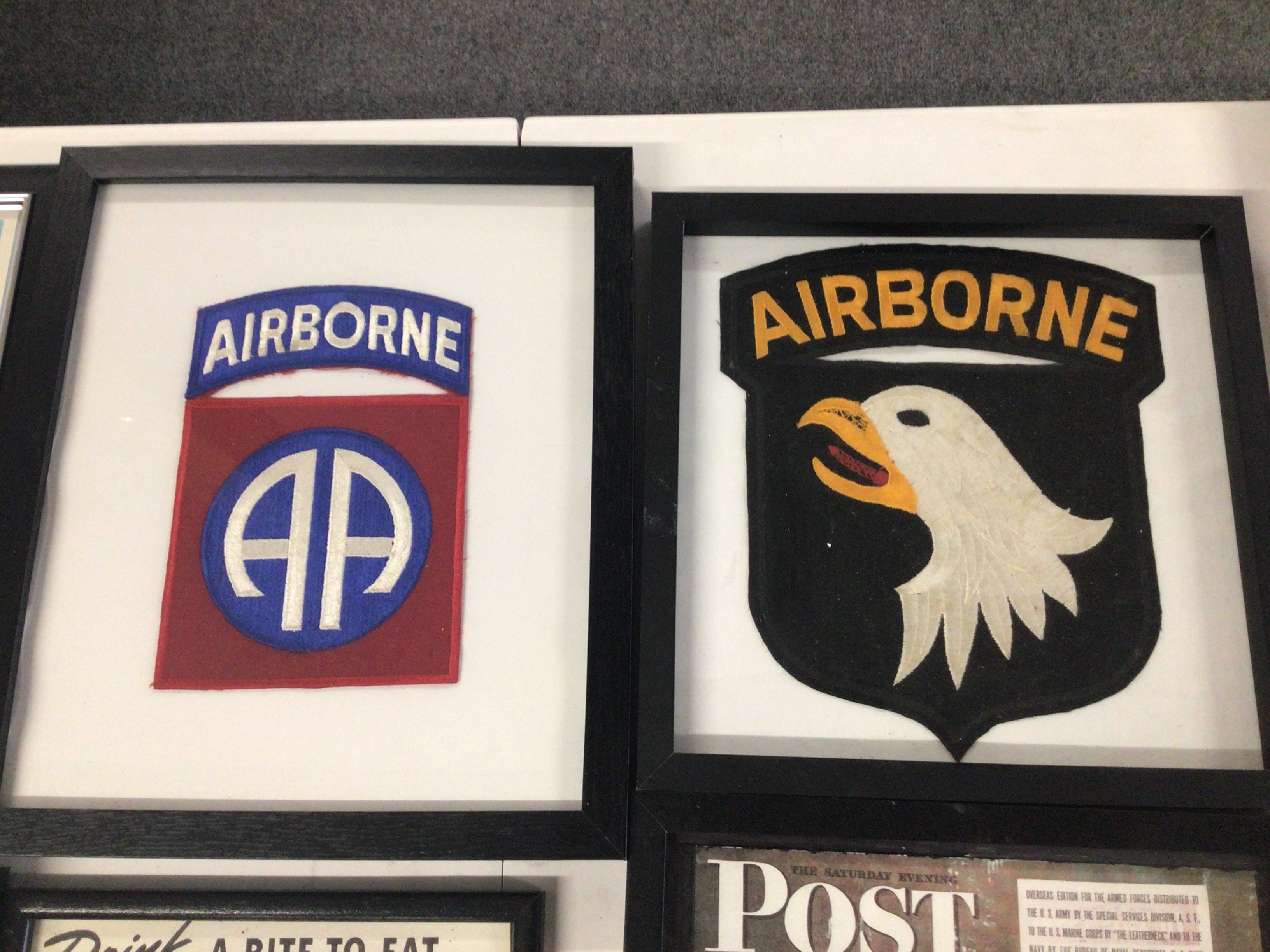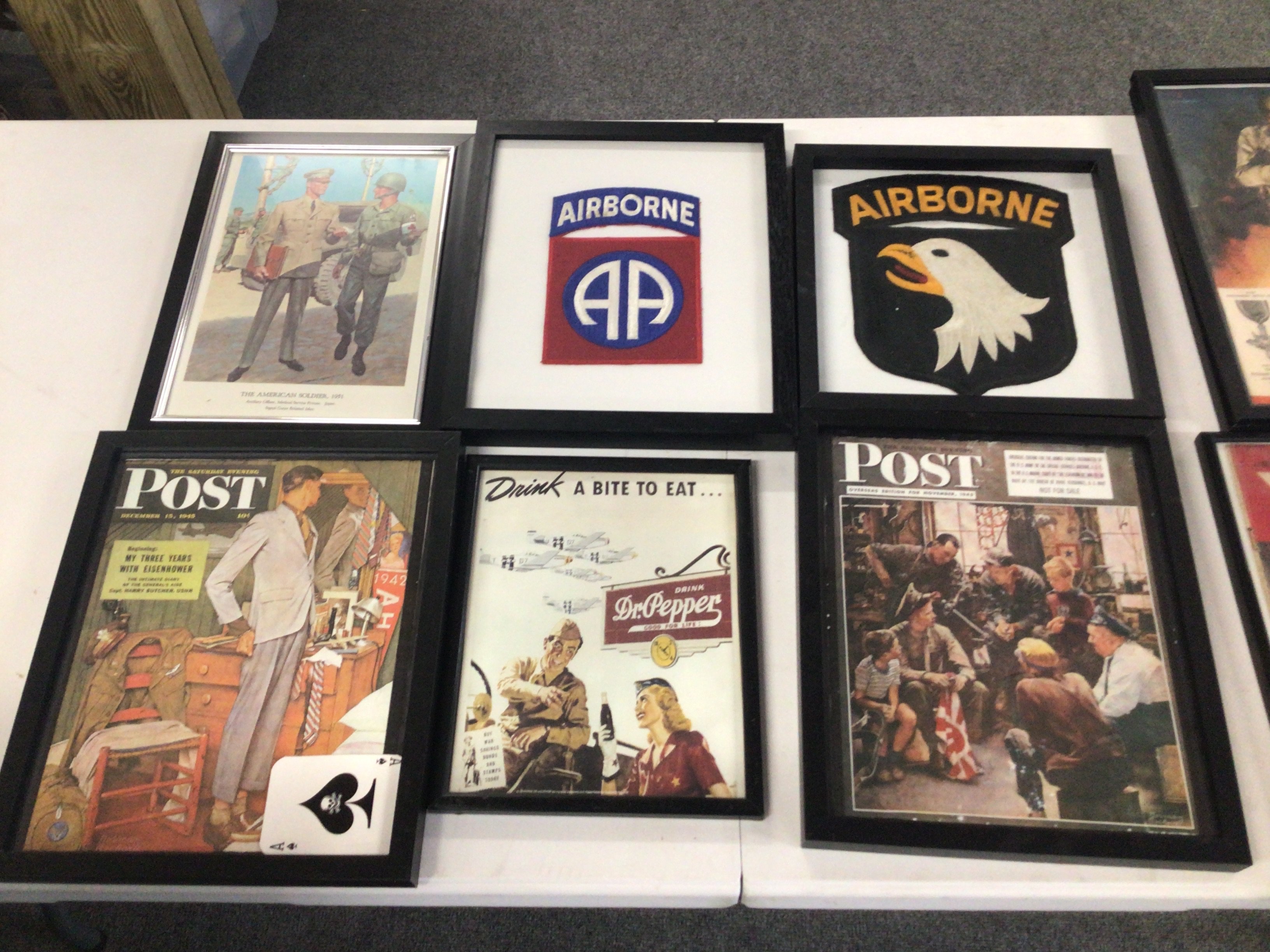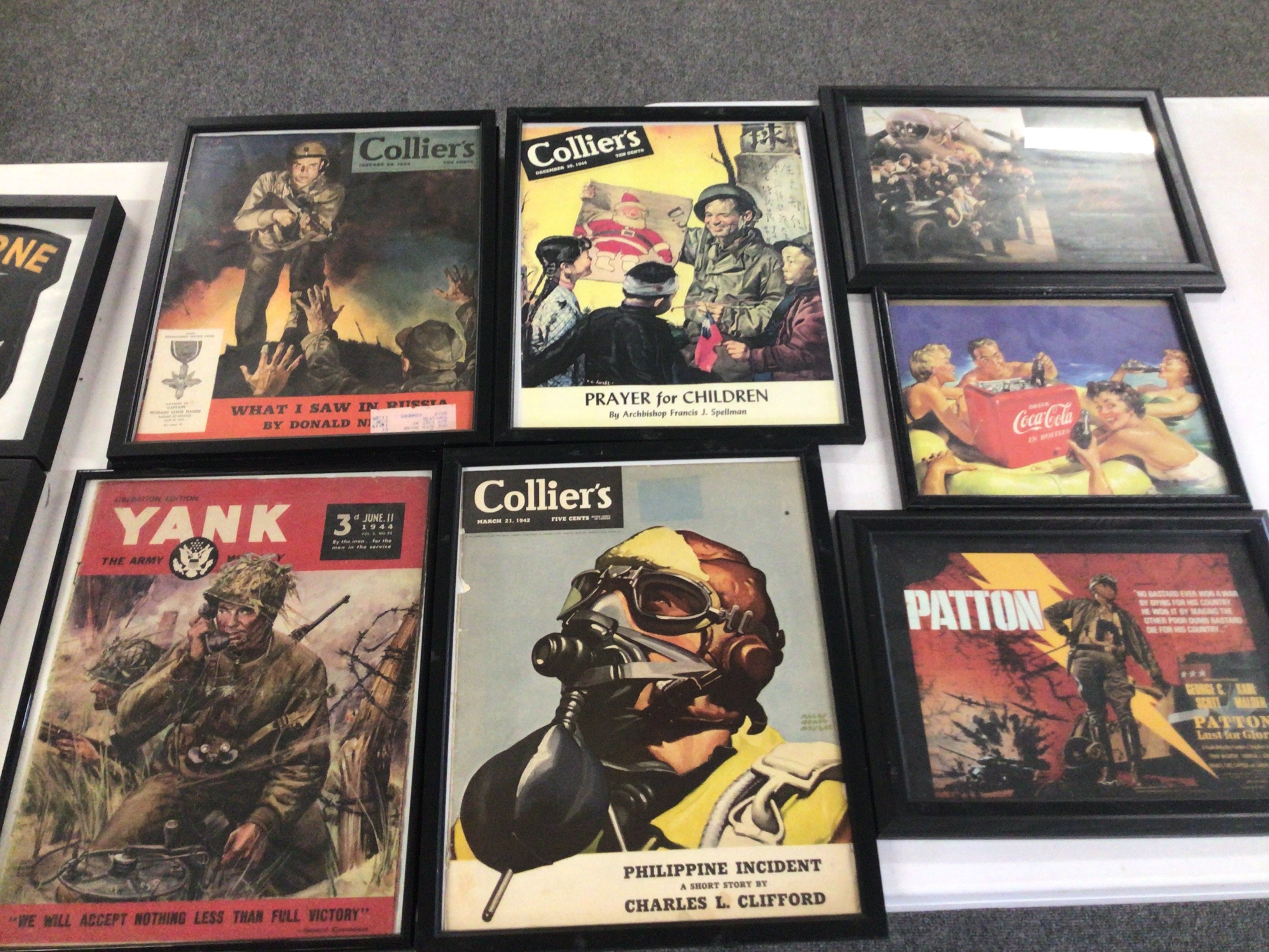 A collection of intresting American 1940s framed magazine covers Post Colliers framed enlarged American Airborne badges and other pictures (14)