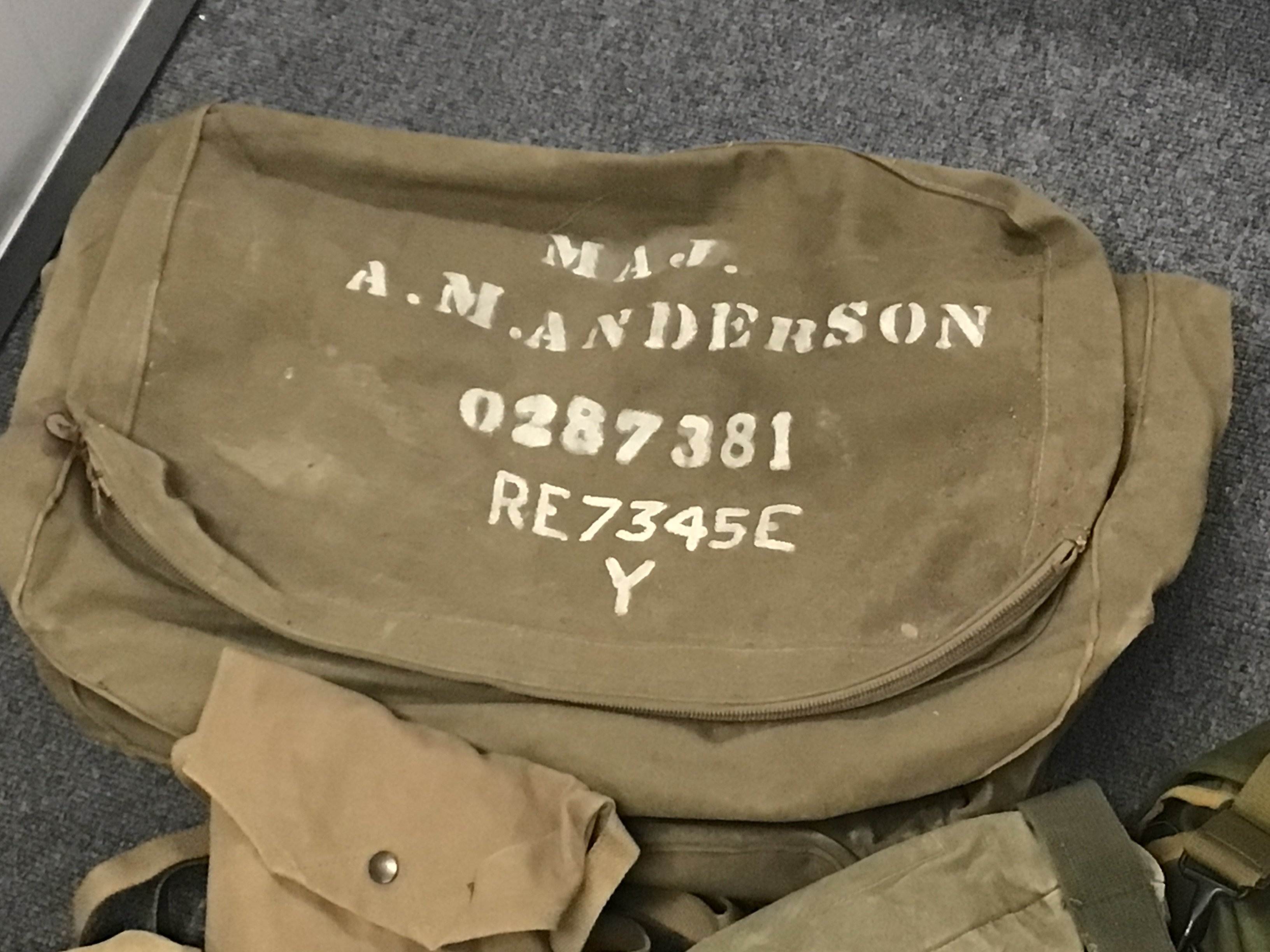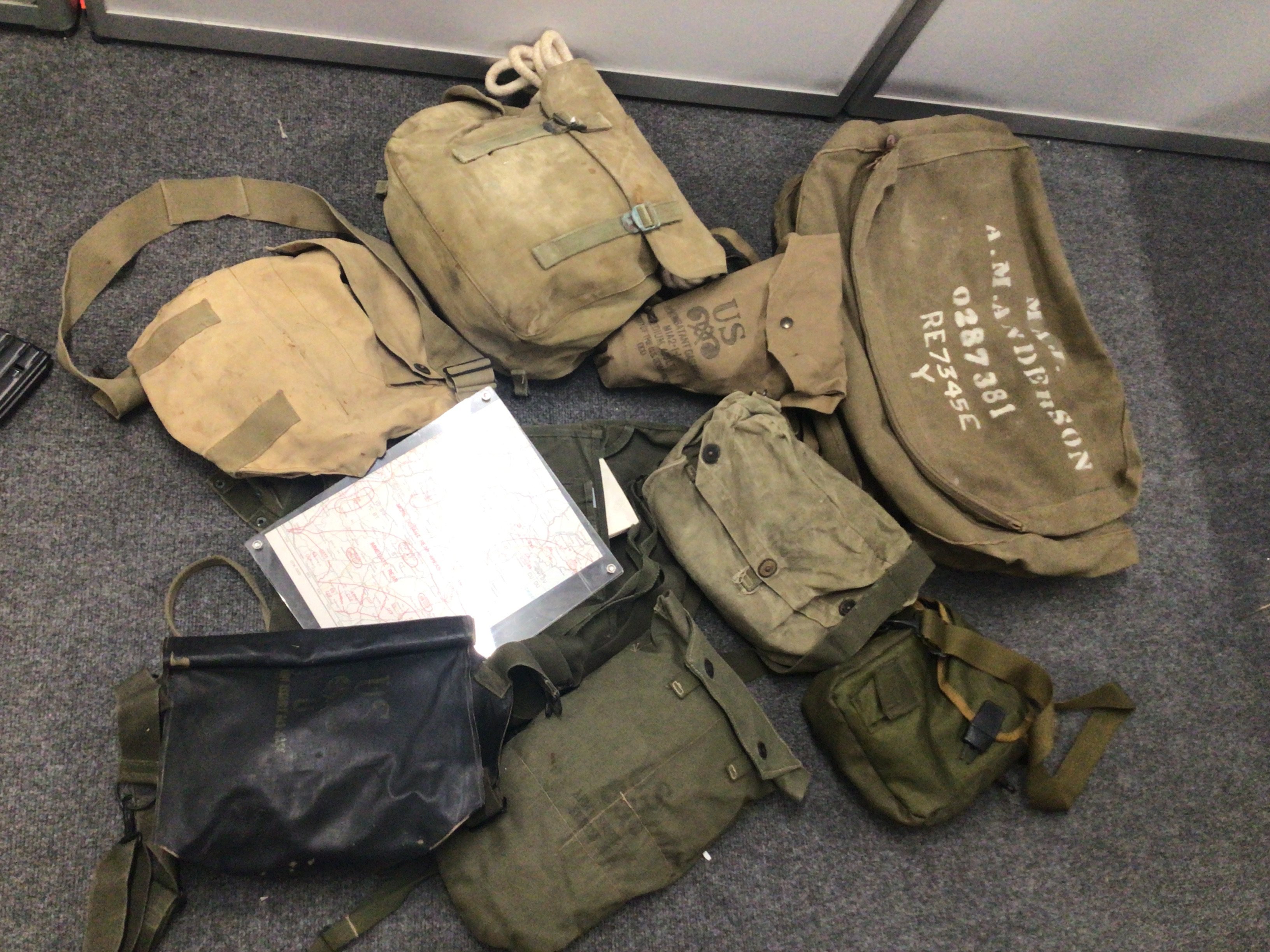 A collection of II world war and later American canvas field kit bags map cases and gas masks.