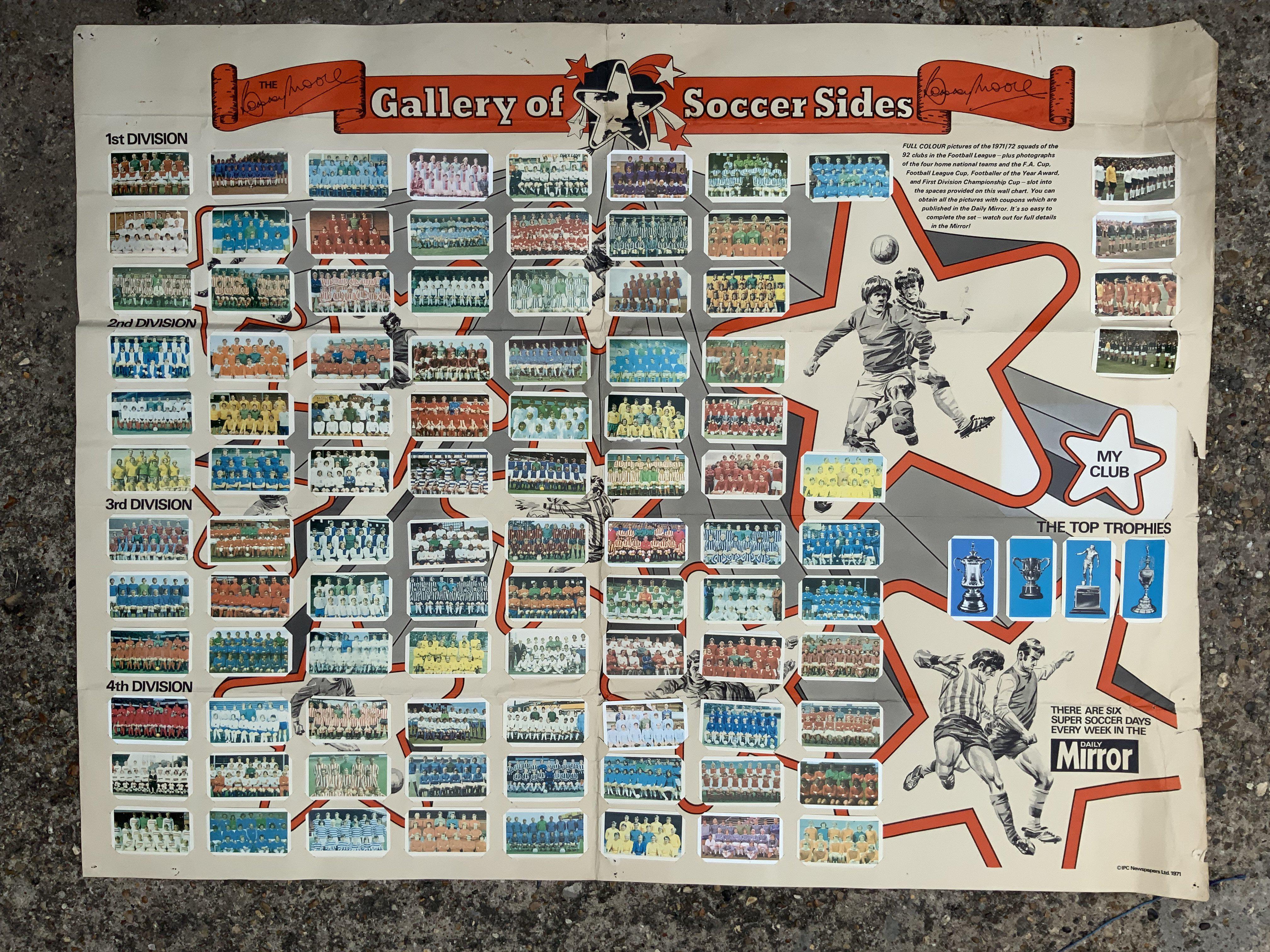 Bobby Moore Daily Mirror 1971/72 Cards + Poster: Original large poster with all 92 clubs plus the 4 home nations and 4 trophies. Complete and neatly clipped onto poster. C/W 39 spare cards.