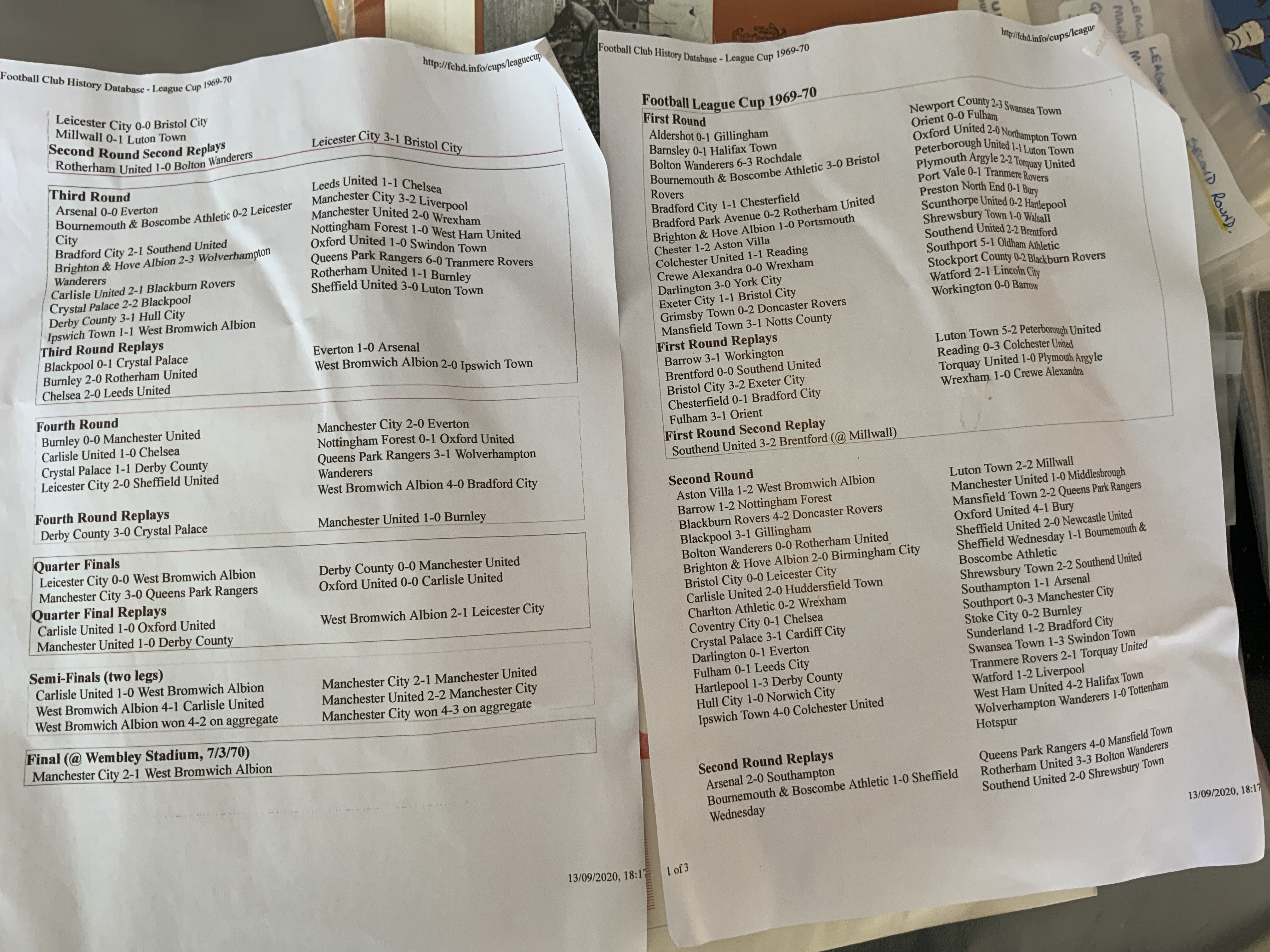 69/70 League Cup Full Run Of Football Programmes: Every match played in the competition from first round through to the final in which Man City beat West Brom. Unchecked list of programmes from collector online. This was the first season all 92 clubs participated. (100+)
