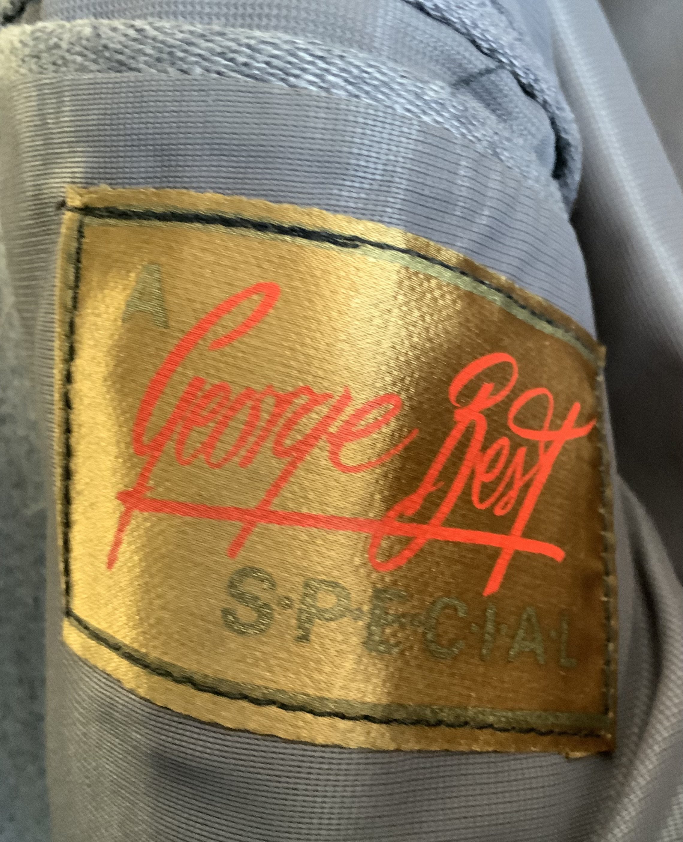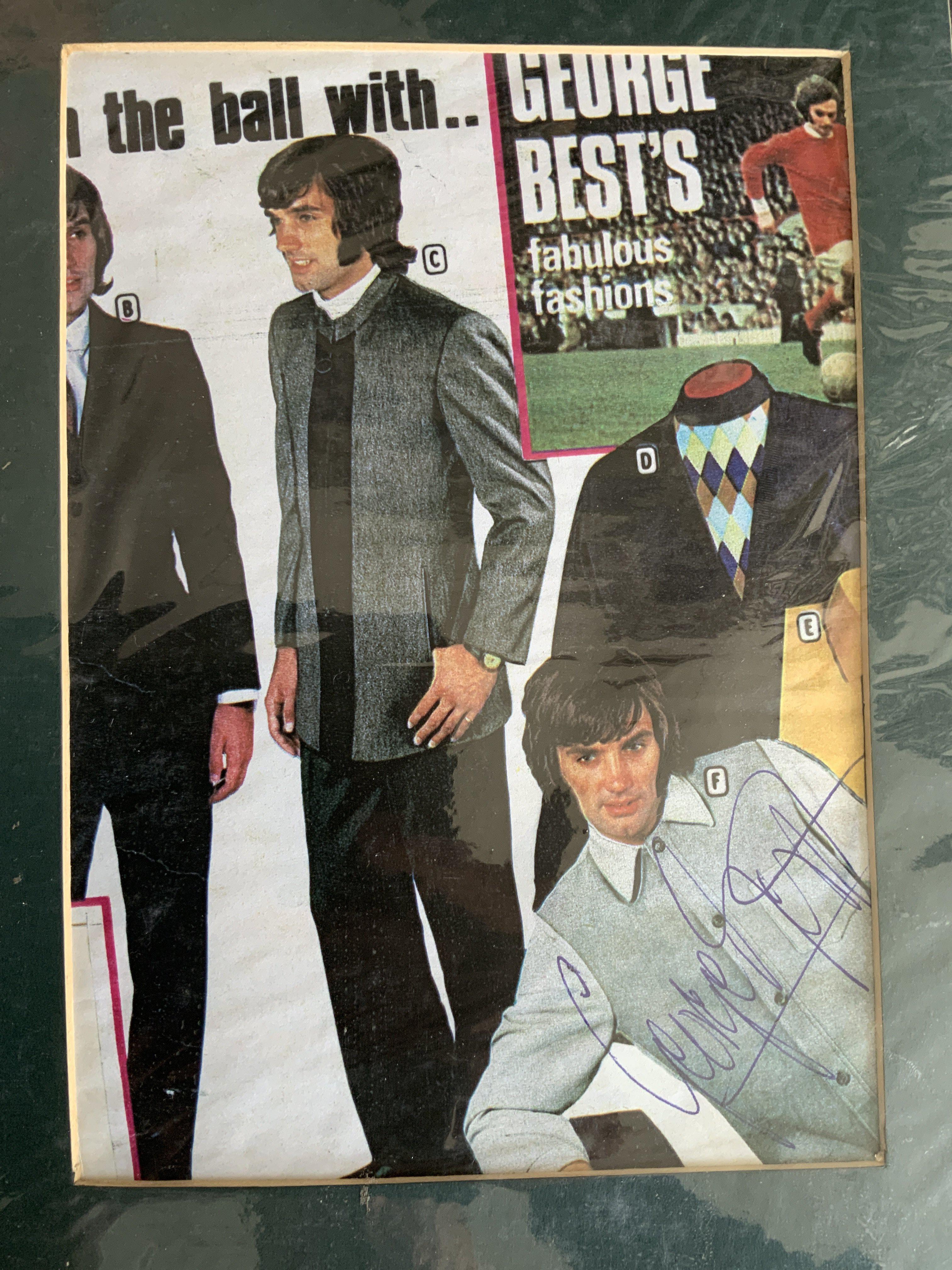 George Best (Manchester United) Shop Jacket + Signed Advert: Stunning grey 1960s unused jacket and picture of Best wearing this style on an advert which he has signed. Inside label reads George Best Special. No size given but possibly medium in wool and polyester.