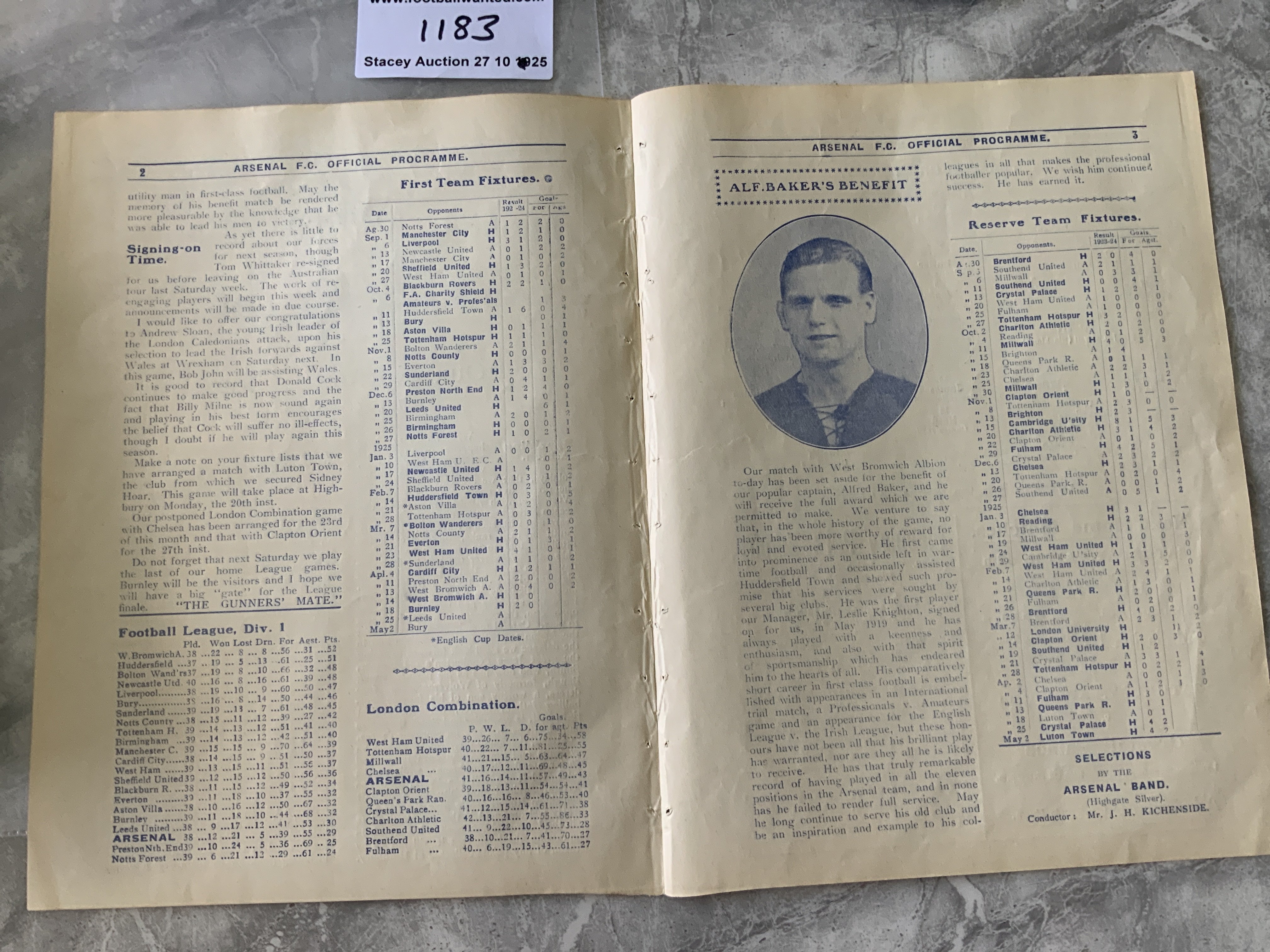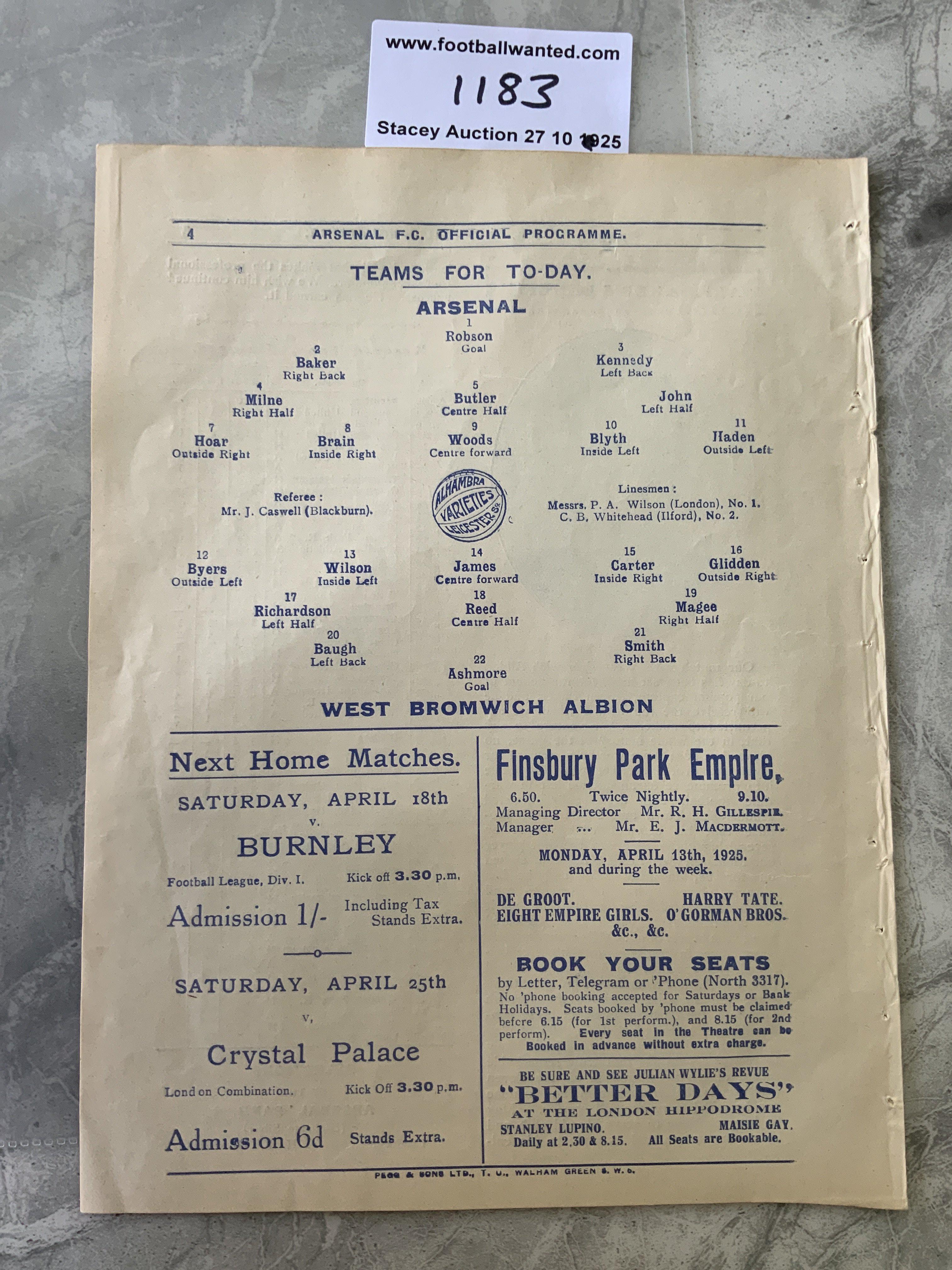 1924 - 1925 Arsenal v West Brom Football Programme: Excellent condition ex bound 4 pager for league match 14 4 1925. Printed in blue making it quite attractive. No team changes.