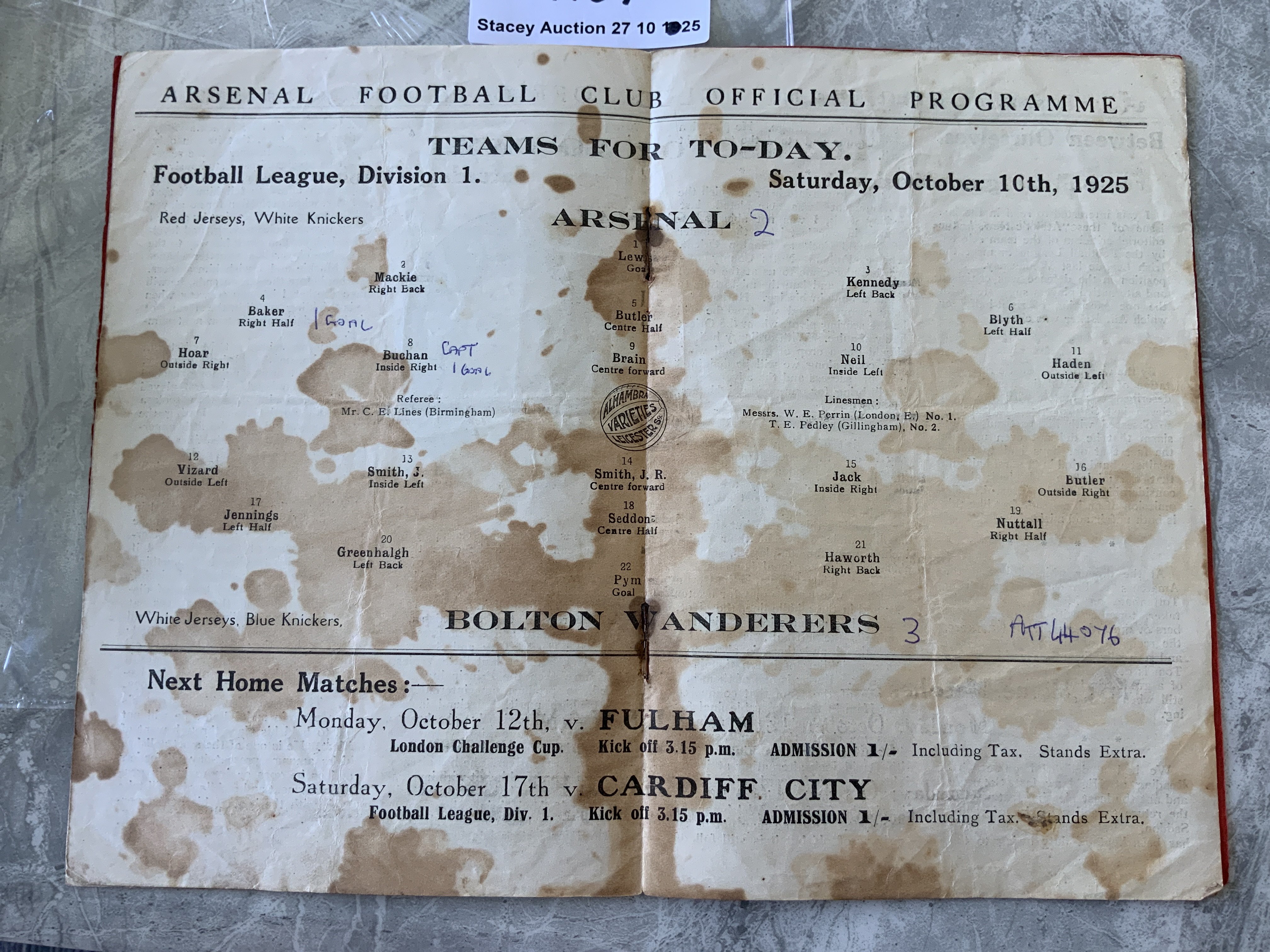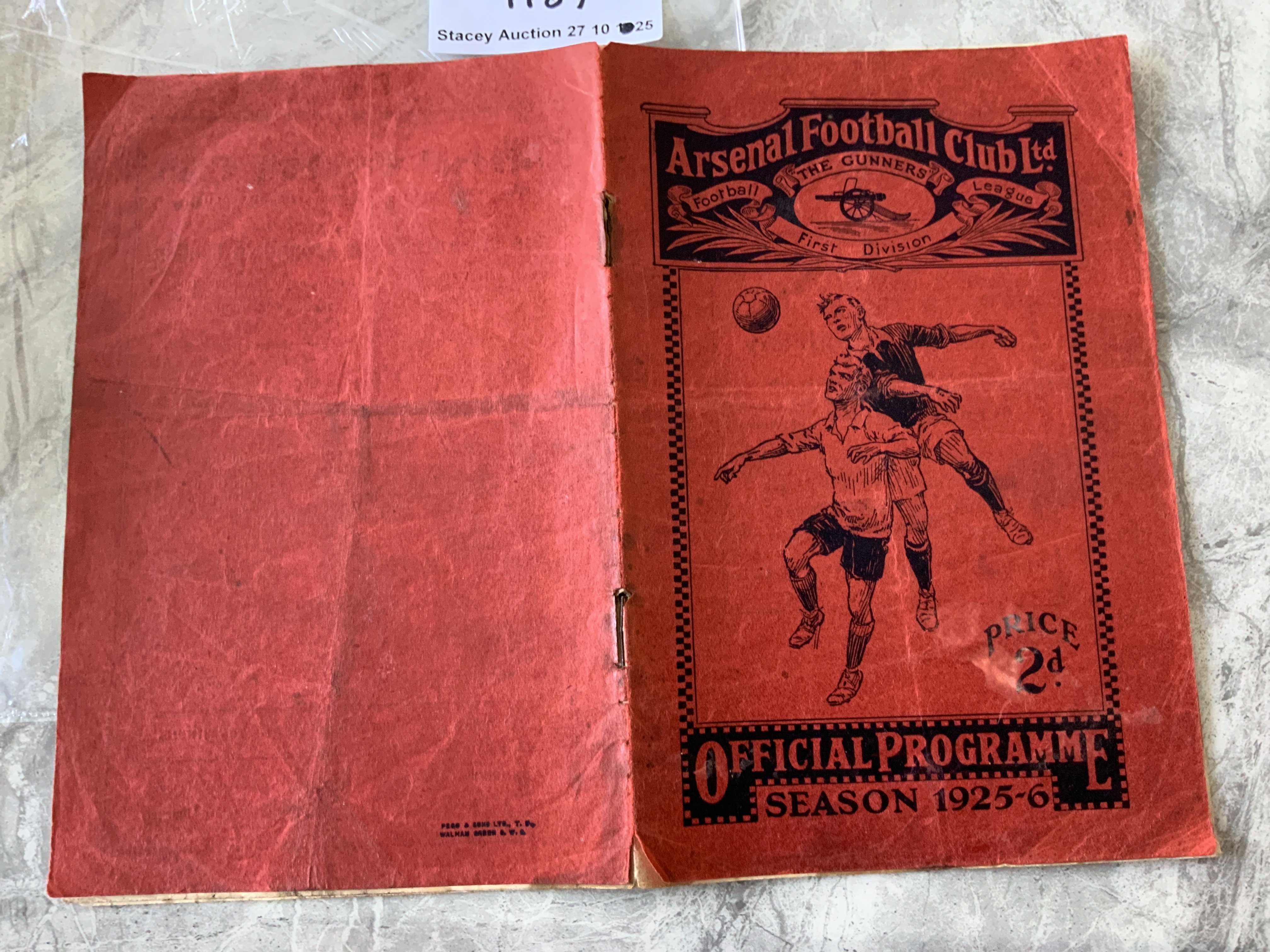 1925 - 1926 Arsenal v Liverpool Football Programme: Poor/fair condition league match dated 10 10 1925. Rusty staples and staining throughout white inside pages. Writing to team page.