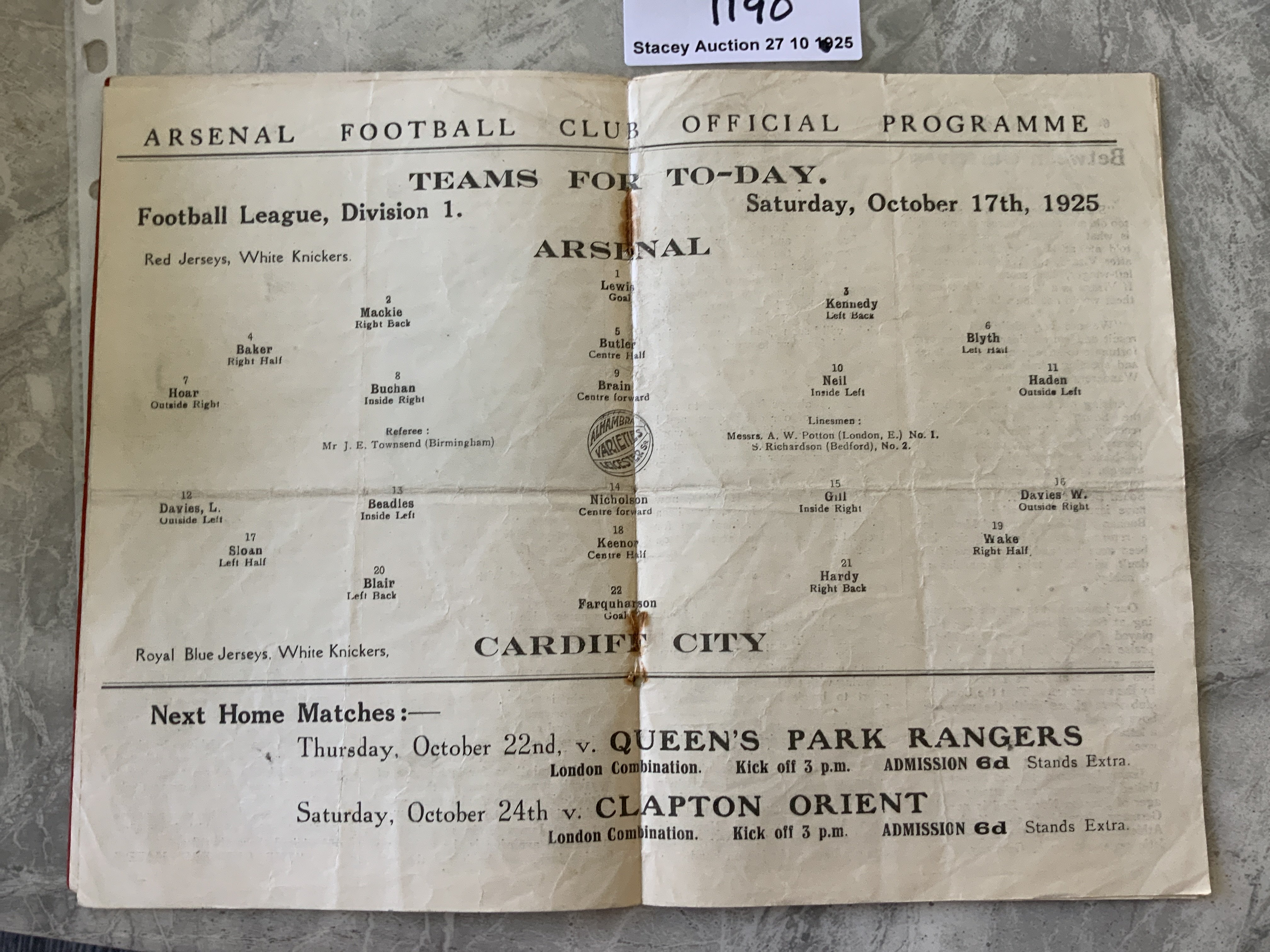 1925 - 1926 Arsenal v Cardiff City Football Programme: Good condition league match dated 17 10 1925. Rusty staples now removed. No team changes. Fold.