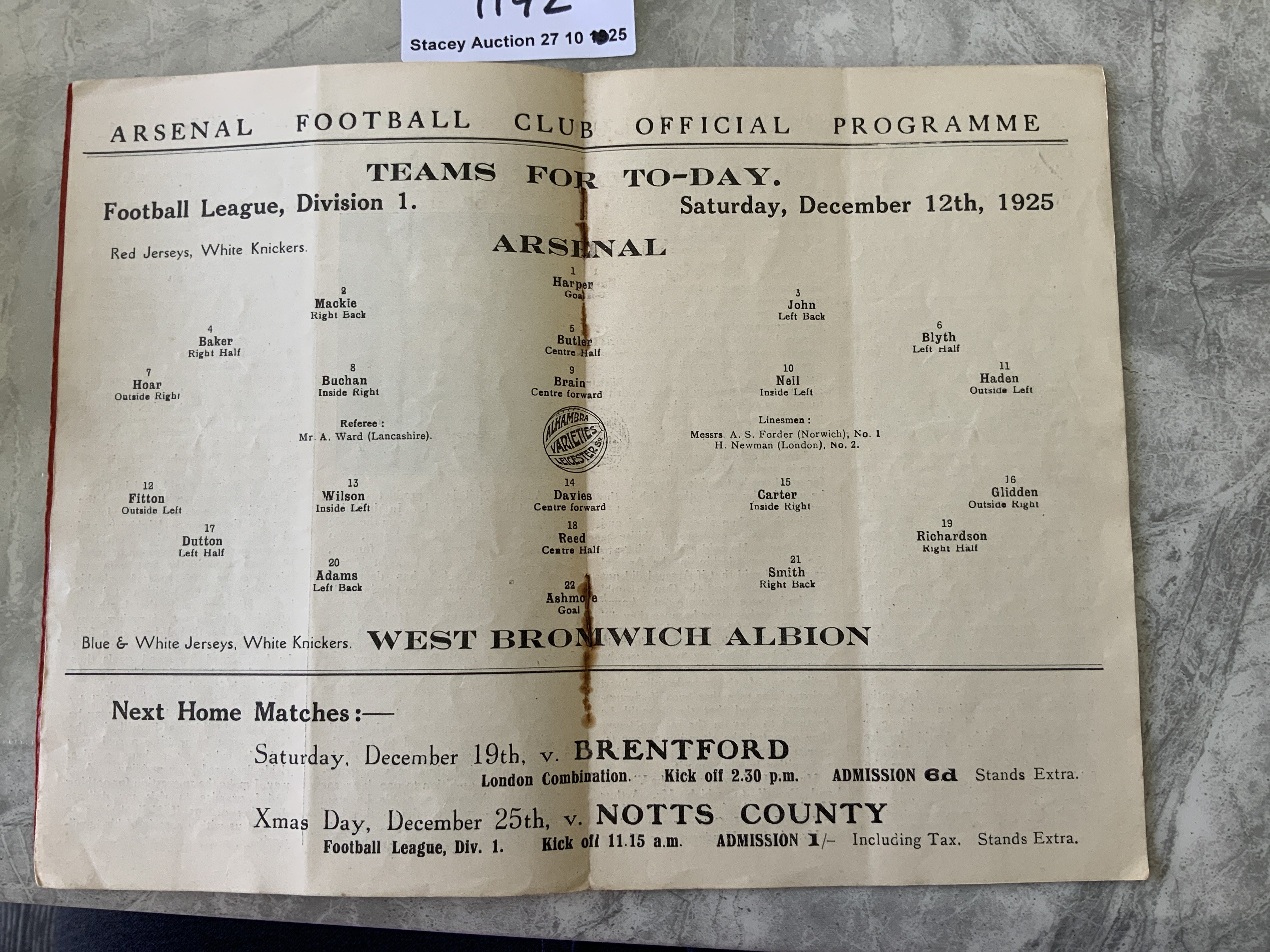 1925 - 1926 Arsenal v West Brom Football Programme: Good condition league match dated 12 12 1925. Rusty staples holding firm. No team changes.