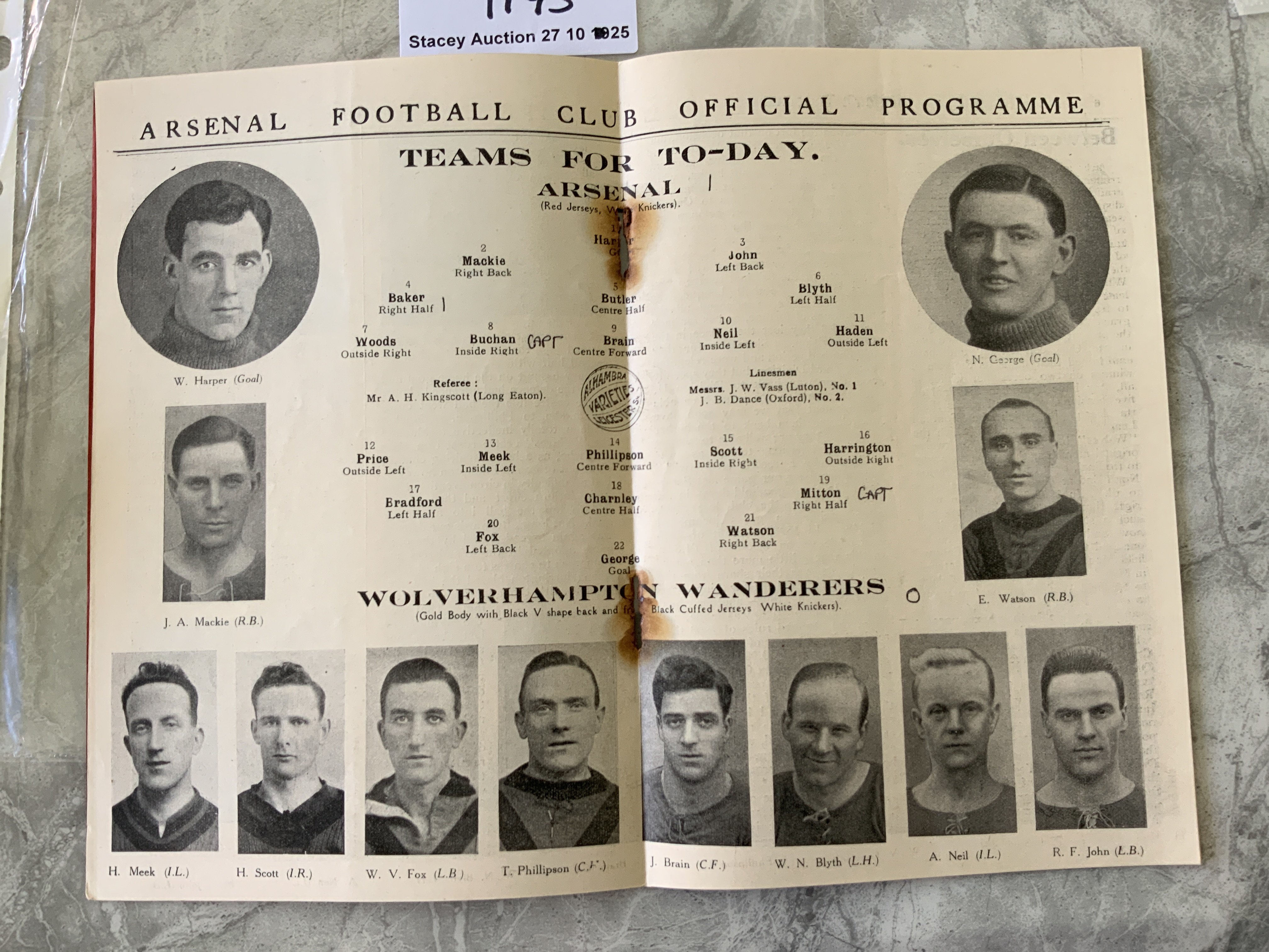 1925 - 1926 Arsenal v Wolves Football Programme: Fair condition FA Cup match dated 13 1 1926. Rusty staples rotted away leaving holes. No team changes.