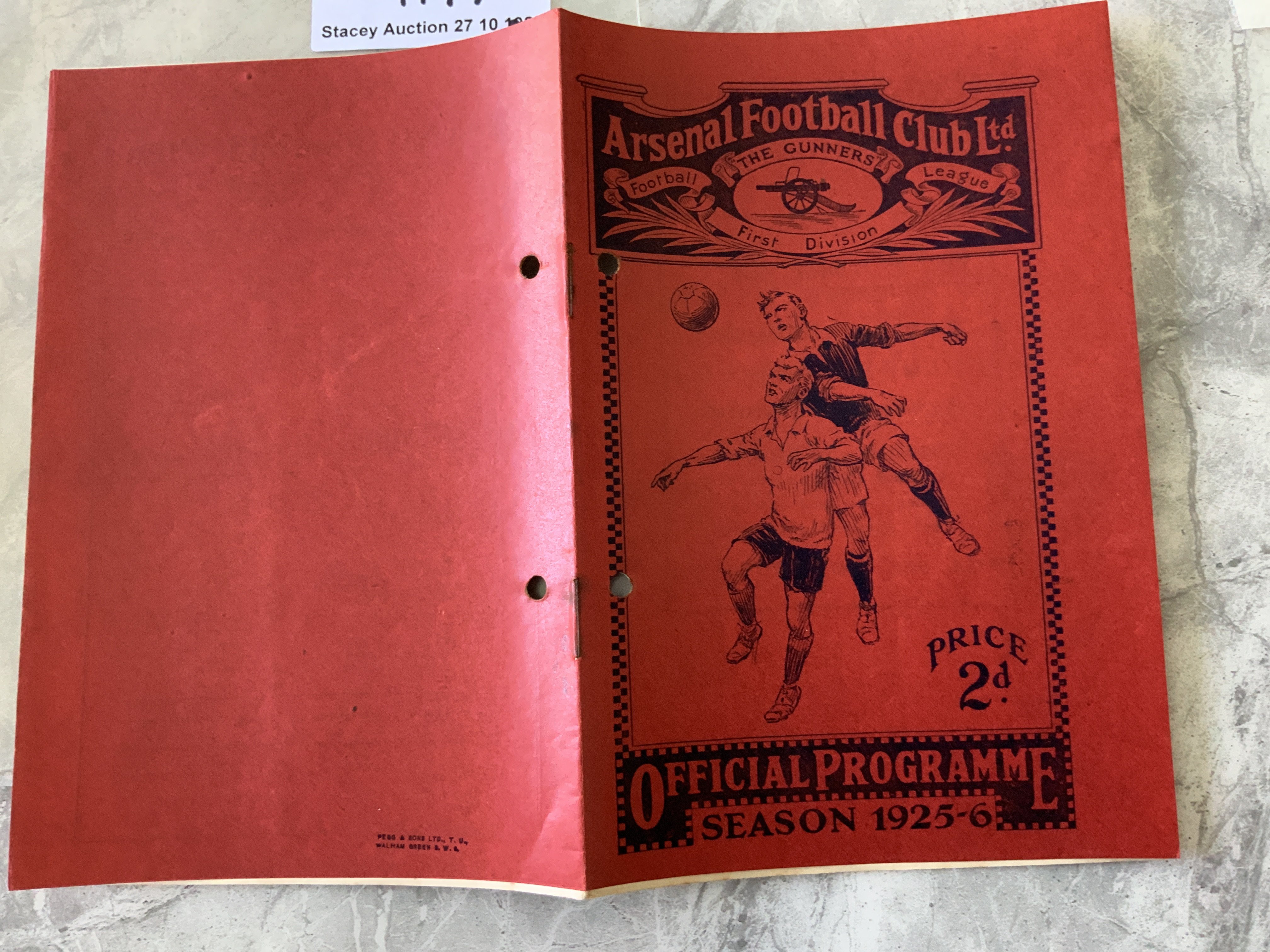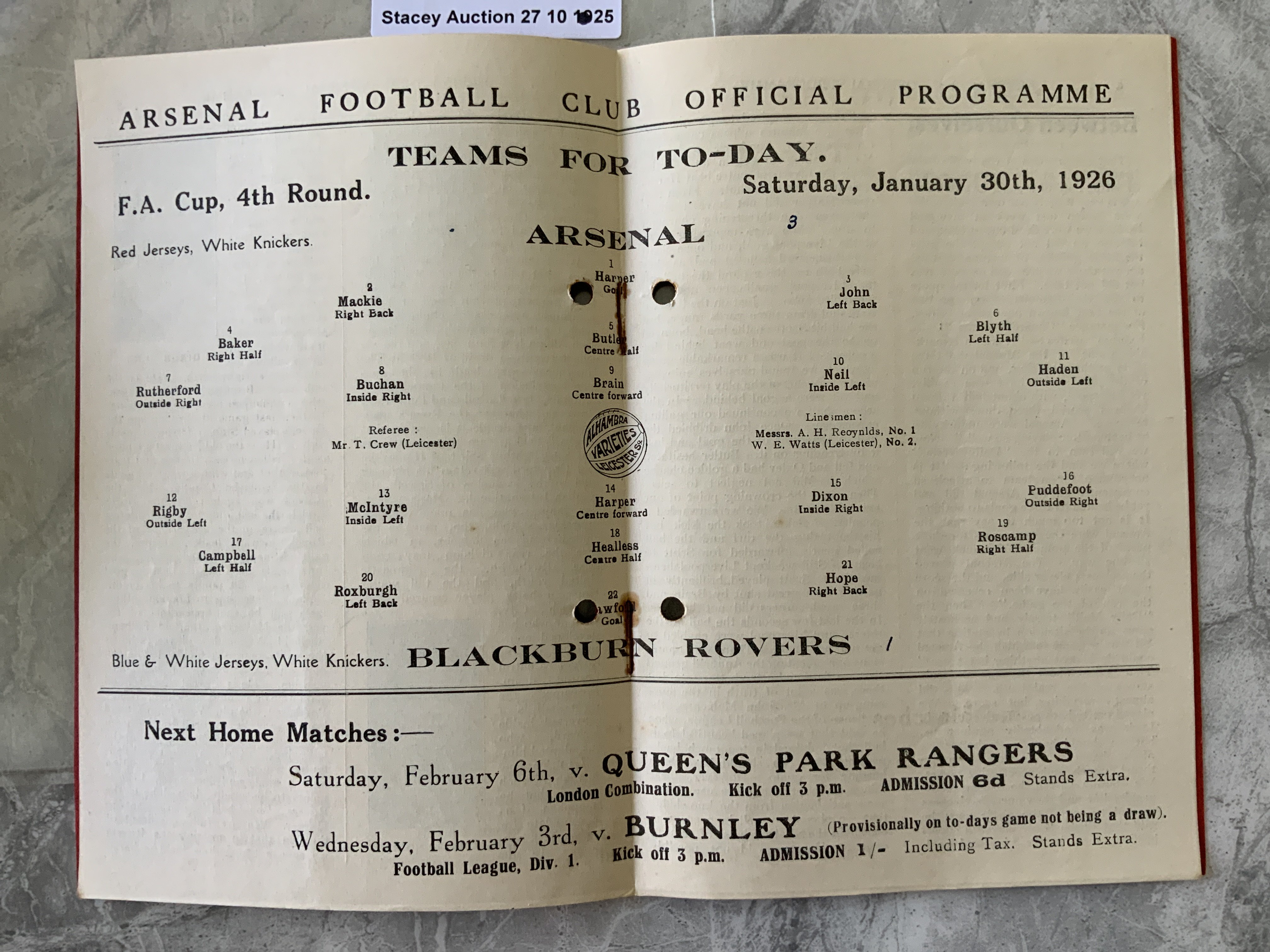 1925 - 1926 Arsenal v Blackburn Rovers Football Programme: Fair condition FA Cup match dated 30 1 1926. Punch holes. Rusty staples holding firm. No team changes but score written inside. Slight creasing.