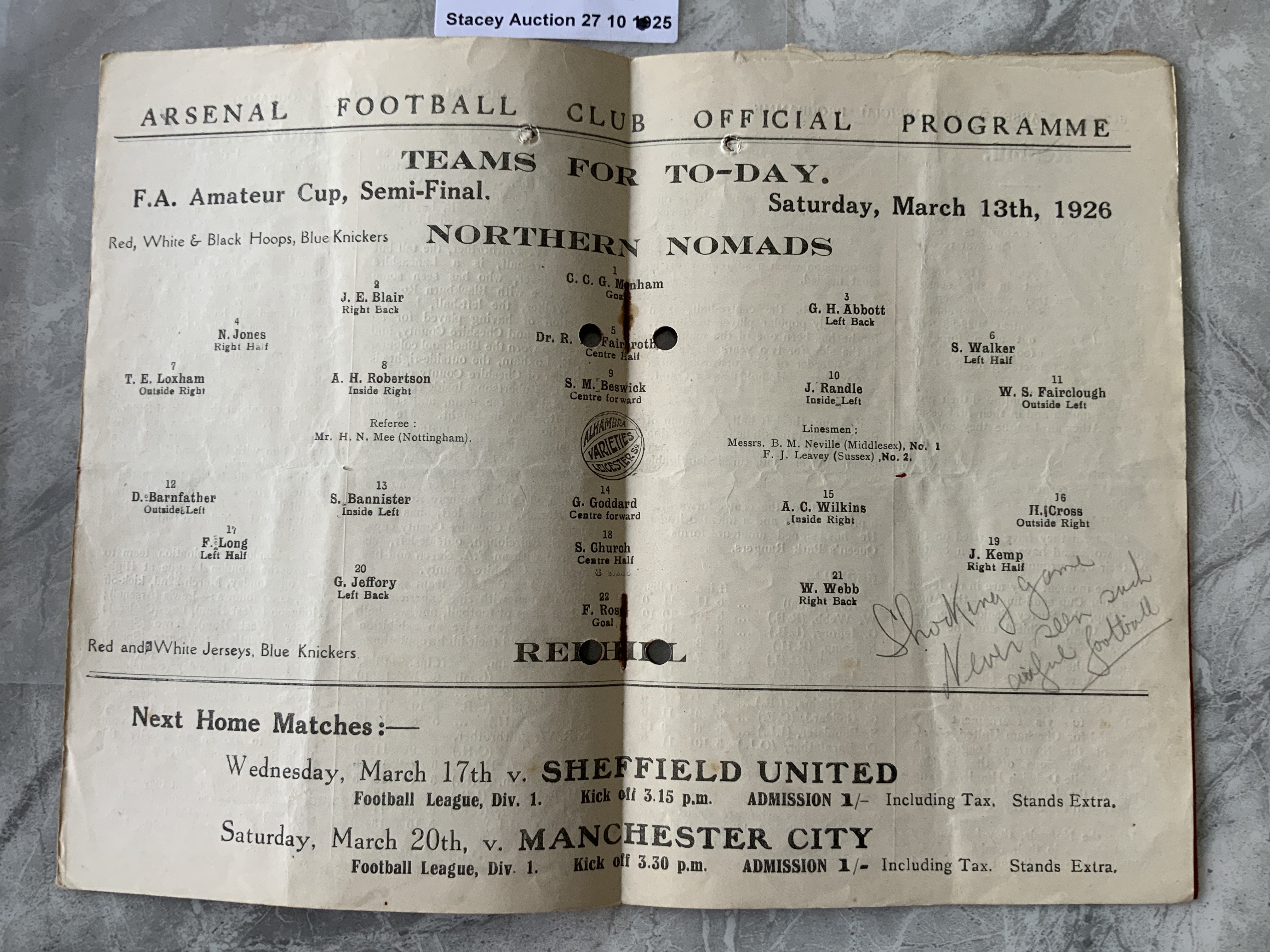 1925 - 1926 Amateur Cup Semi Final Football Programme: Northern Nomads v Redhill played at Arsenal in fair condition dated 13 3 1926. Punch holes. Rusty staples holding firm. No team changes but pencilled are the words shocking game never seen such awful football. Redhill went on to win the cup. (100 years later im saying the same about West Ham).