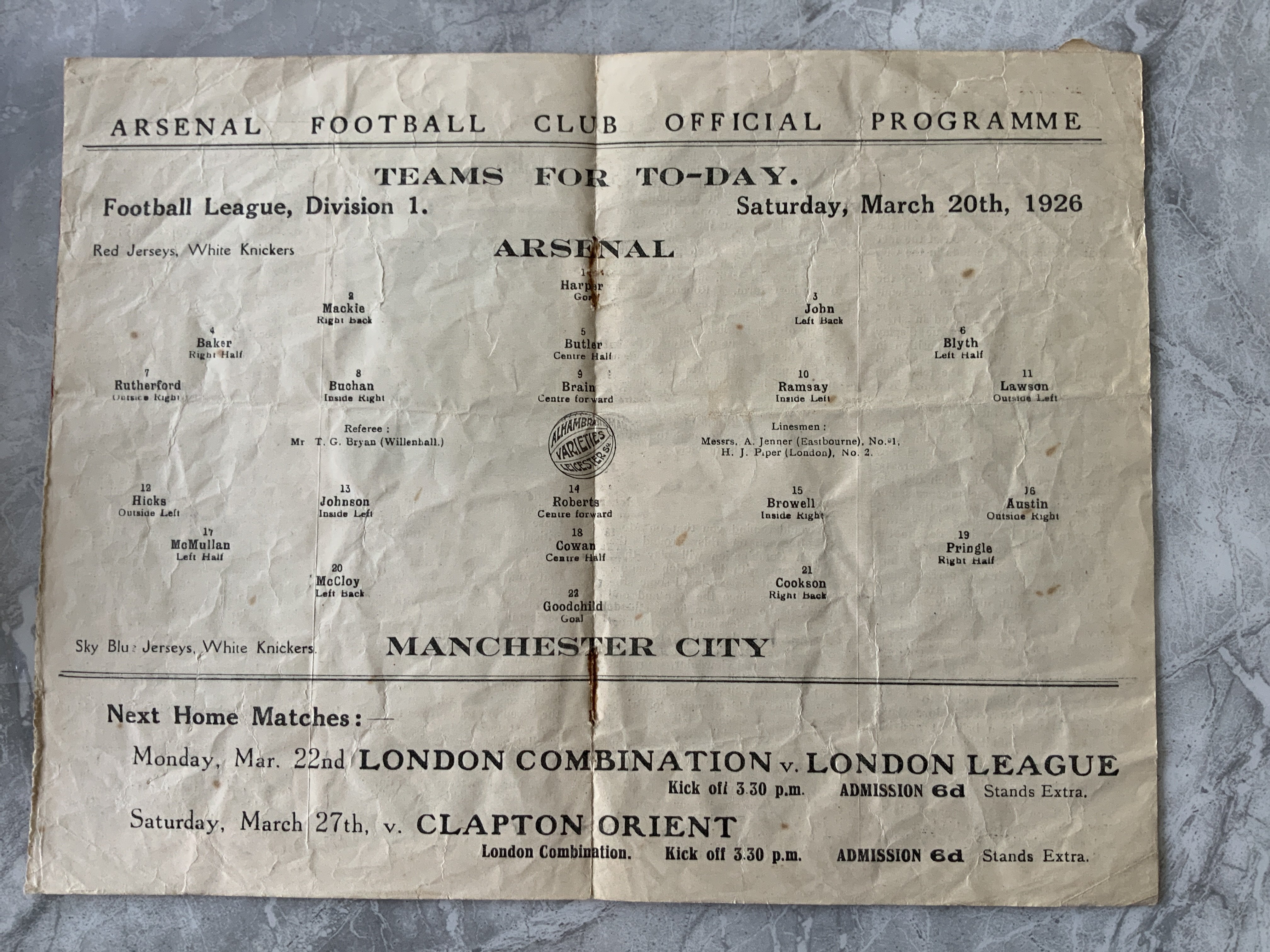 1925 - 1926 Arsenal v Manchester City Football Programme: Good condition league match dated 20 3 1926. Staples removed not rotted away. No team changes. Creasing.