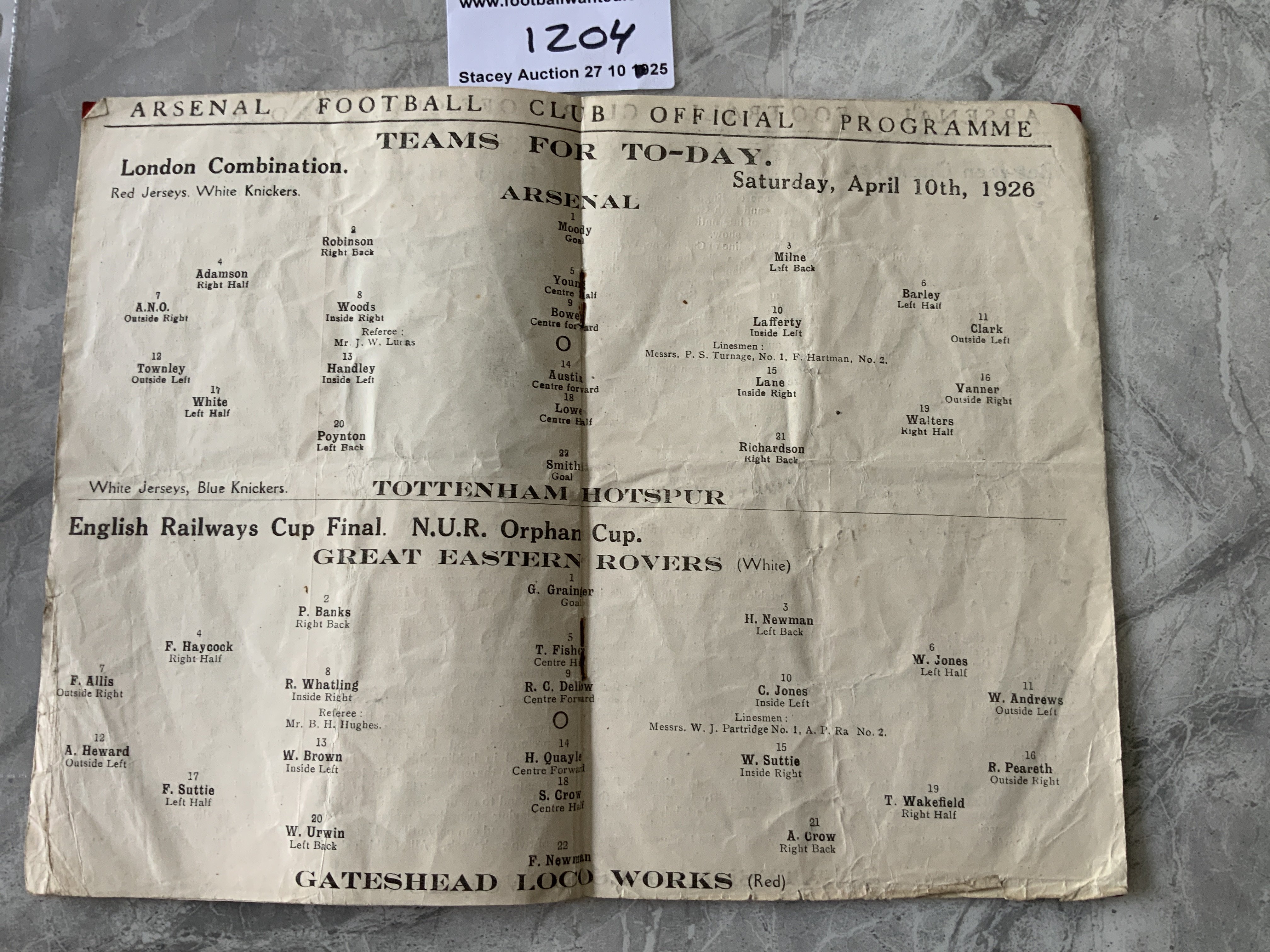 1925 - 1926 Arsenal v Tottenham Reserves Football Programme: Good condition which doubles up as the Railway Cup Final match between Great Eastern Rovers and Gateshead Loco Works. Dated 10 4 1926. Slight creasing. No team changes.