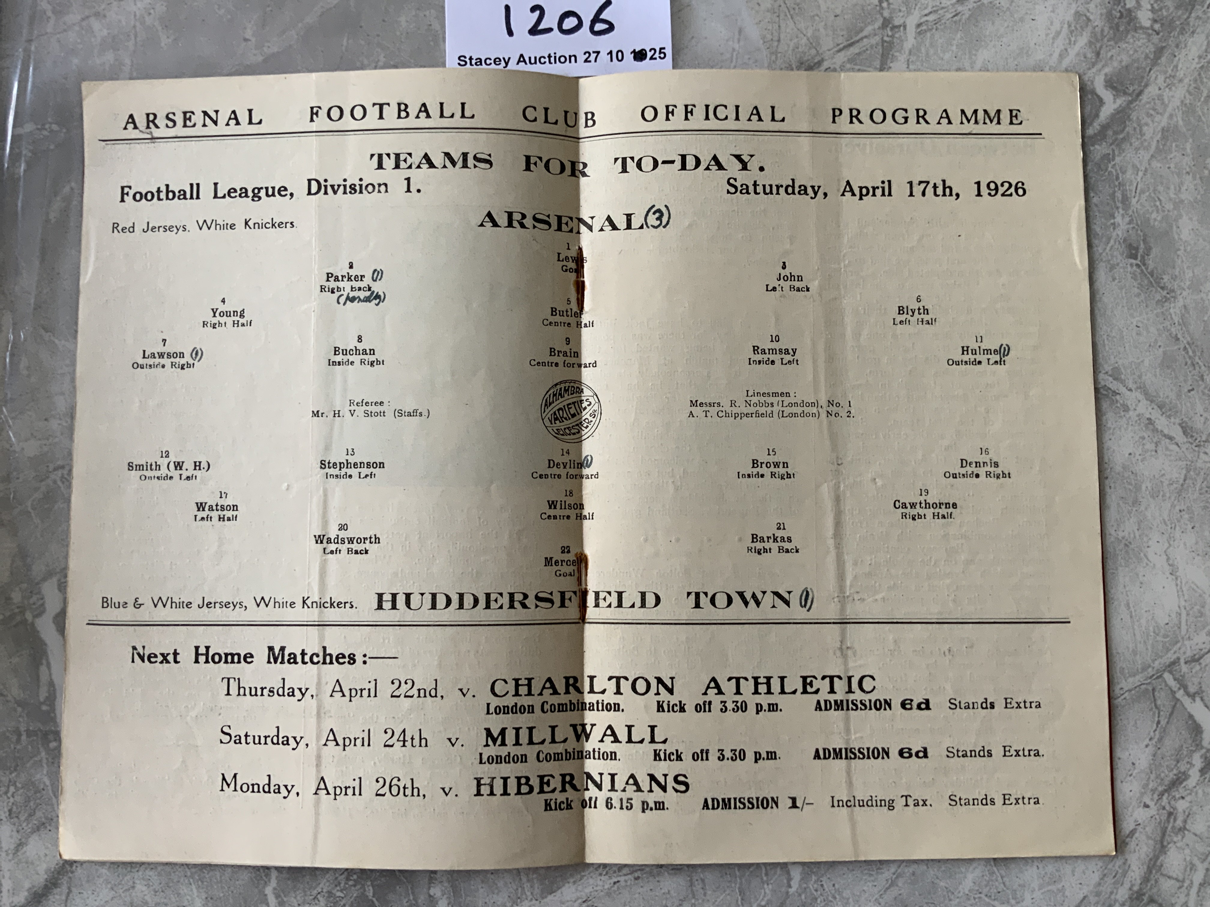1925 - 1926 Arsenal v Huddersfield ( Champions ) Football Programme: Excellent condition league match dated 17 4 1926. Team change and scorers noted to centre page. Tiny scuff to rear.