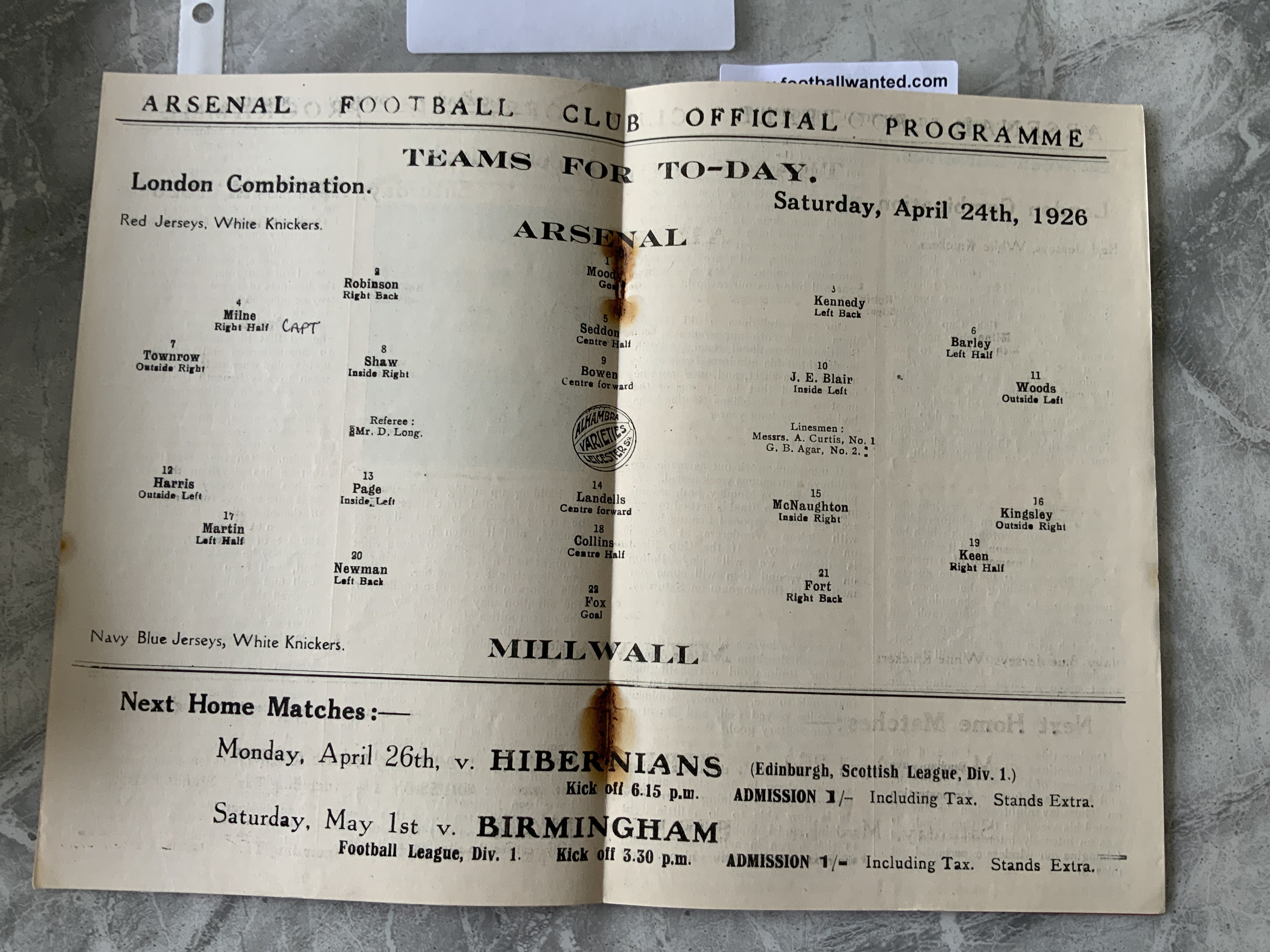 1925 - 1926 Arsenal v Millwall Reserves Football Programme: Good condition London Combination match dated 24 4 1926. Rusty staples removed leaving rust marks. No team changes but word capt written to team page.