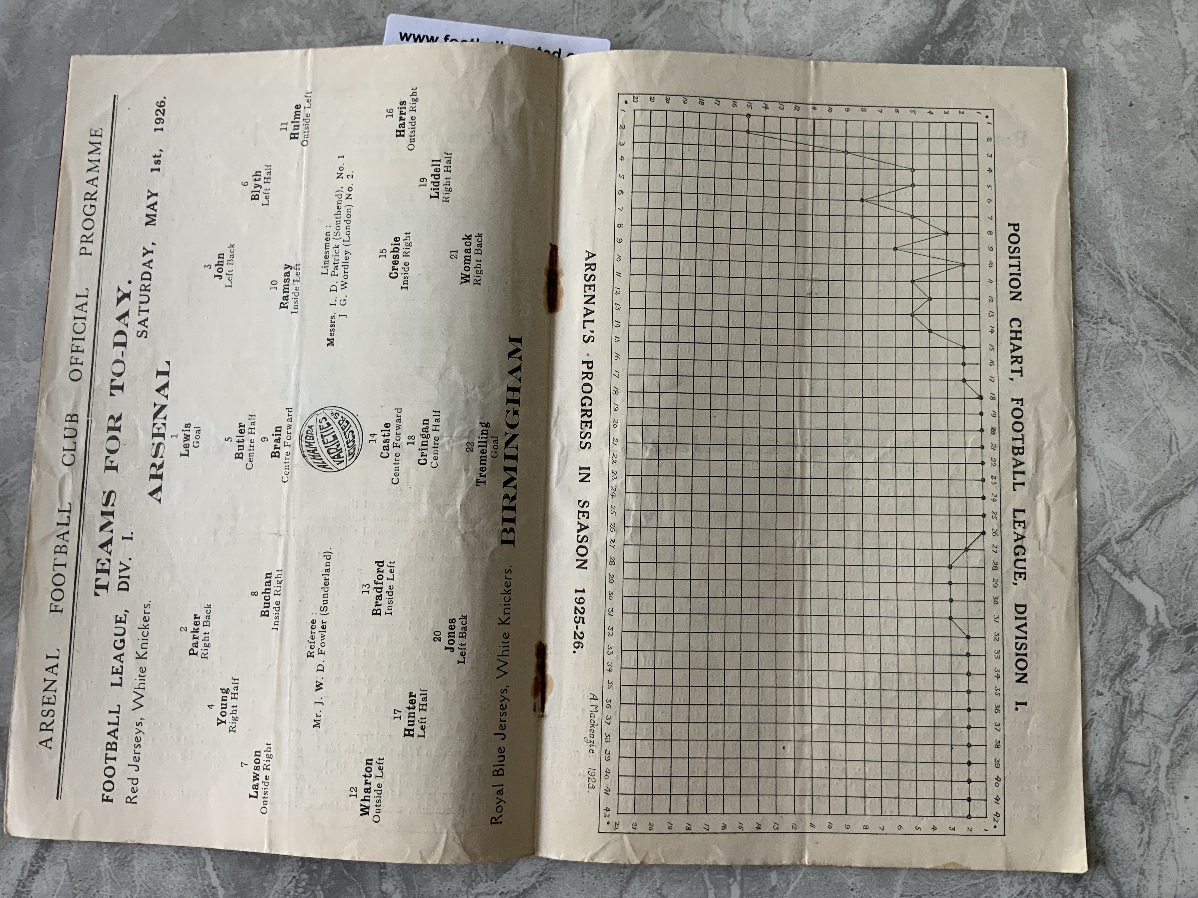 1925 - 1926 Arsenal v Birmingham City Football Programme: Good condition league match dated 1 5 1926. Rusty staples holding firm. No team changes.