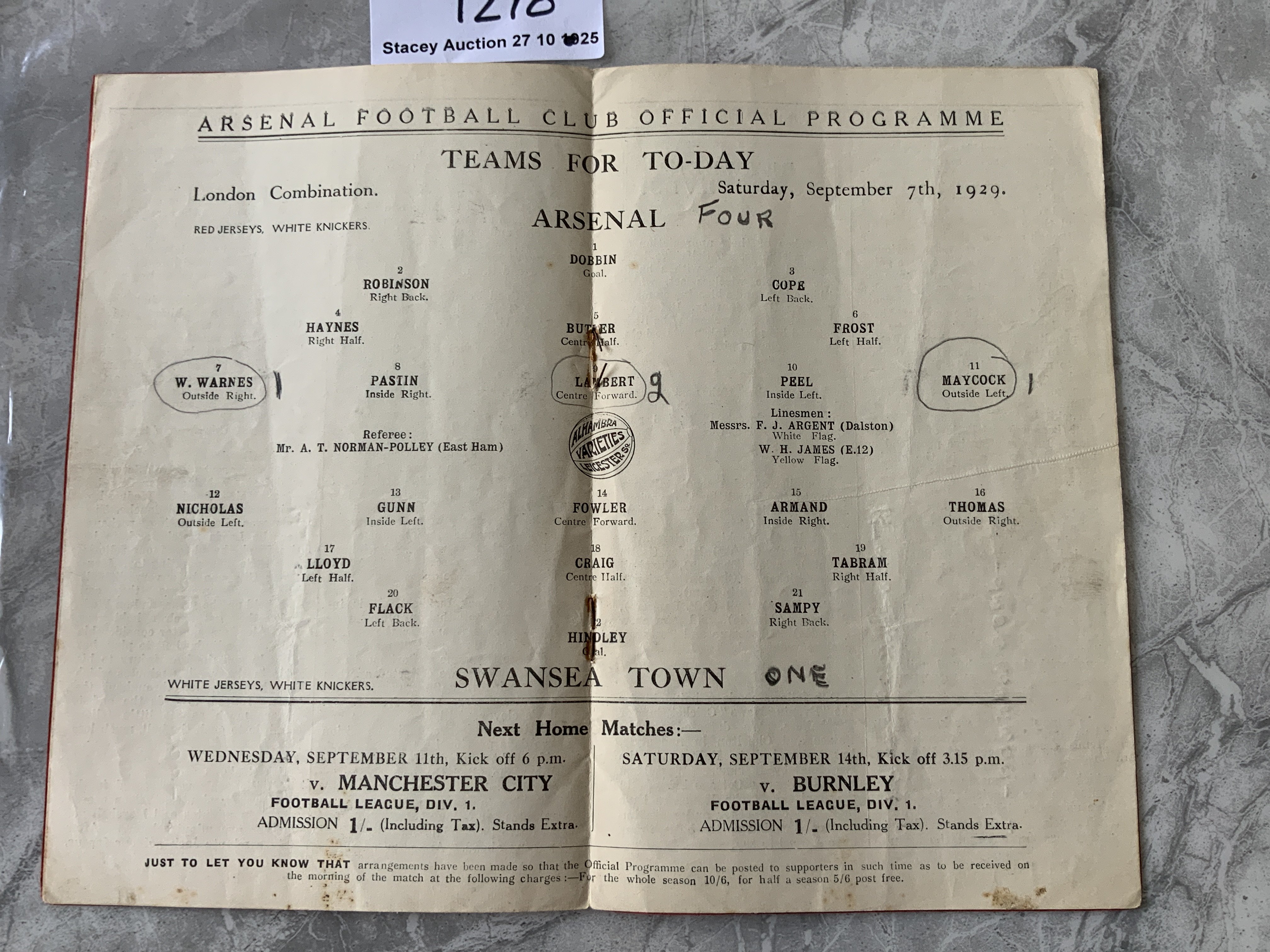 1929 - 1930 Arsenal v Swansea Reserves Football Programme: Good condition London Combination match dated 7 9 1929. Pencilled team changes.