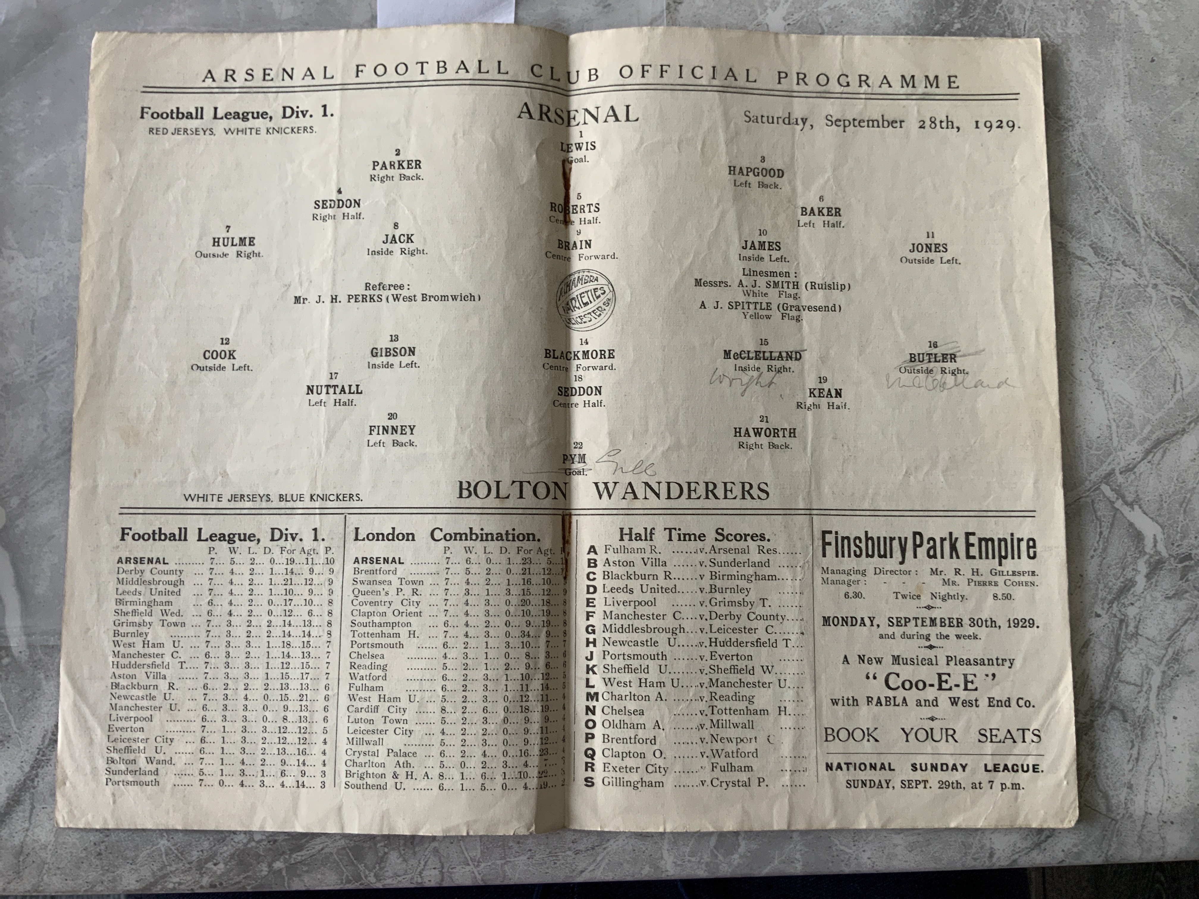 1929 - 1930 Arsenal v Bolton Wanderers Football Programme: Good condition league match dated 28 9 1929. Pencilled team changes.