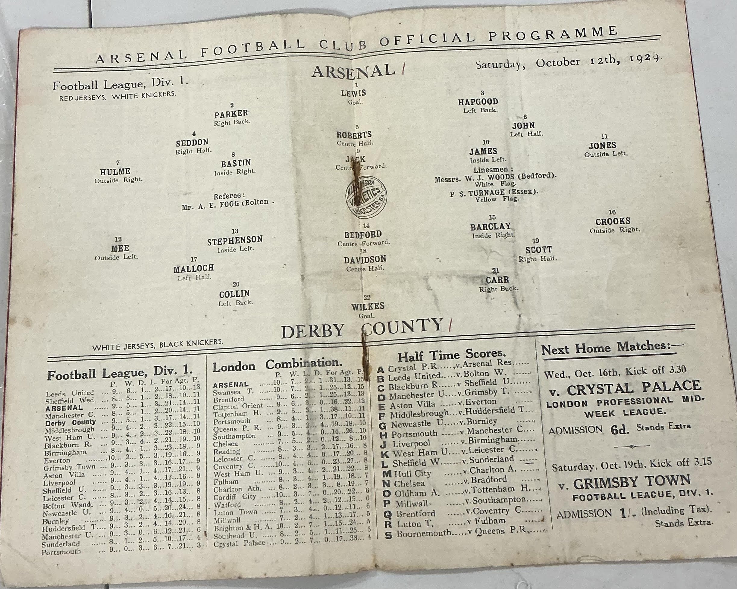 1929 - 1930 Arsenal v Derby County Football Programme: Good condition league match dated 12 10 1929. Slightly rusty staples.