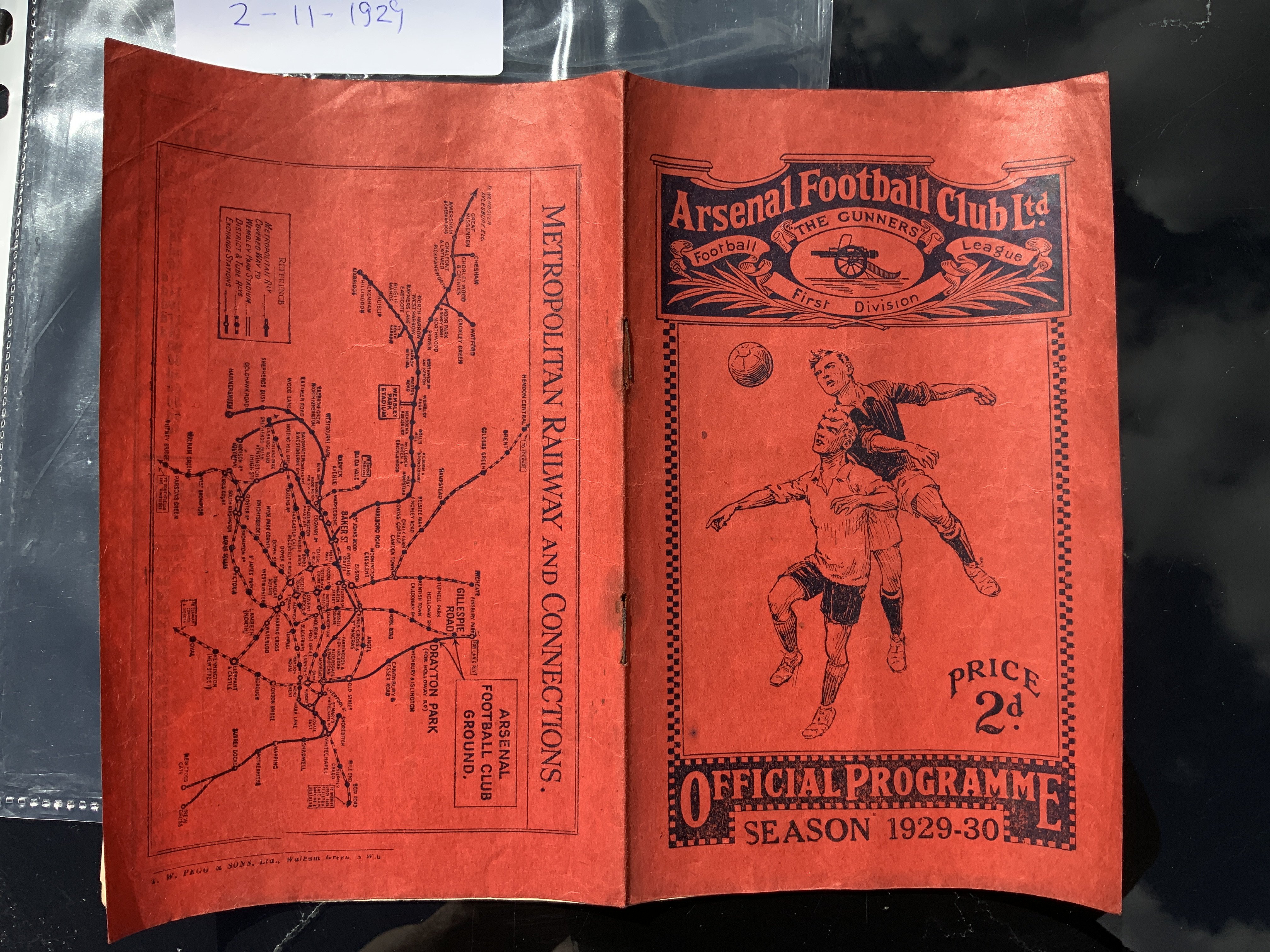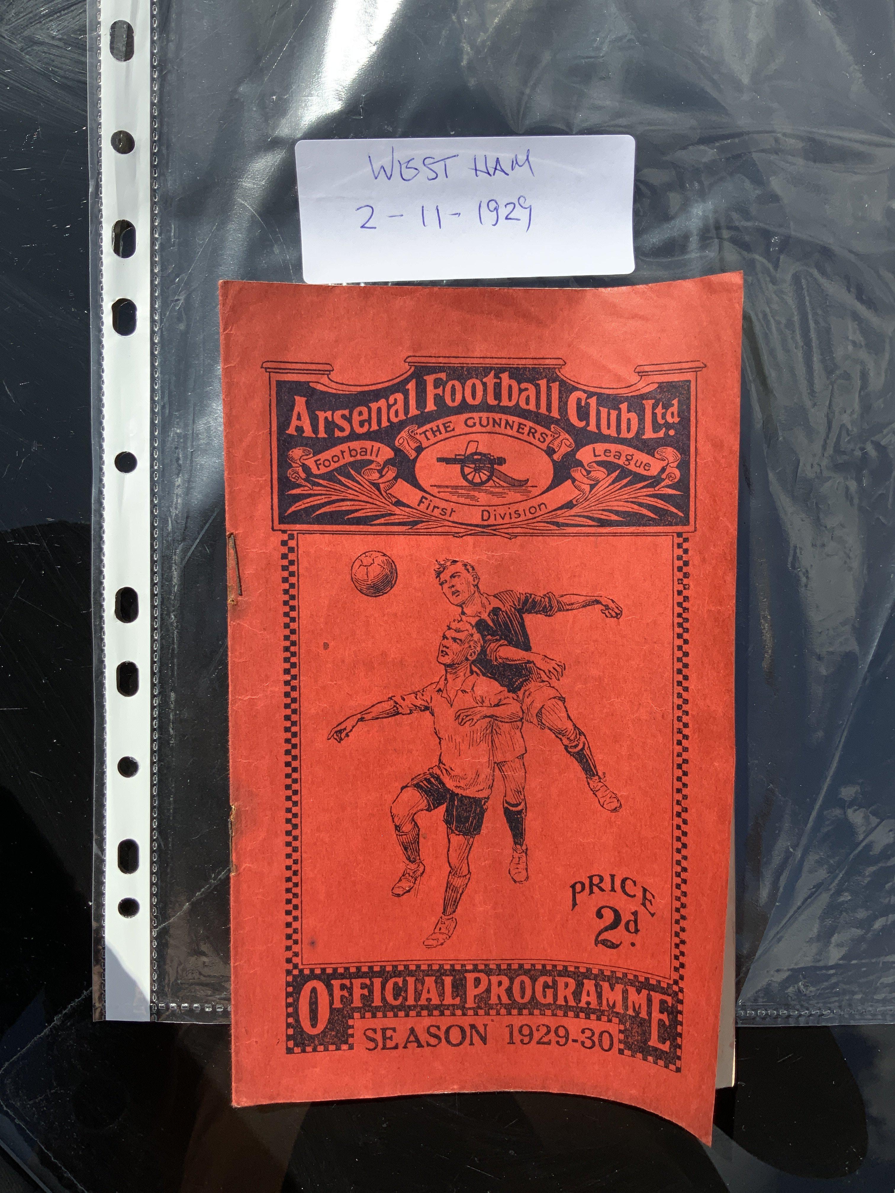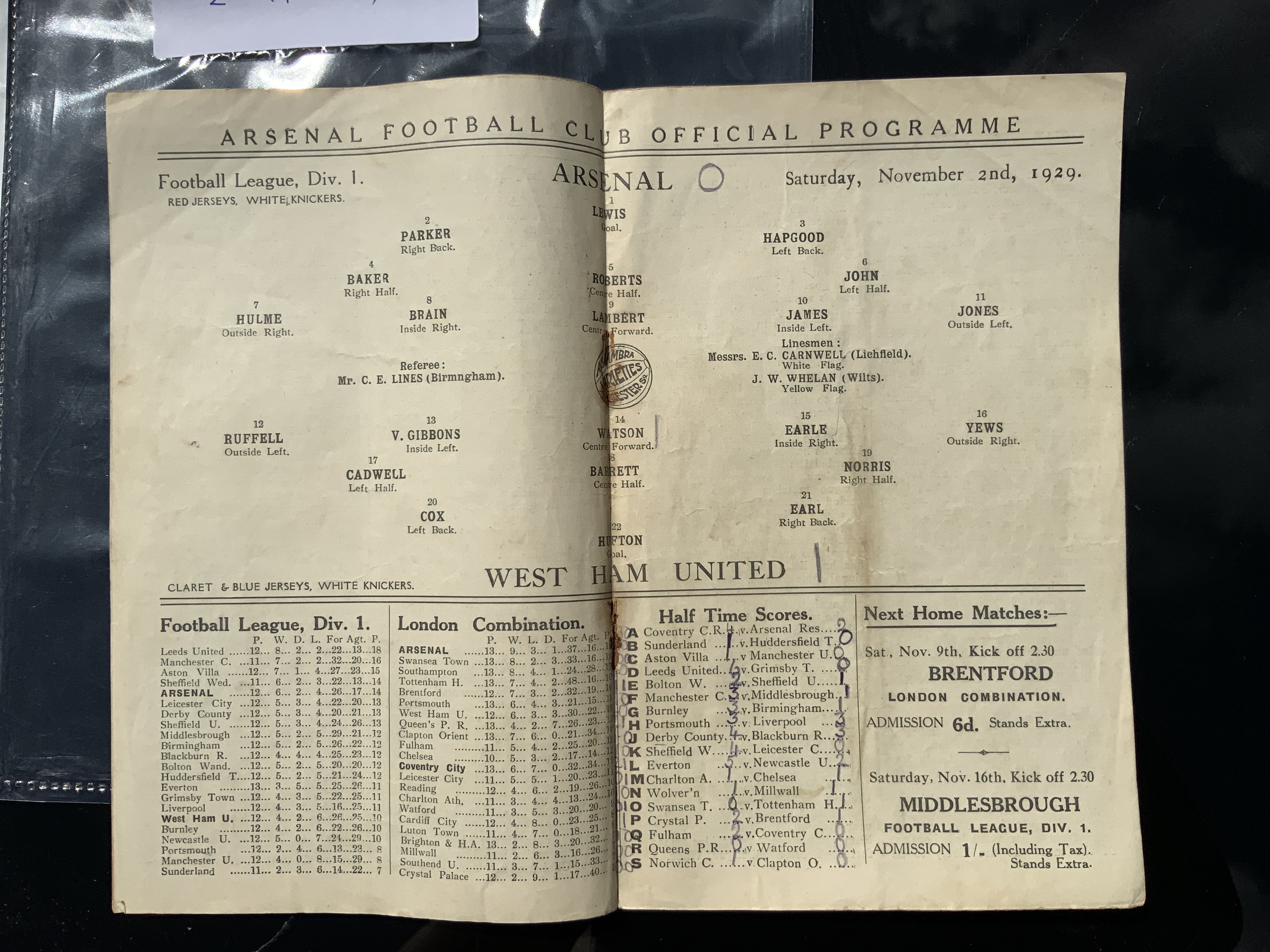 1929 - 1930 Arsenal v West Ham Football Programme: Good condition league match dated 2 11 1929. No team changes. Rusty staples making pages loose but not rotting paper. Pencilled score and half times.