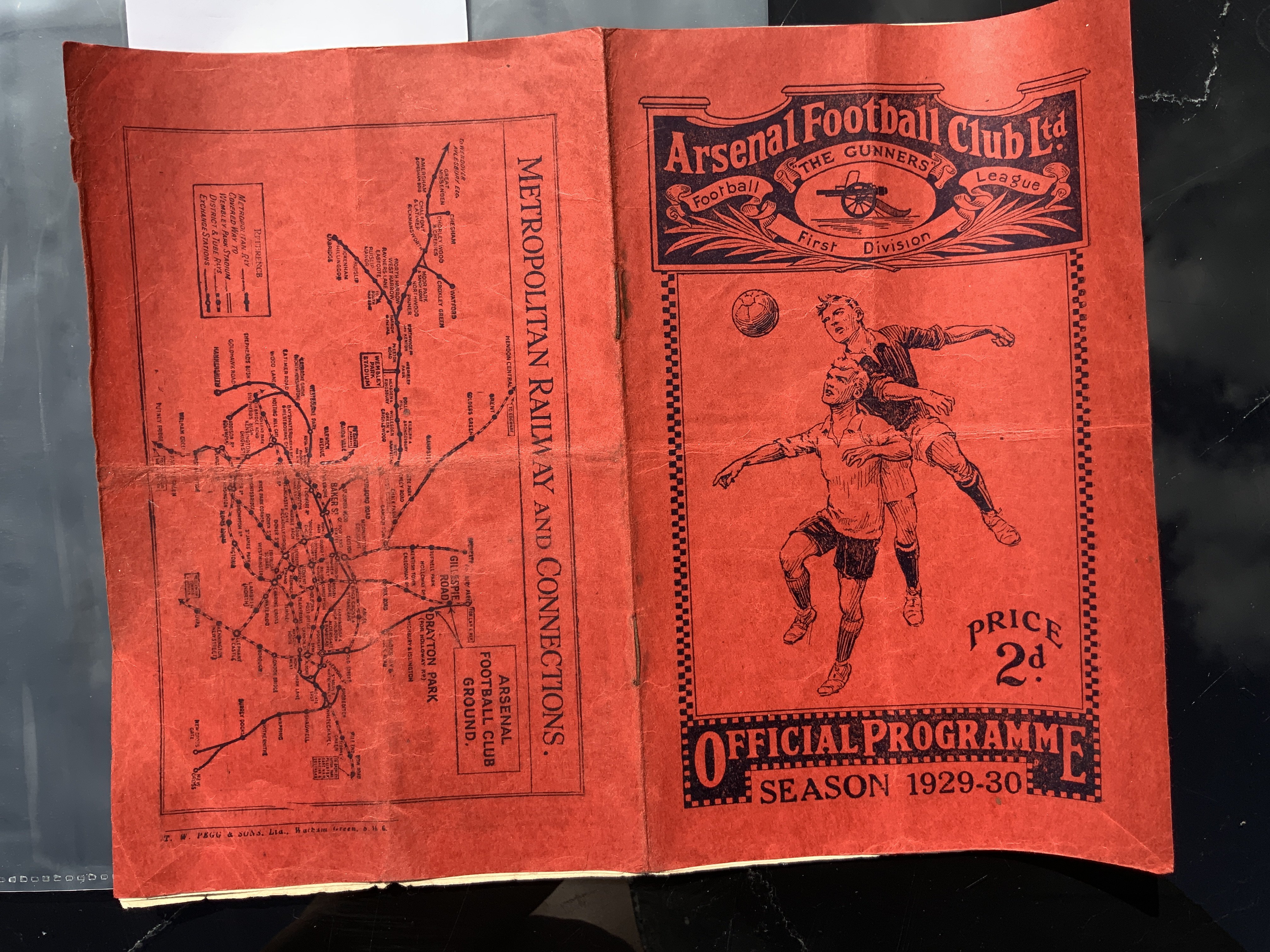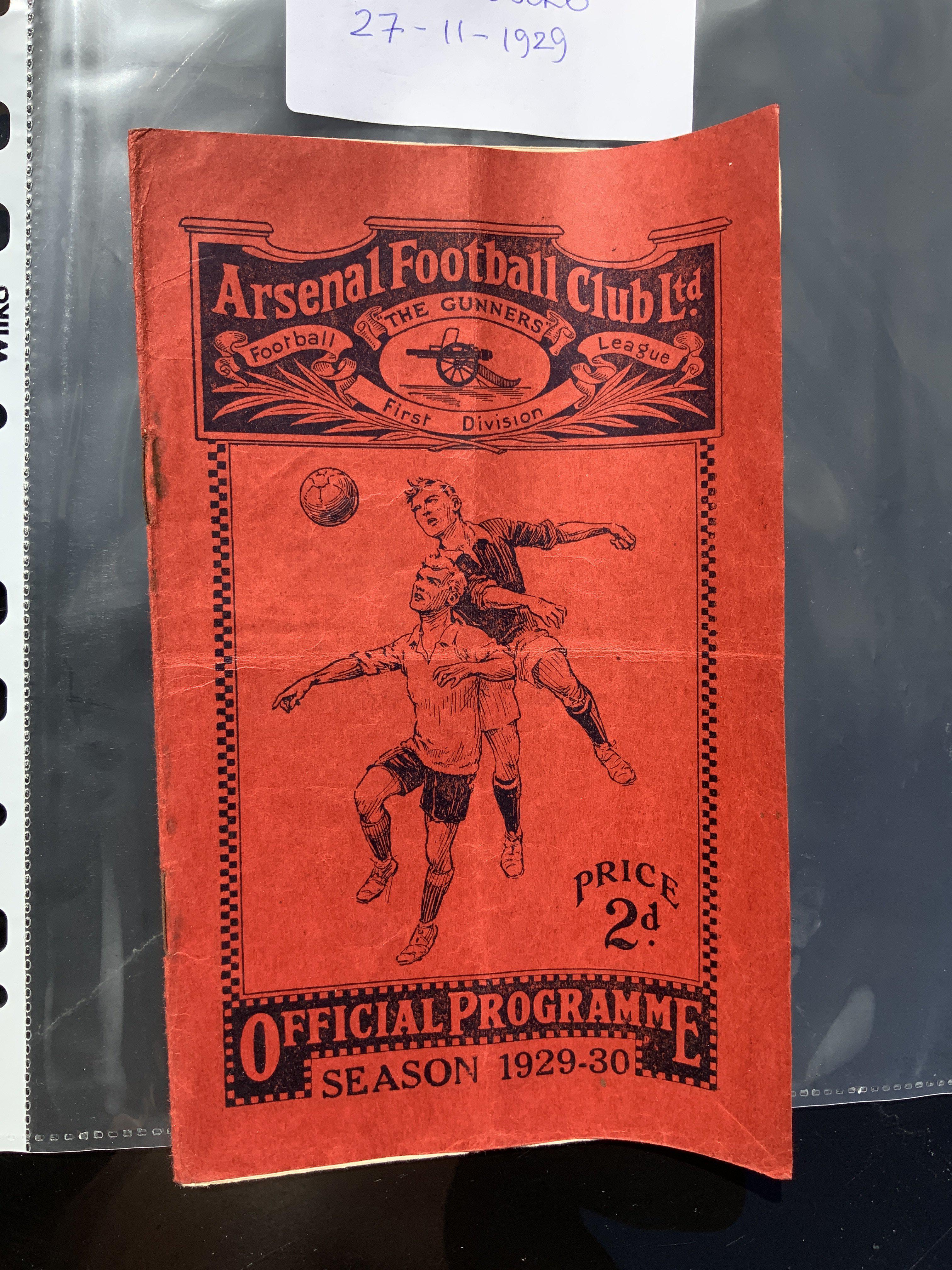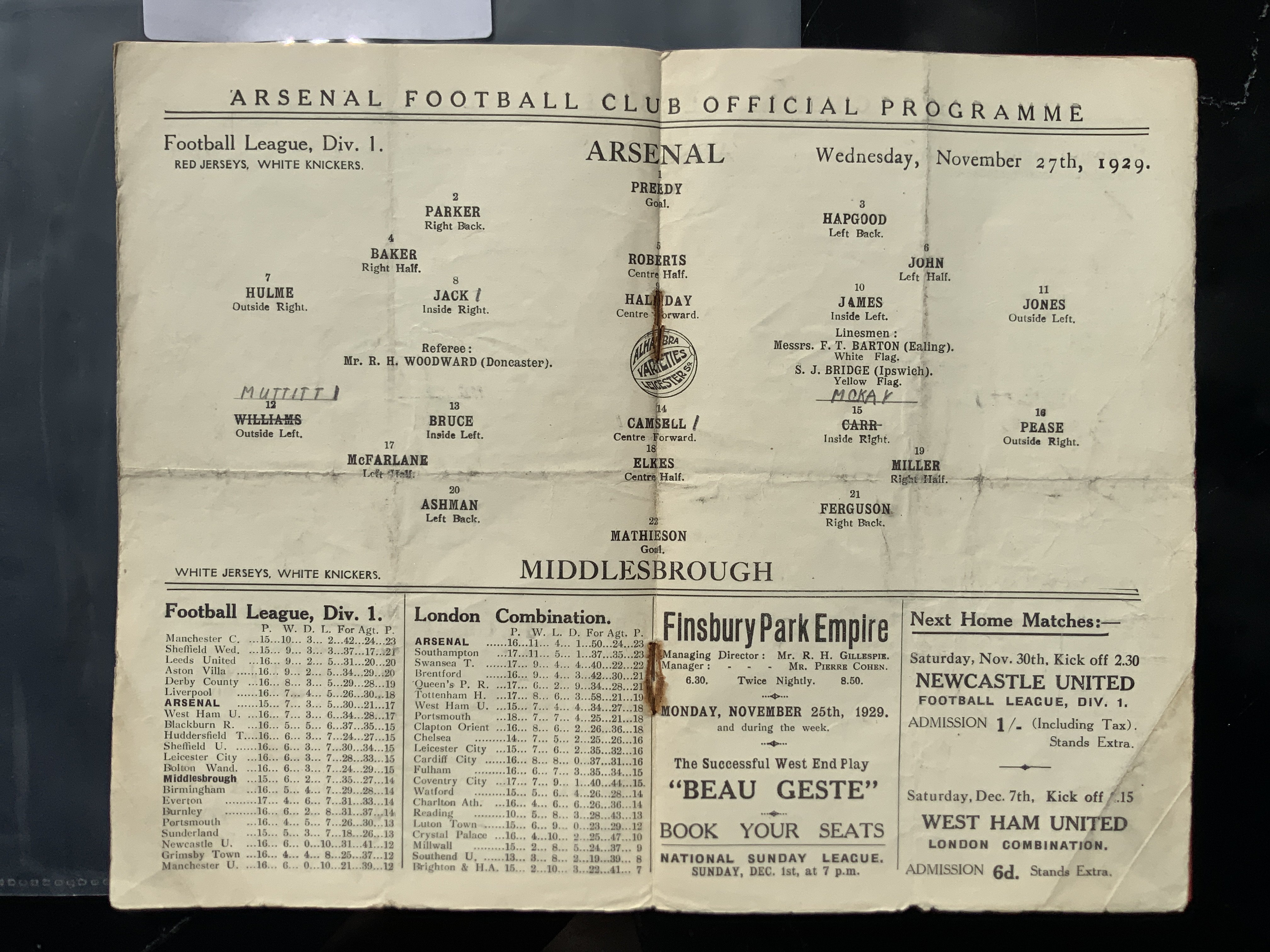 1929 - 1930 Arsenal v Middlesbrough Football Programme: Good condition league match dated 27 11 1929. Pencilled team changes. Rusty staples holding firm. Fold.