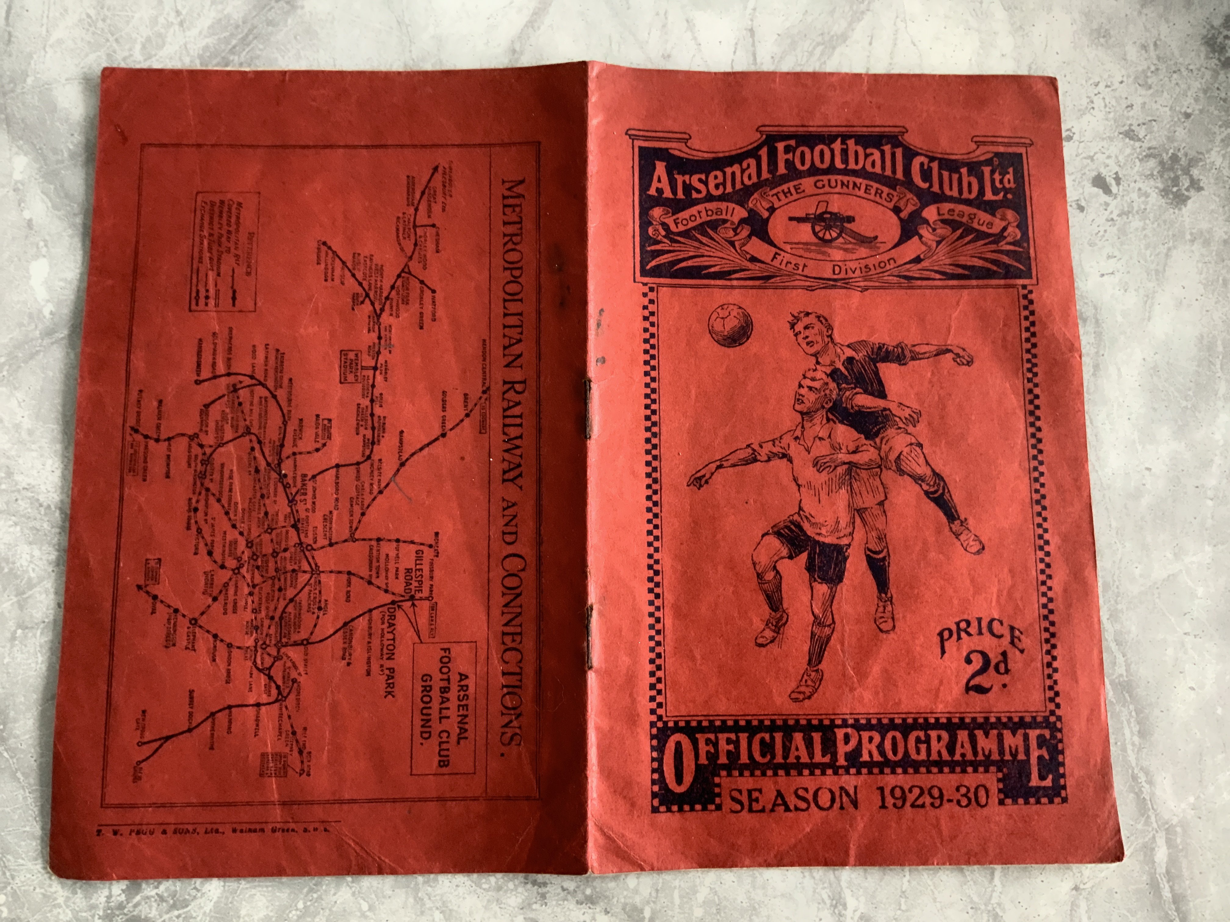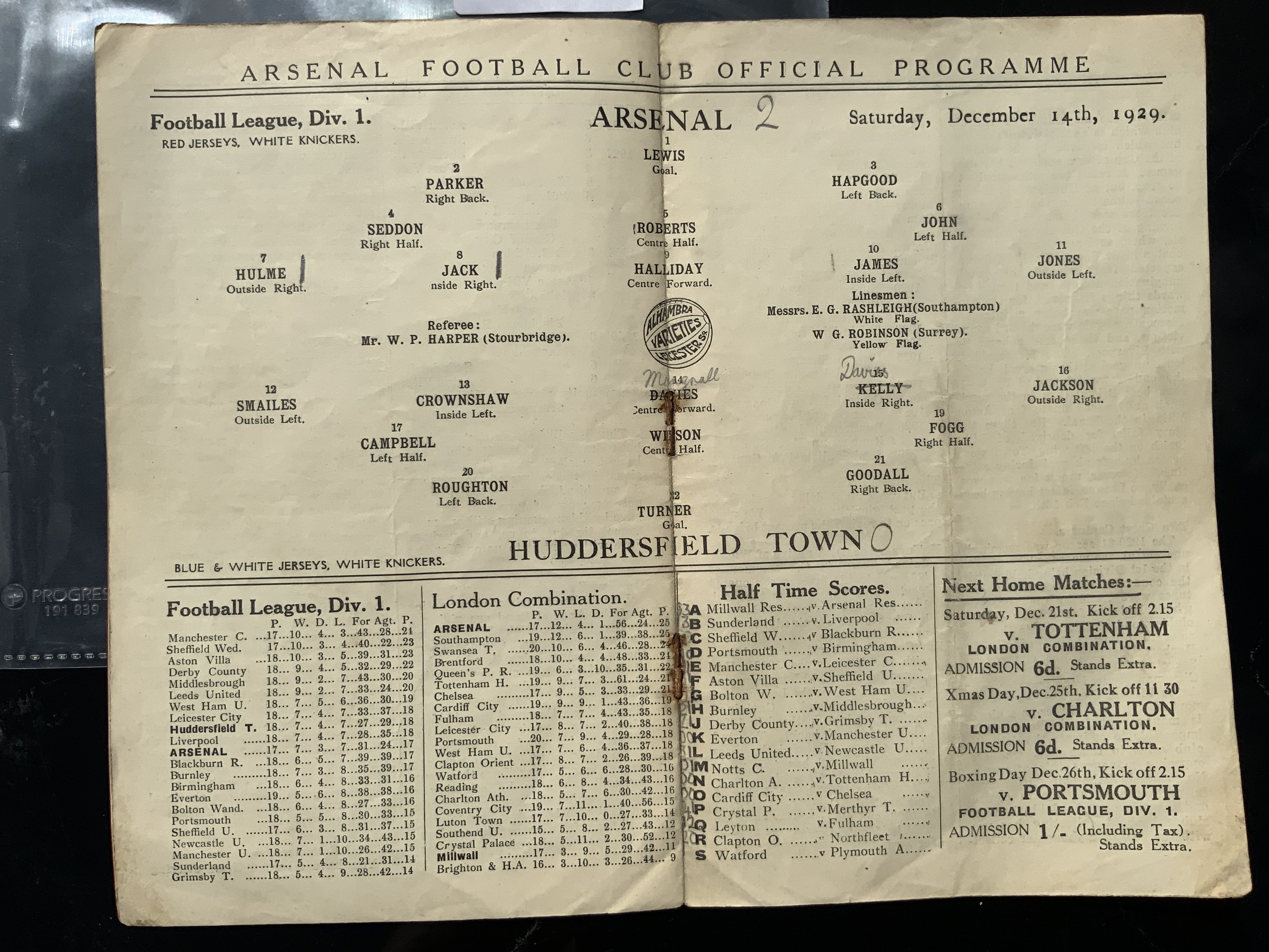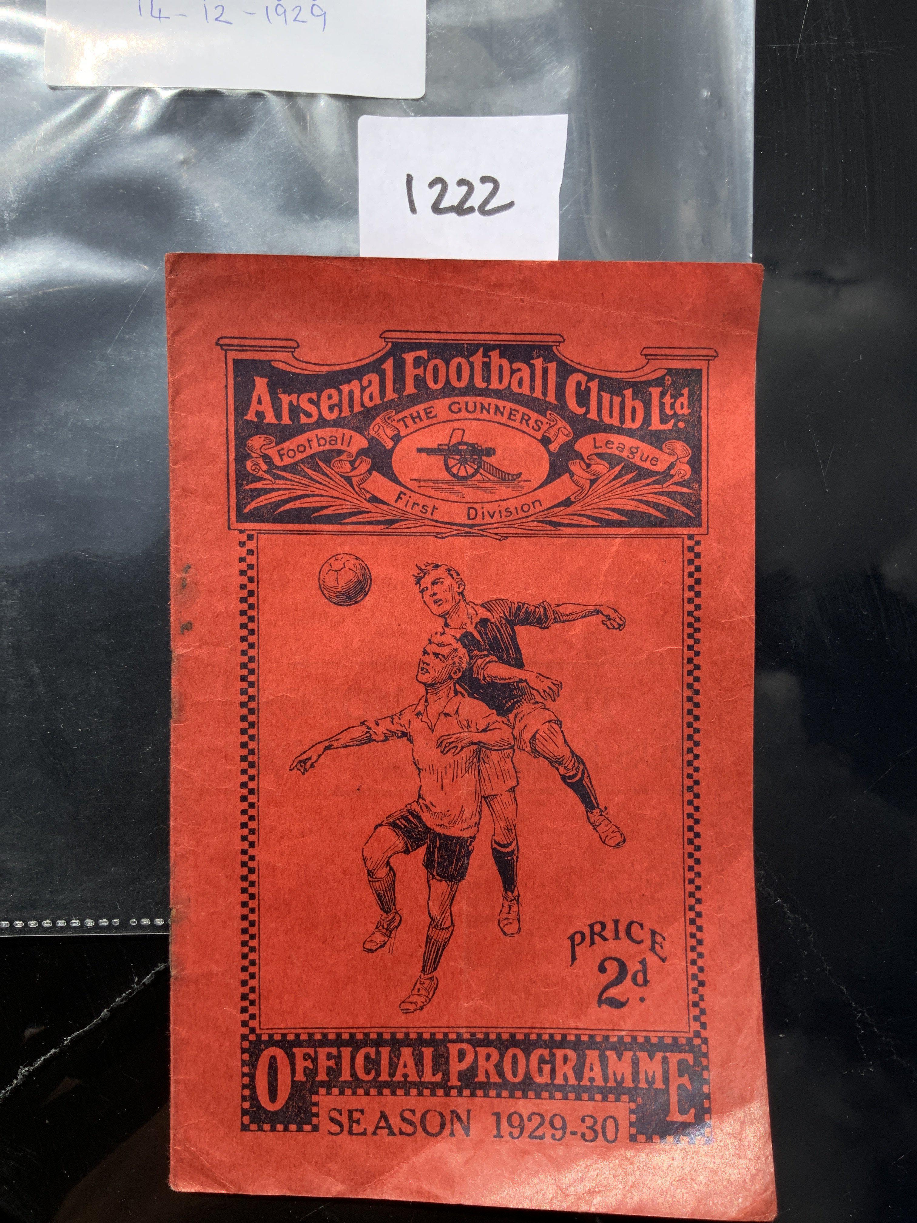 1929 - 1930 Arsenal v Huddersfield Town Football Programme: Good condition league match dated 14 12 1929. No team changes. Pencilled score and scorers noted. Rusty staples holding firm.