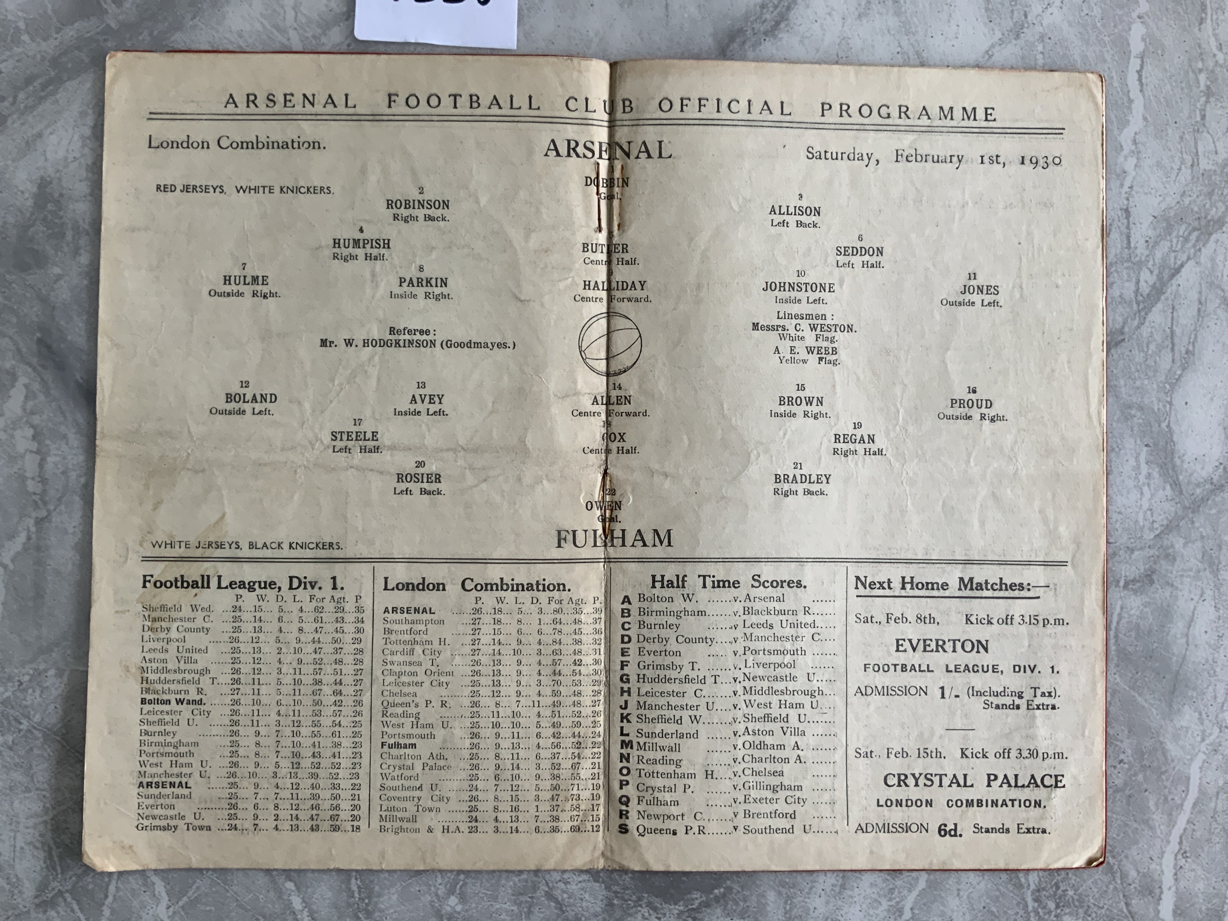 1929 - 1930 Arsenal v Fulham Reserves Football Programme: Excellent condition London Combination match dated 1 2 1930. No team changes.