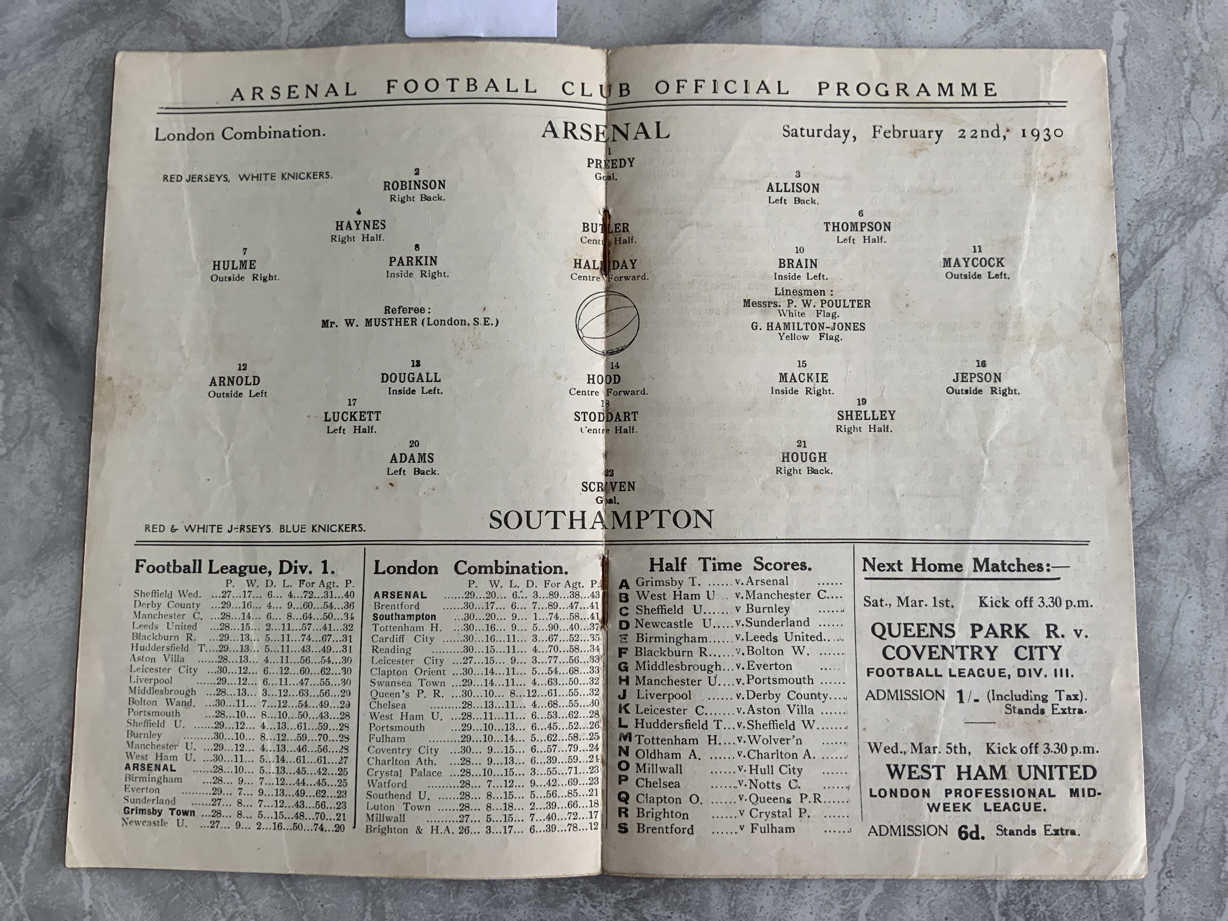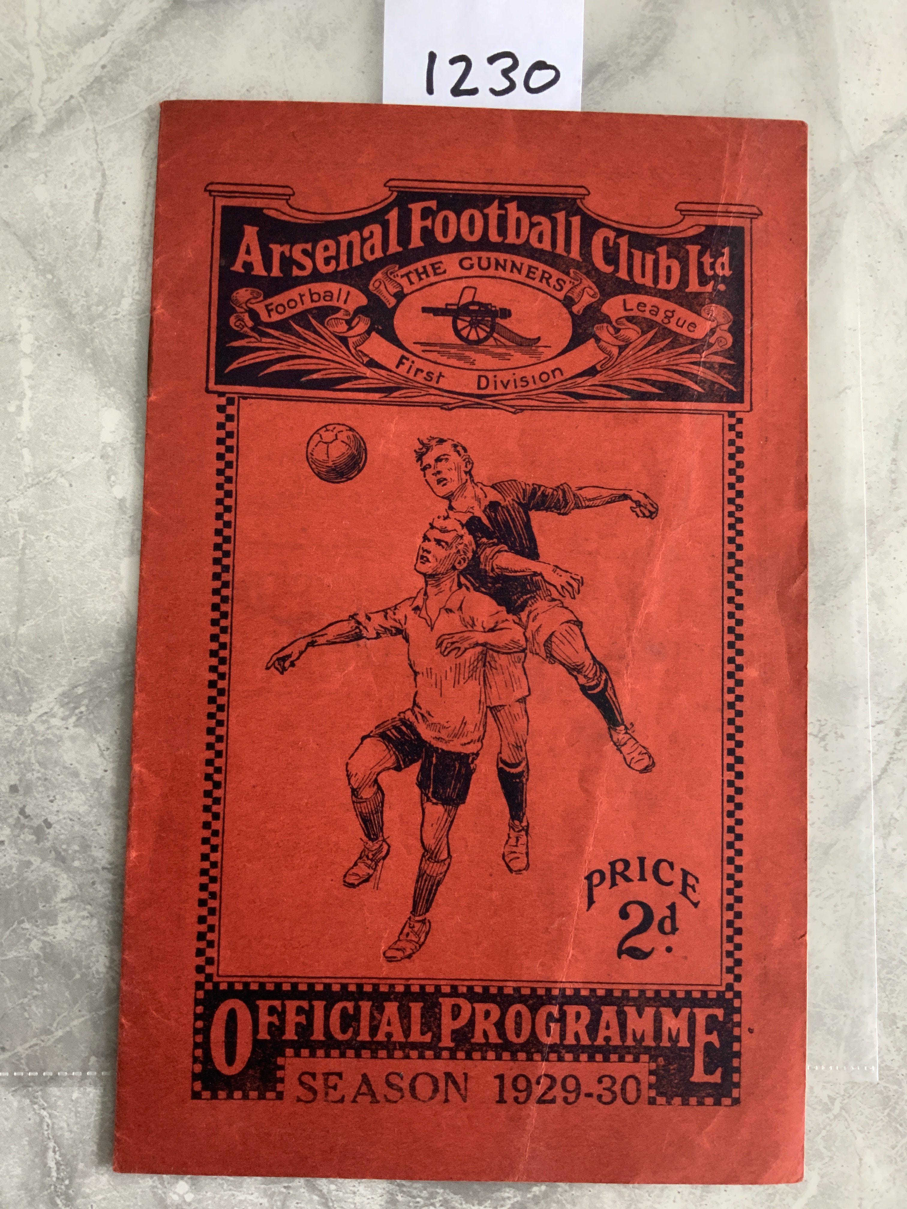 1929 - 1930 Arsenal v Southampton Reserves Football Programme: Excellent condition London Combination match dated 22 2 1930. No team changes.