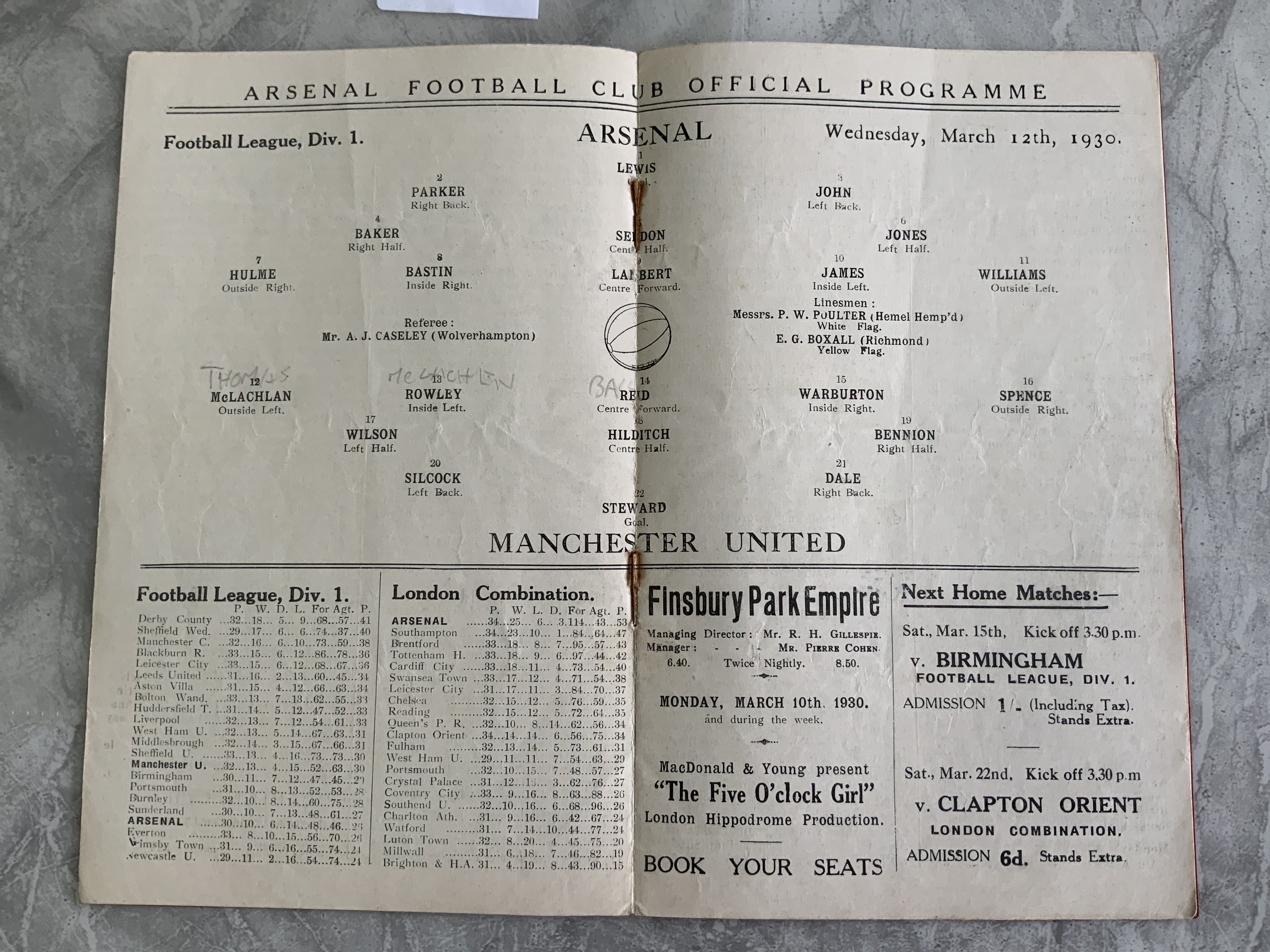 1929 - 1930 Arsenal v Manchester United Football Programme: Excellent condition league match dated 12 3 1930. Pencilled team changes.