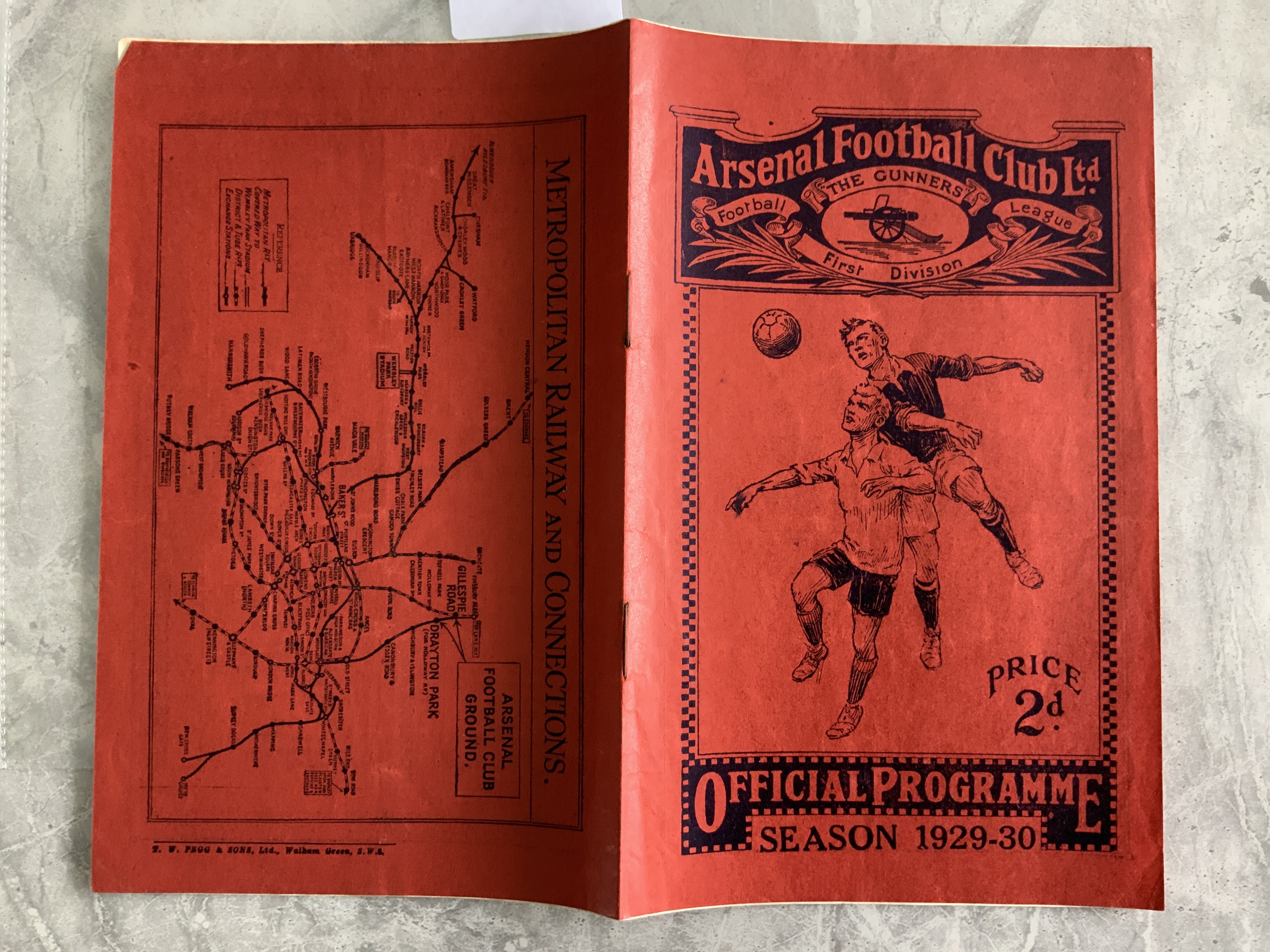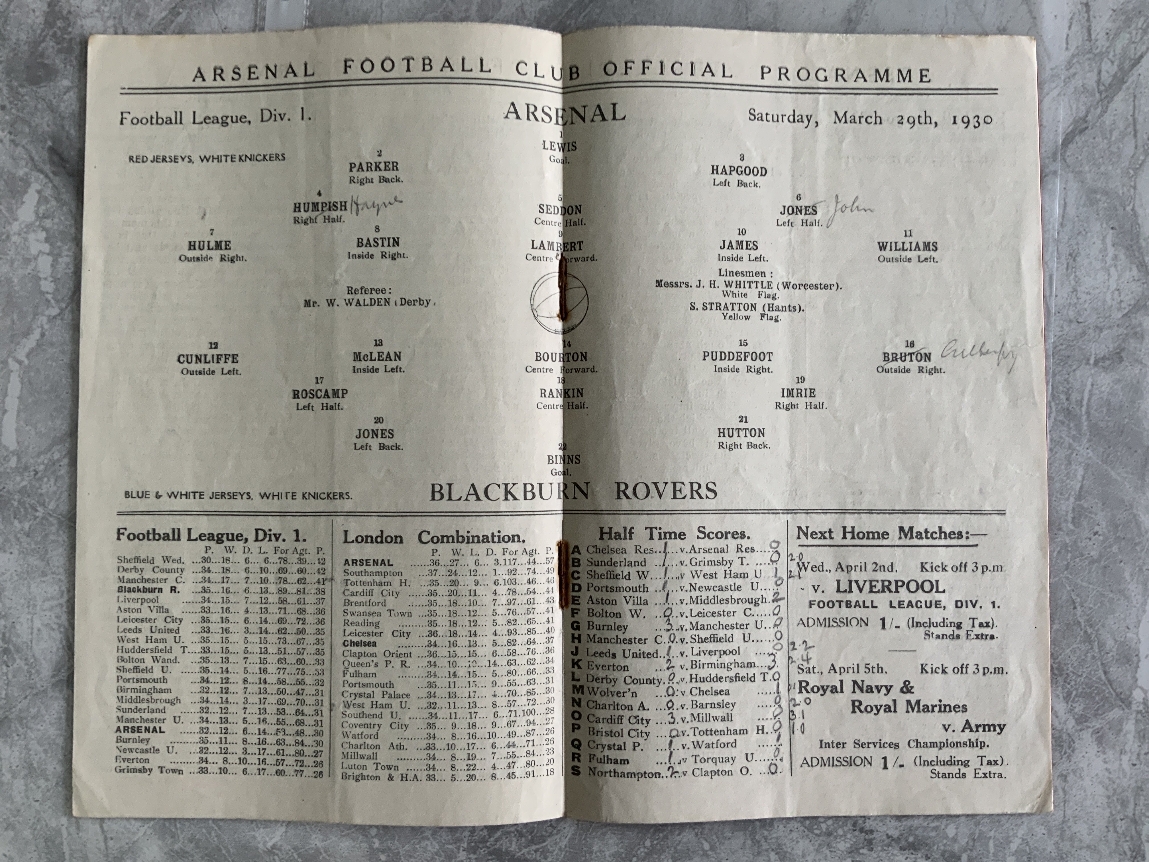 1929 - 1930 Arsenal v Blackburn Rovers Football Programme: Excellent condition league match dated 29 3 1930. Pencilled team changes. Rusty staples holding firm.