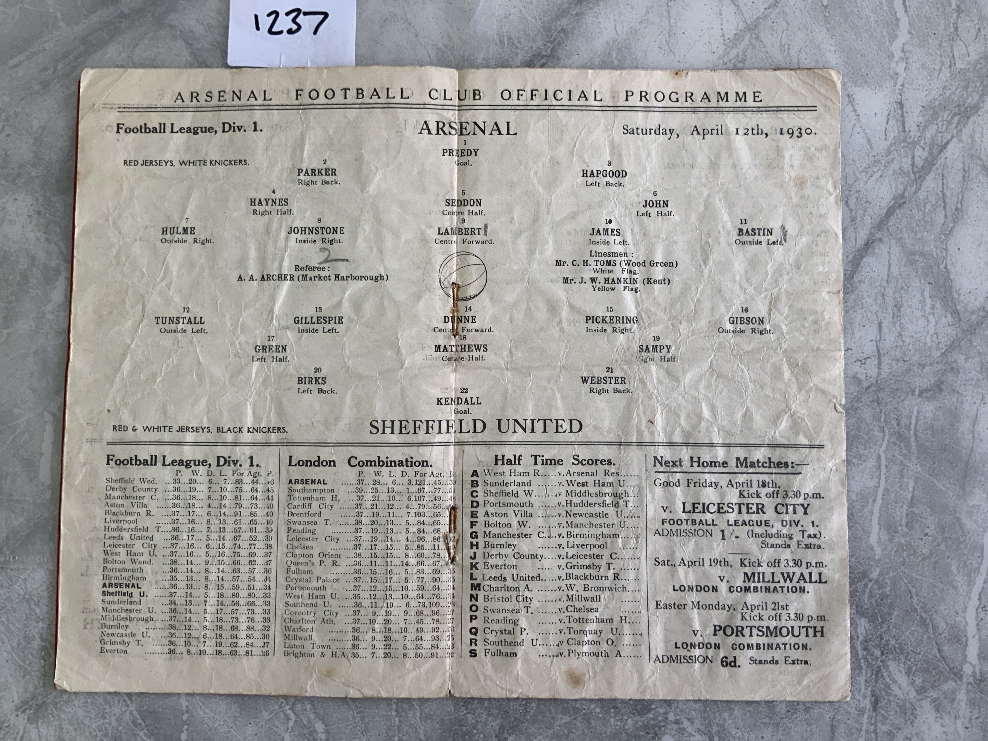 1929 - 1930 Arsenal v Sheffield United Football Programme: Good condition league match dated 12 4 1930. No team changes. Slight creasing.