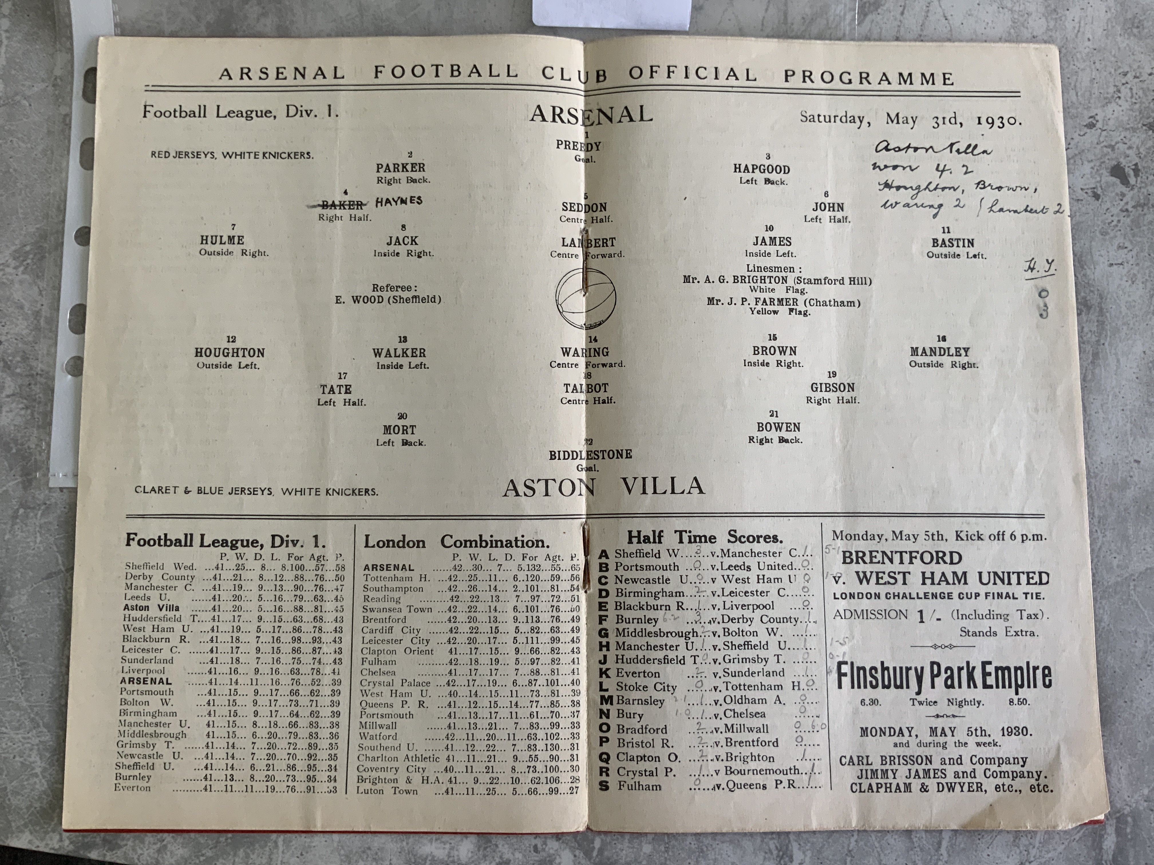 1929 - 1930 Arsenal v Aston Villa Football Programme: Excellent condition league match dated 3 5 1930. Team changes. Insert included of the FA Cup winning team with cup.