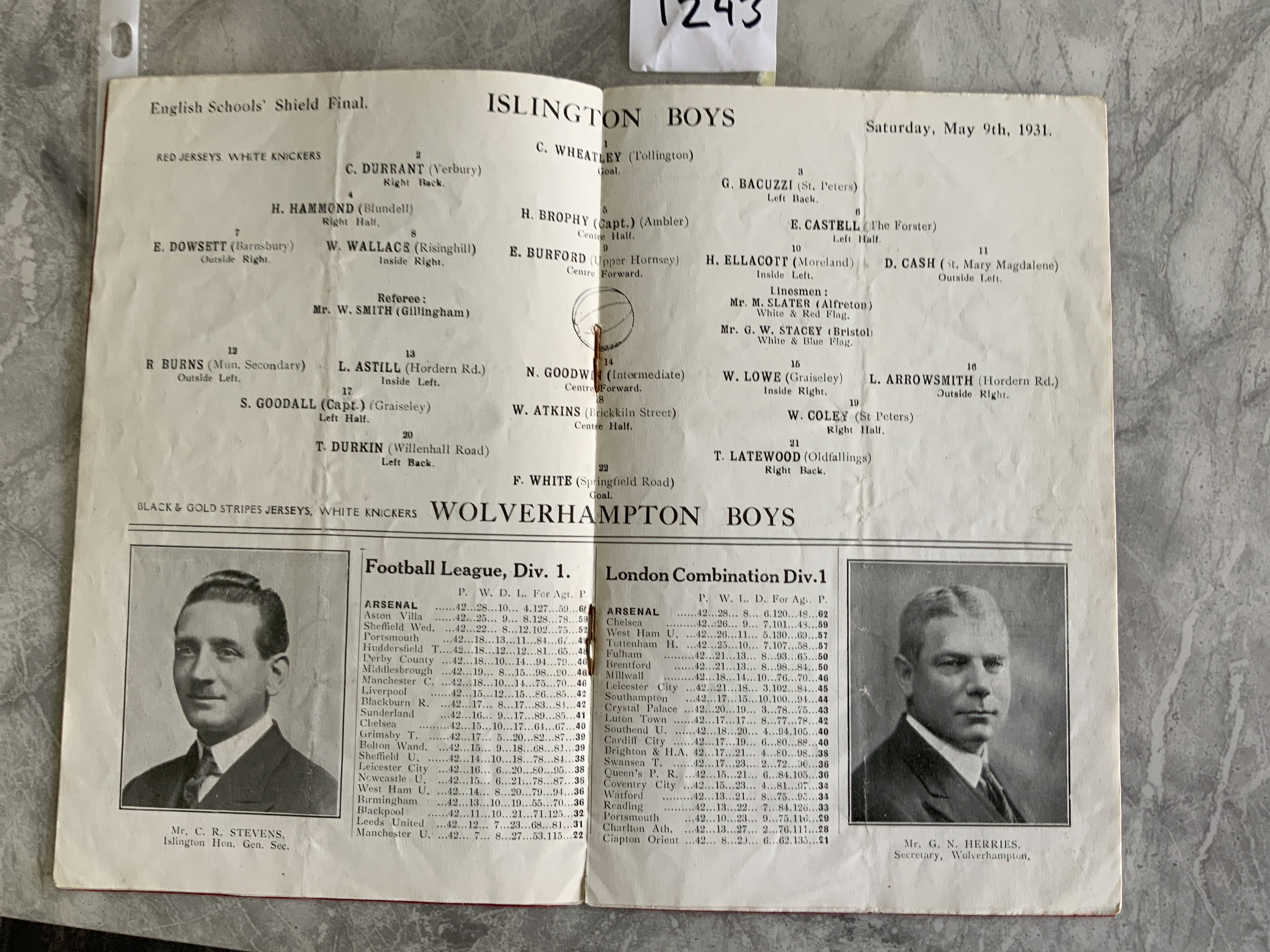 1931 English Schools Final Islington v Wolverhampton Football Programme: Good condition played at Arsenal dated 9 5 1931. No team changes. Light fold.