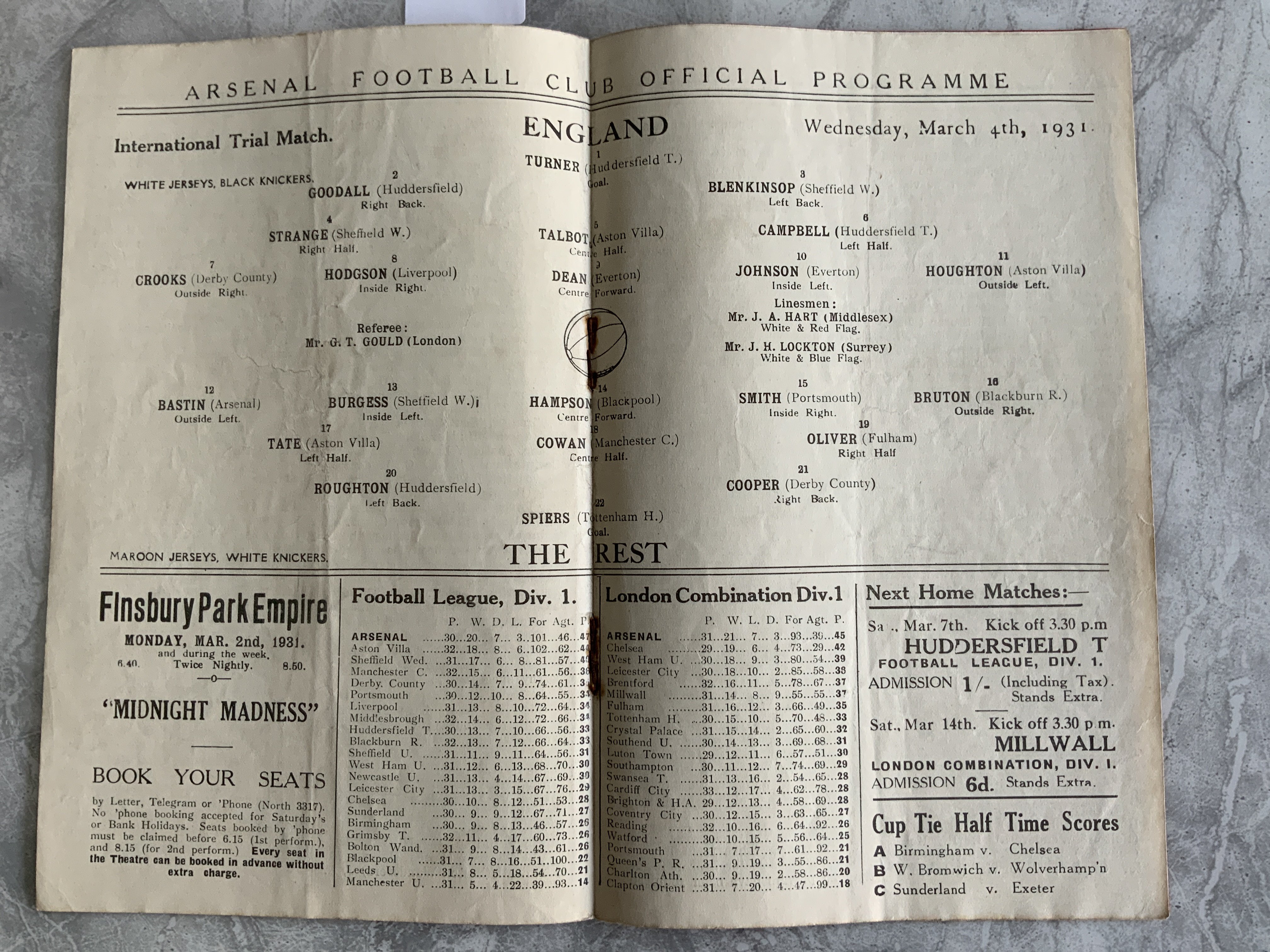 1931 England Trial Football Programme: England v The Rest. Good condition played at Arsenal dated 4 3 1931. No team changes. Rusty staples holding firm.