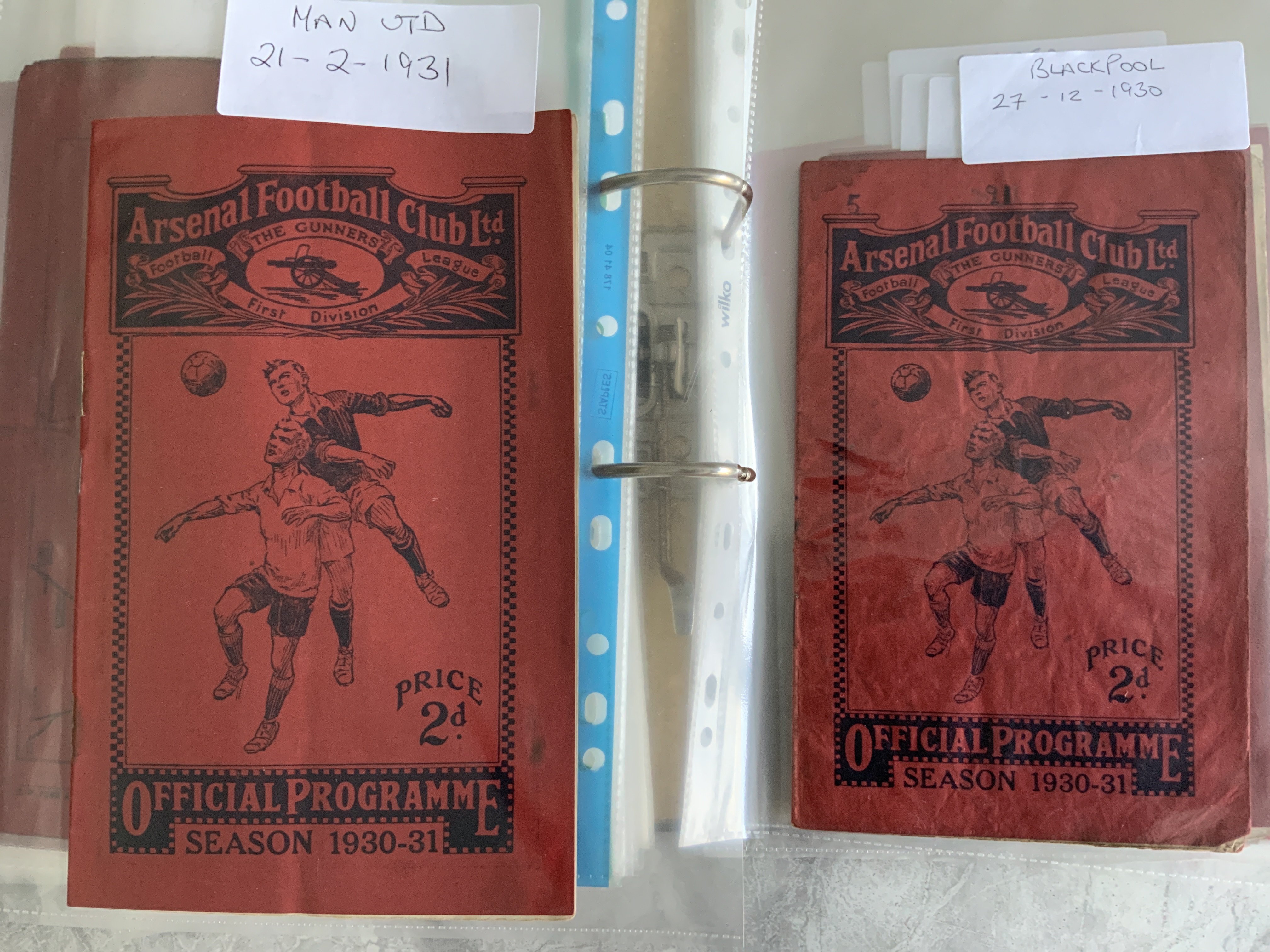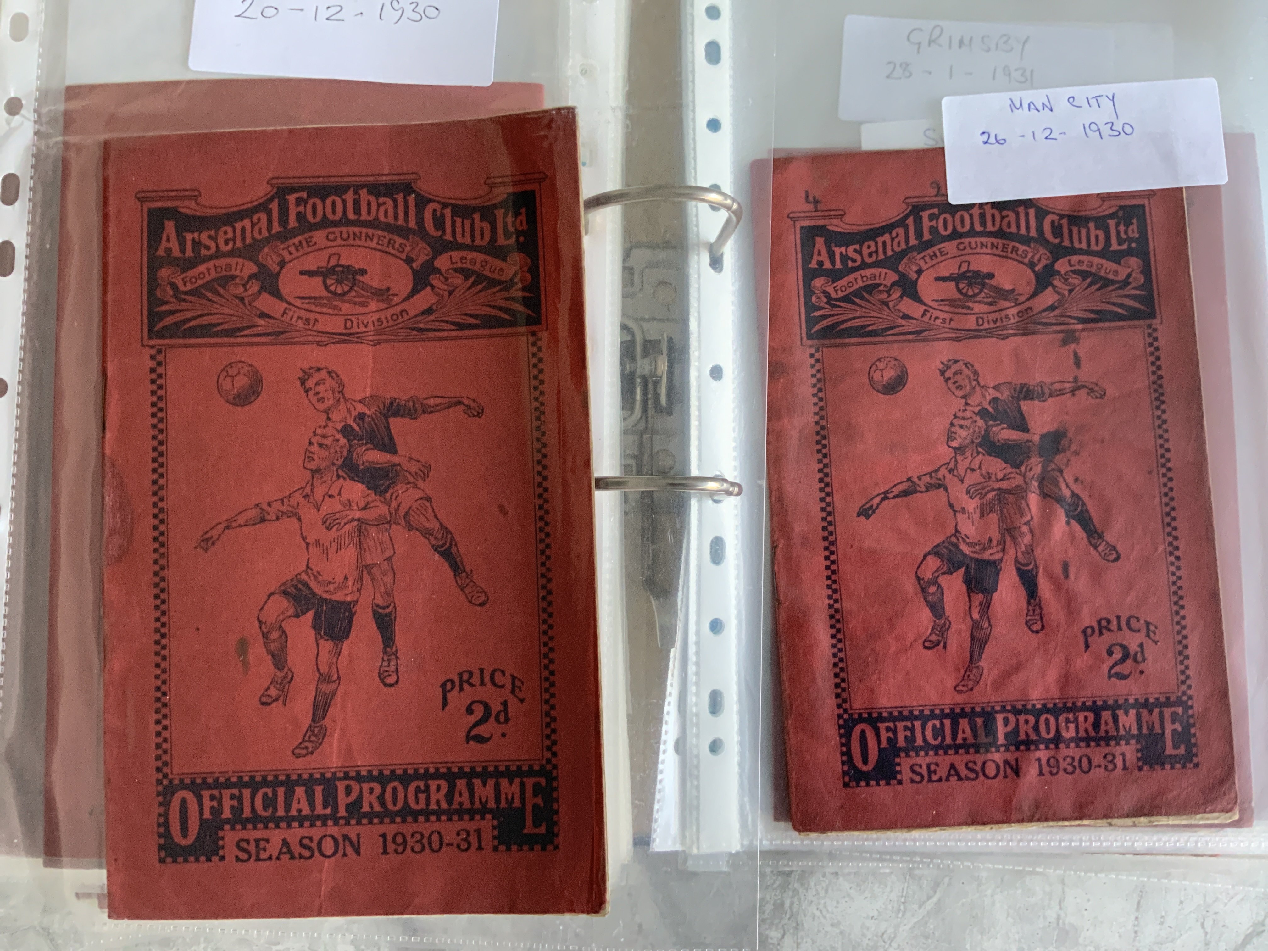 Arsenal (Champions) 1930 - 1931 Complete Home Football Programmes: Very good condition home programmes. Includes Leeds Blackburn Leicester Sheffield United West Ham Aston Villa Middlesbrough Grimsby Abandoned 6/12 Postponed 10/12 Played 28/1 Newcastle Manchester City Aston Villa FA Cup, Sunderland Birmingham Derby Manchester United Blackpool Huddersfield Sheffield Wednesday Chelsea Portsmouth Liverpool Bolton. Complete of all 1st team league and FA Cup. (25)