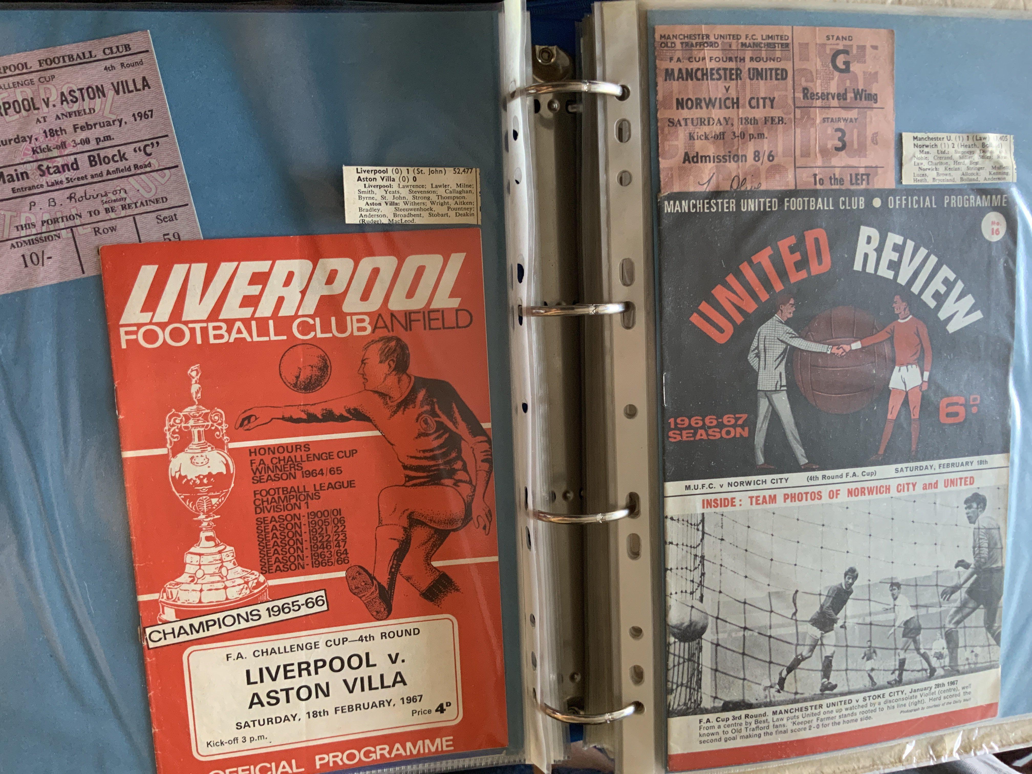 1966 - 1967 Complete FA Cup Football Programme Collection: Complete from the 1st round right through to the final of all programmes. Folders of qualifying matches included but not known if complete. Suit Tottenham or Chelsea collector. Neatly displayed in 7 large binders. Some have match reports and tickets. Must view due to quantity of tickets, Eve of Rally menu newspapers and more. (est 350 programmes)
