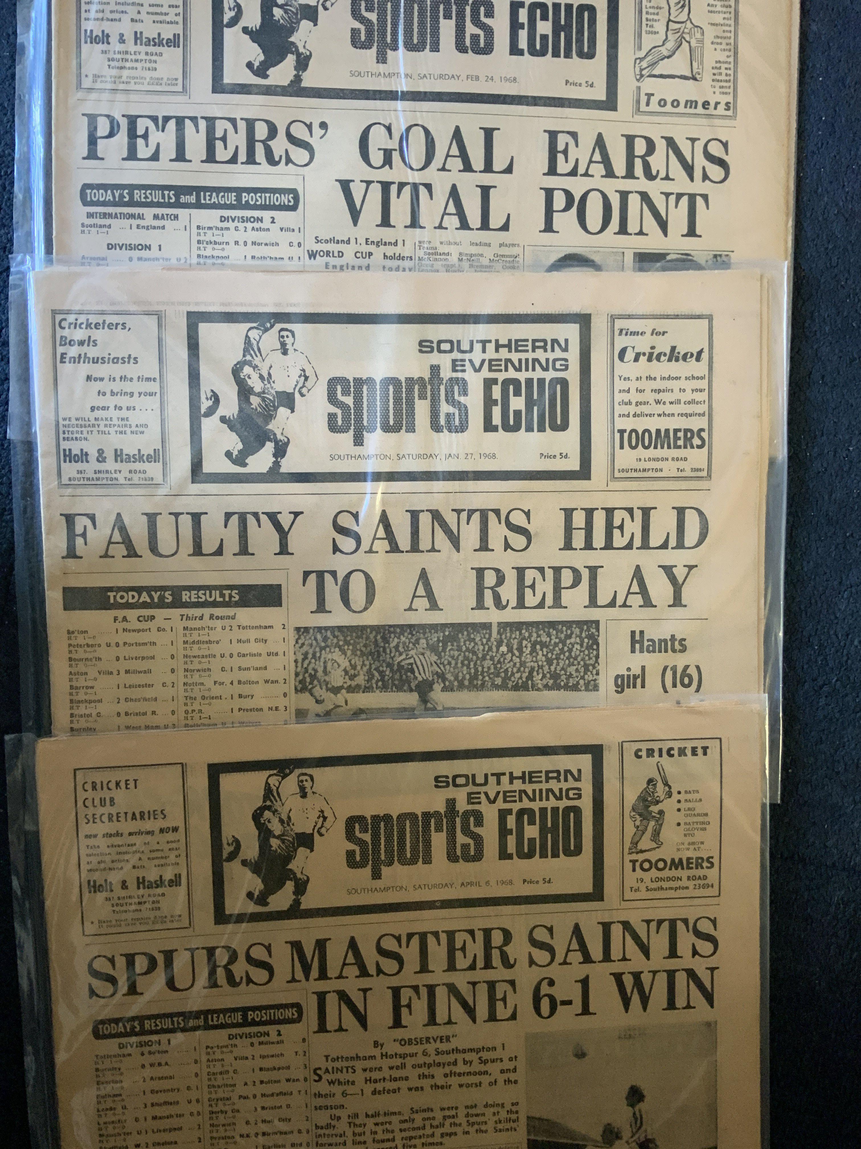 Southampton 1960s Sports Echo + Scrapbooks: Quantity of complete Sports Echo mainly from the late 60s. Lot of scrapbooks with stuck down autographs and tickets. Must view. (large box)