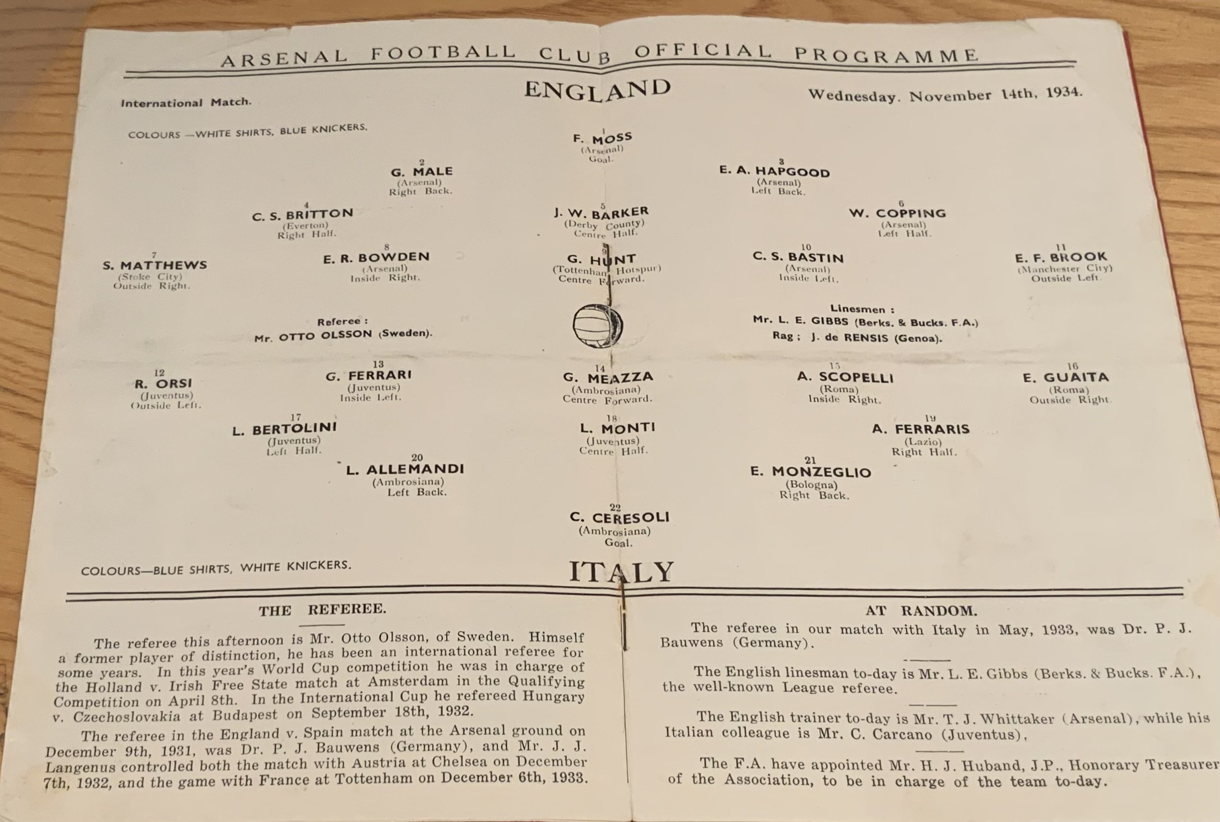 1934 - 1935 England v Italy Football Programme: Full International played at Arsenal. Slight imperfections to cover and page 3. International match dated 14 11 1934. No team changes. Good.
