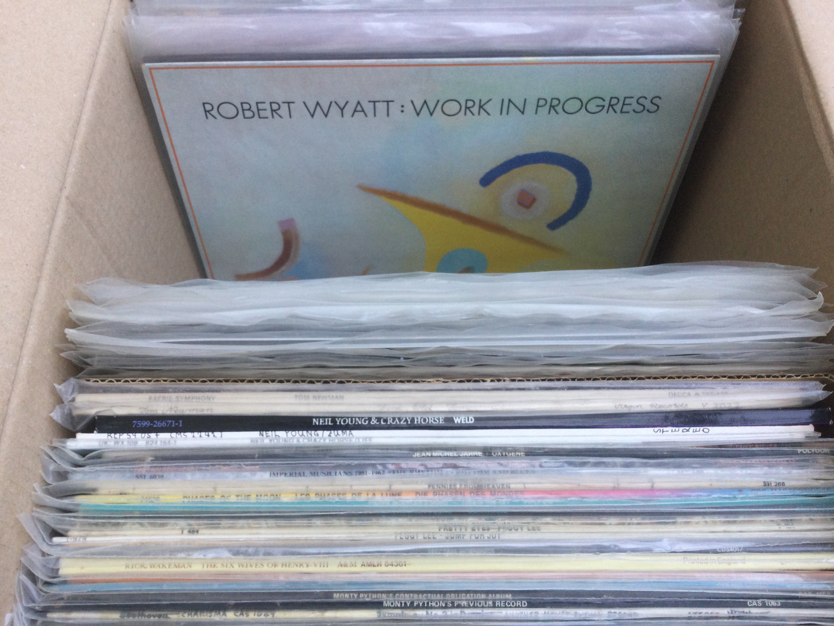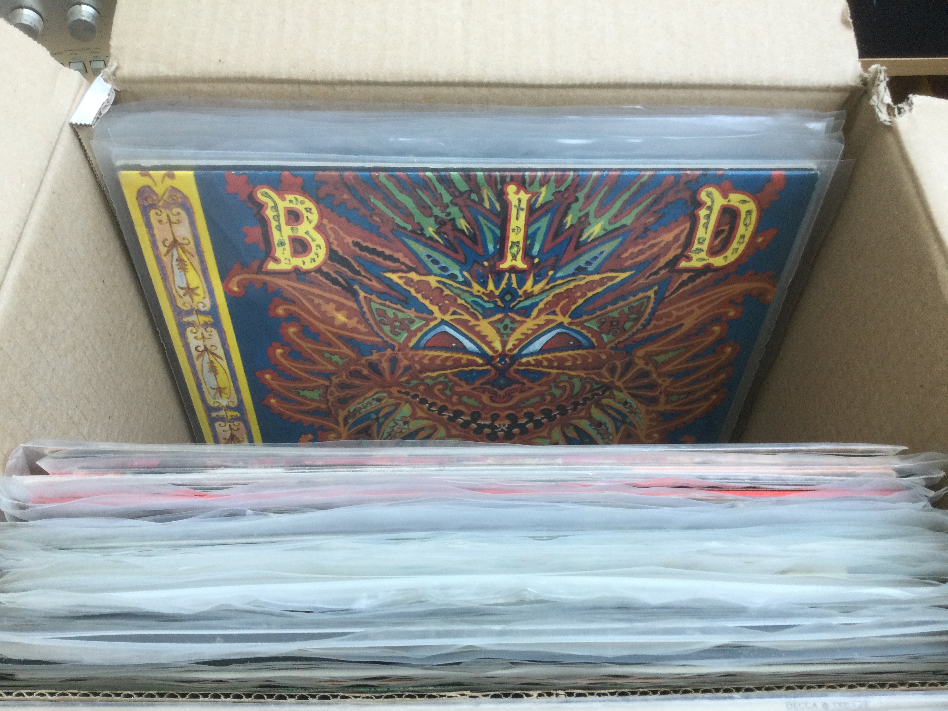 A box of LPs and 12" singles by various artists including Kate Bush, Sugarcubes, Neil Young and many more.