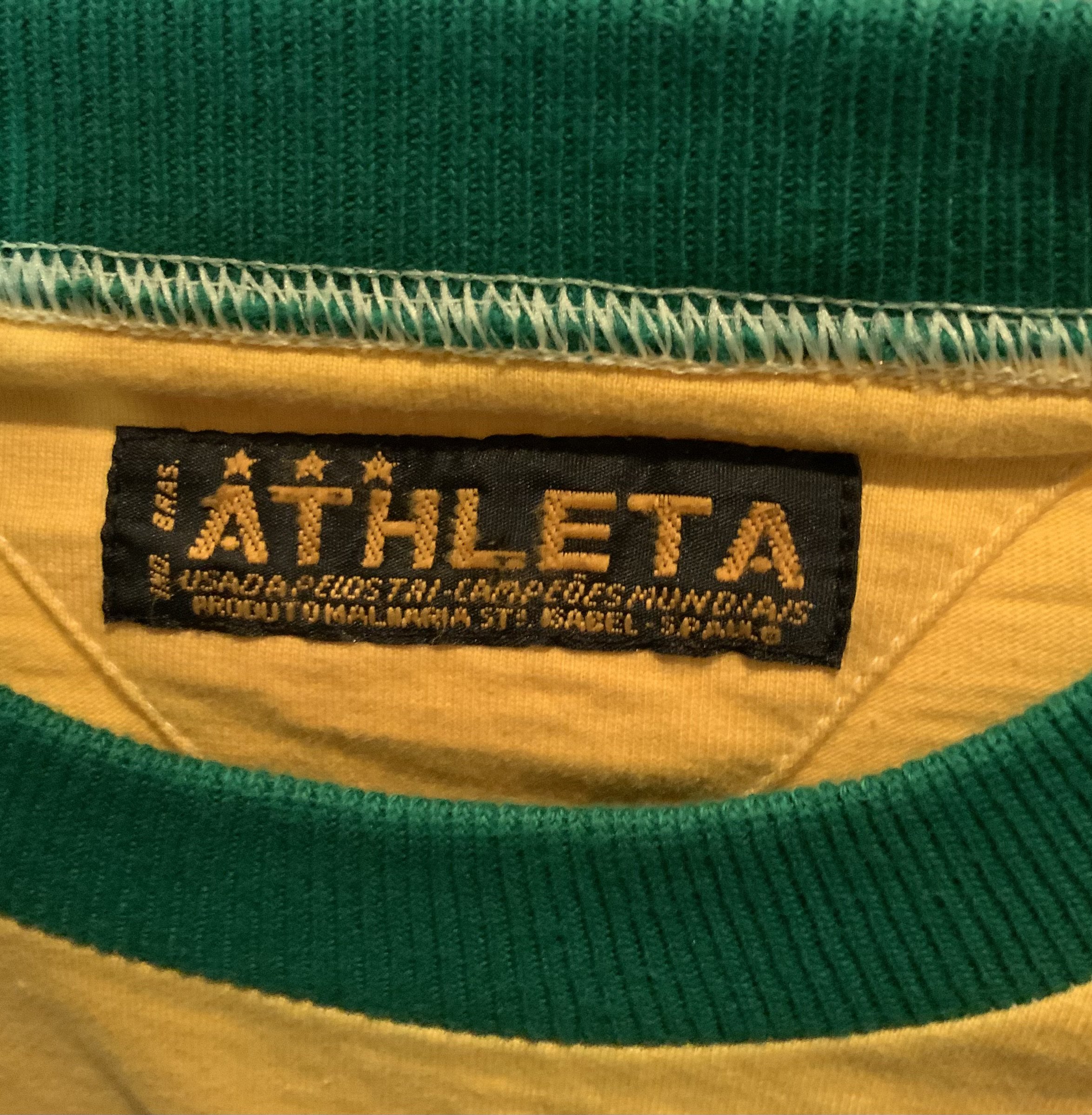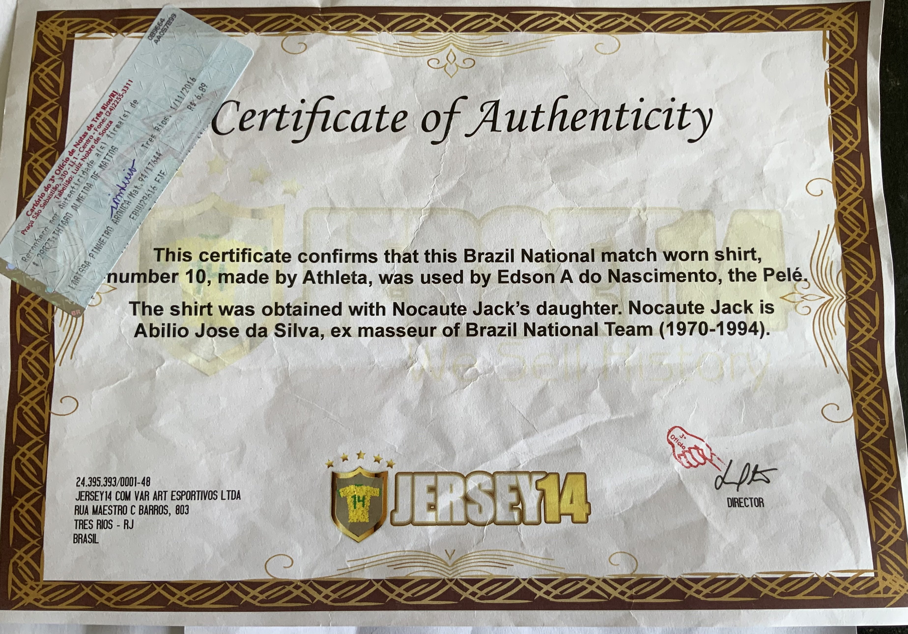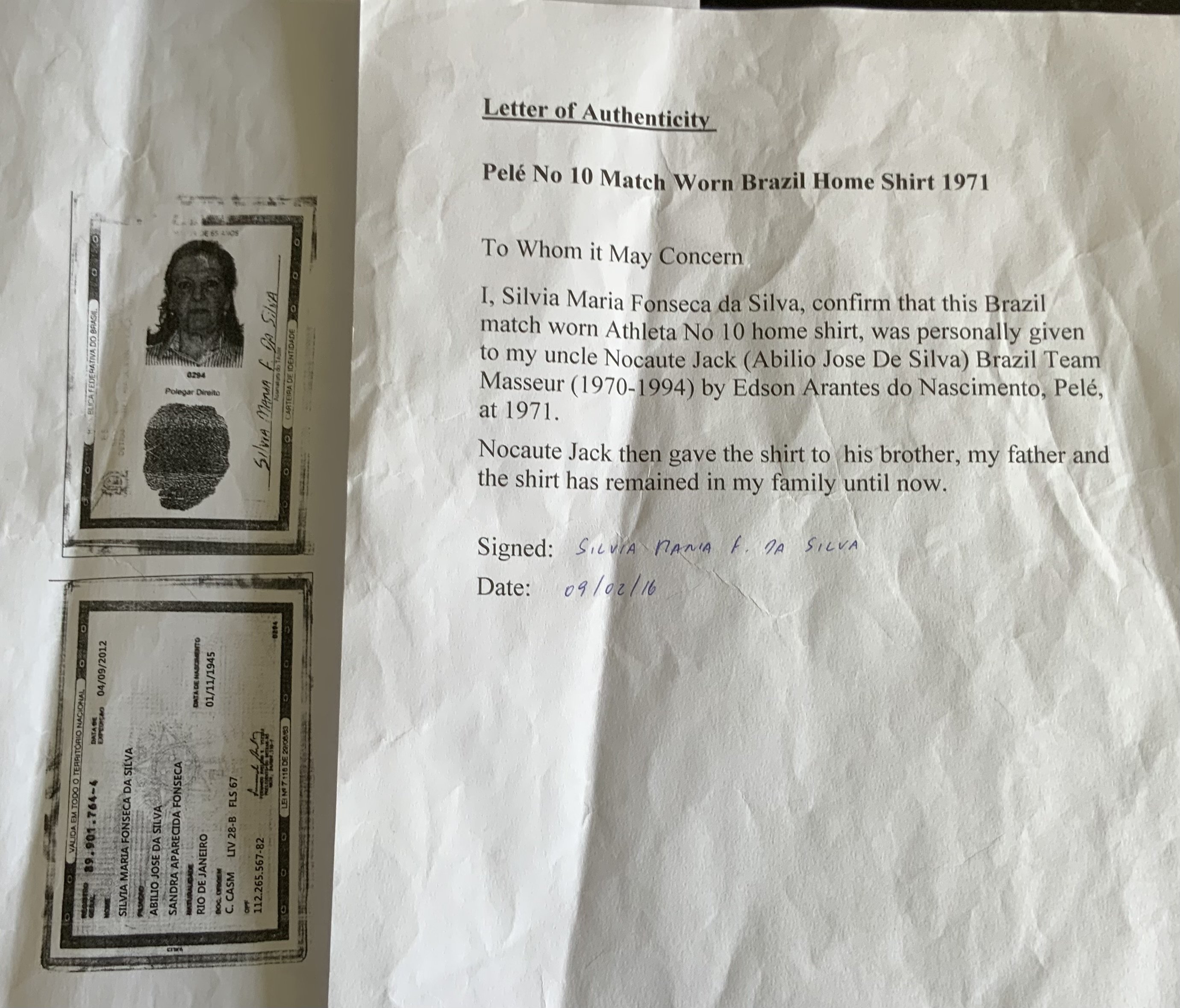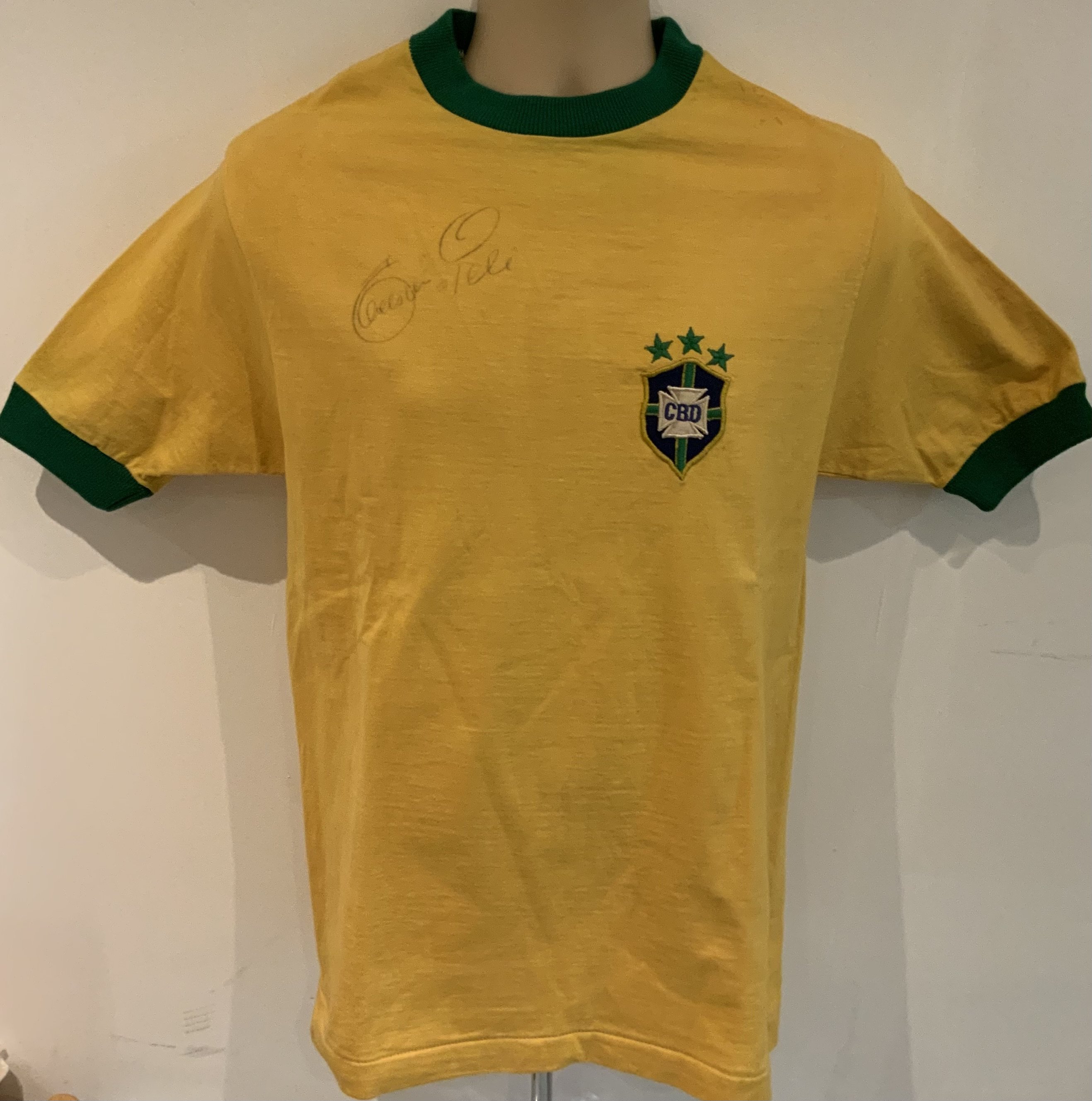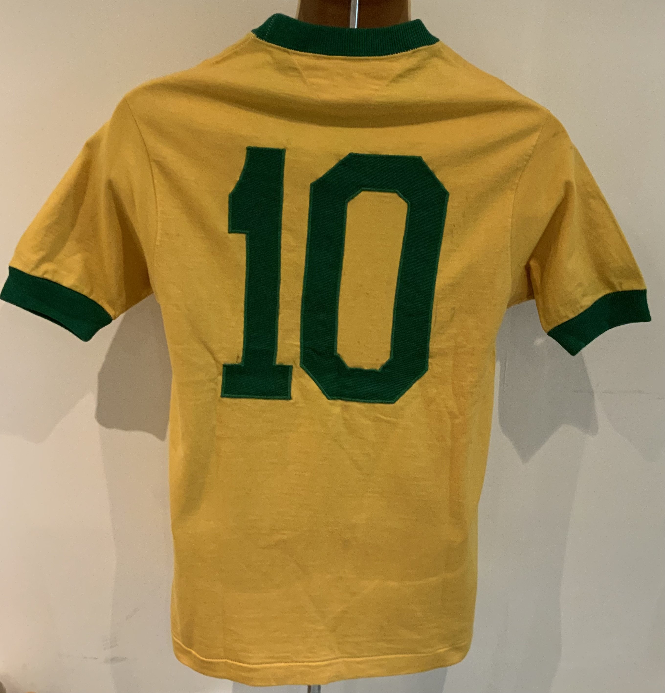 Pele 1971 Signed ( Match Worn ) Brazil Shirt: Yellow number 10 shirt sleeve shirt signed with Peles full signature to front. Made by Athleta. Label stitching on number badge and autograph look original. COA from source in Brazil which states this came from the masseur. Photo identification of original seller from Brazil. We have asked an expert at gamewornfootballshirts and whilst the shirt is original and has all the credentials to be a shirt from that period they inform me even with this paperwork they do not ever accept coas from South America and the seller from Brazil has sold previously similar items for tens of thousands. For that reason this shirt is to be sold by us as a signed original shirt from the period only and not match worn.